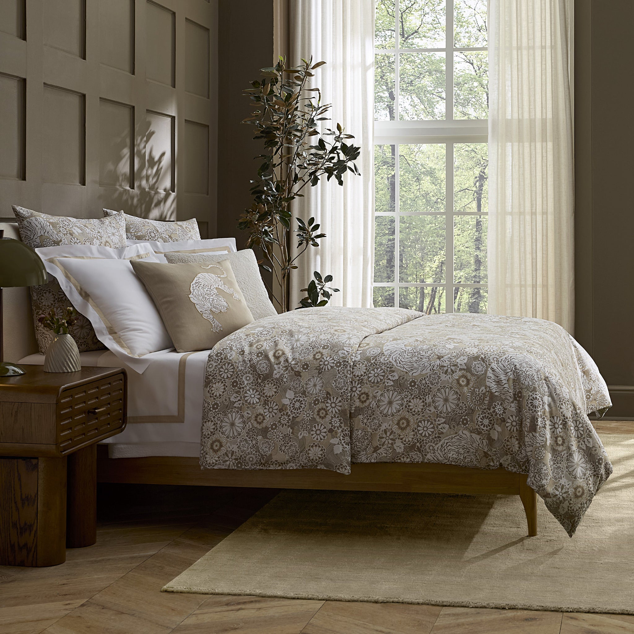 Mystical and mesmerizing, the dreamy Siberian Tiger motif prowls through a lush garden of stylized florals, its presence felt in both moonlight and sunlight. A design which evokes wild elegance and vintage charm. SFERRA has applied this stunning best-selling motif from Scalamandre to a beautiful new bedding collection by the same name, woven into an Italian printed, long-staple sateen. The Siberian Tiger’s quiet power and cinematic flair suggest tales of the Far East, whispered legends, and the velvet hush of twilight. A reversible print, on one side each tiger moves with intention, surrounded by blooming botanicals that echo the mystery of the jungle and the poetry of the past, the other side a flourishing tapestry of delicate blooms, where nature’s symphony plays in harmony.