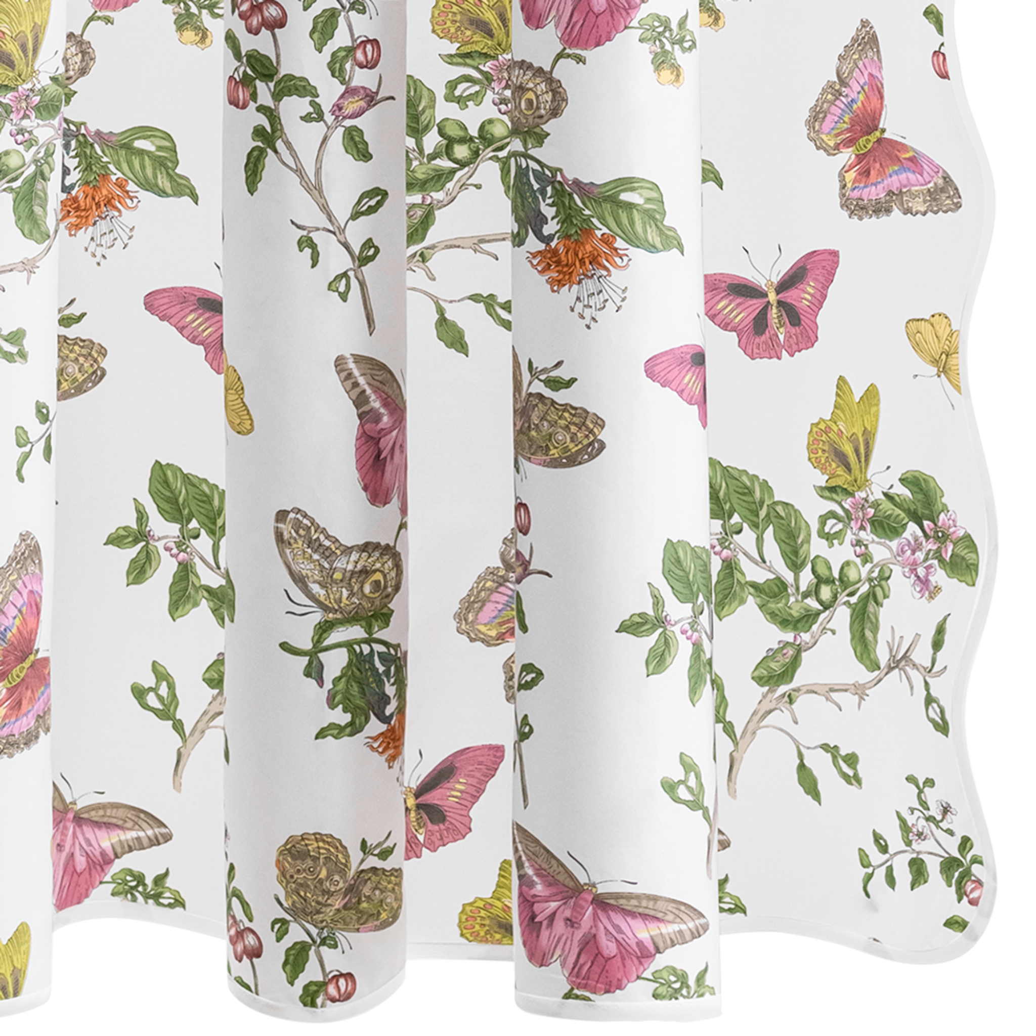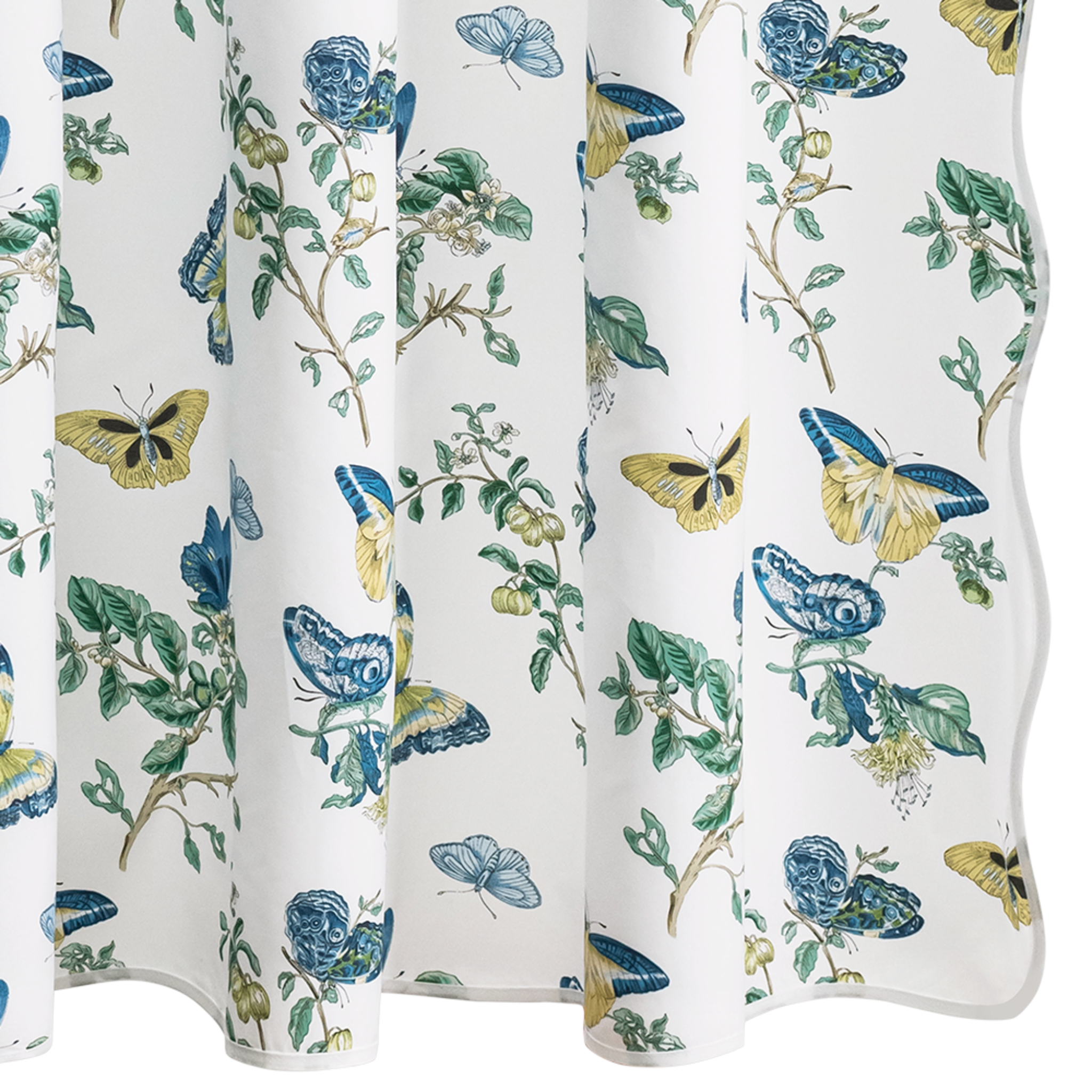 This delightful Matouk Schumacher printed shower curtain features a mix of butterfly and botanical motifs that’s elegantly finished with a scalloped trim
