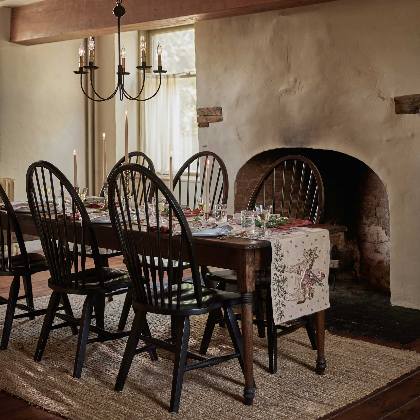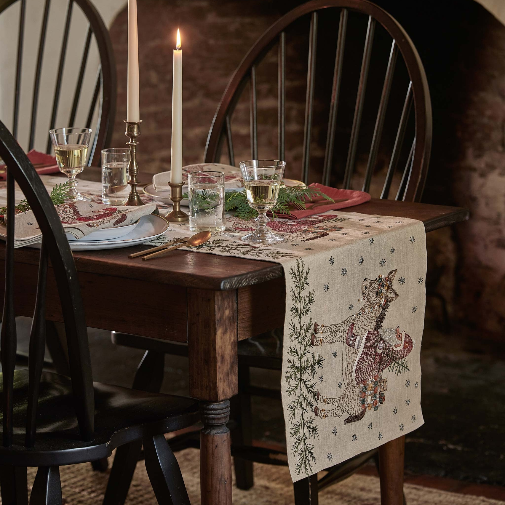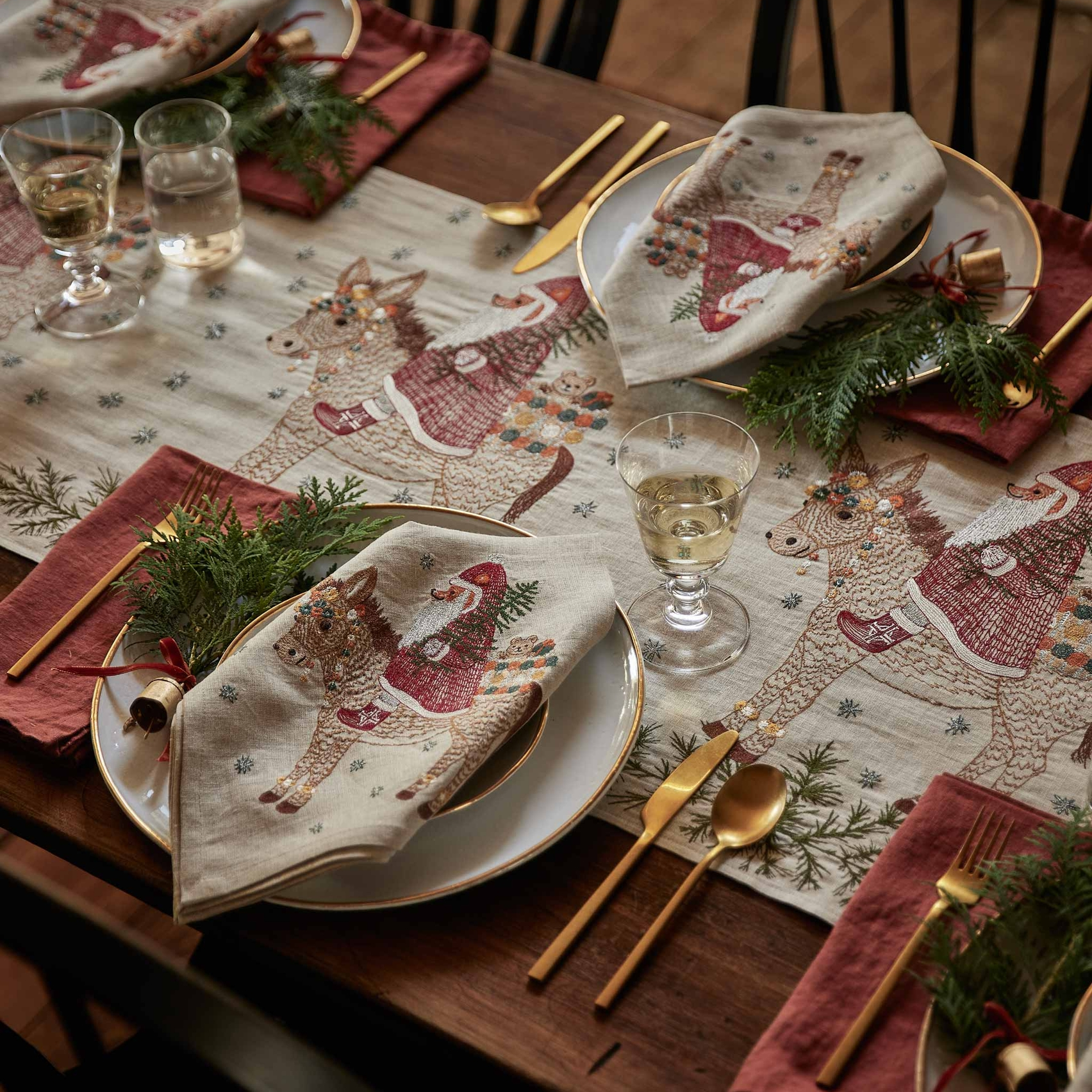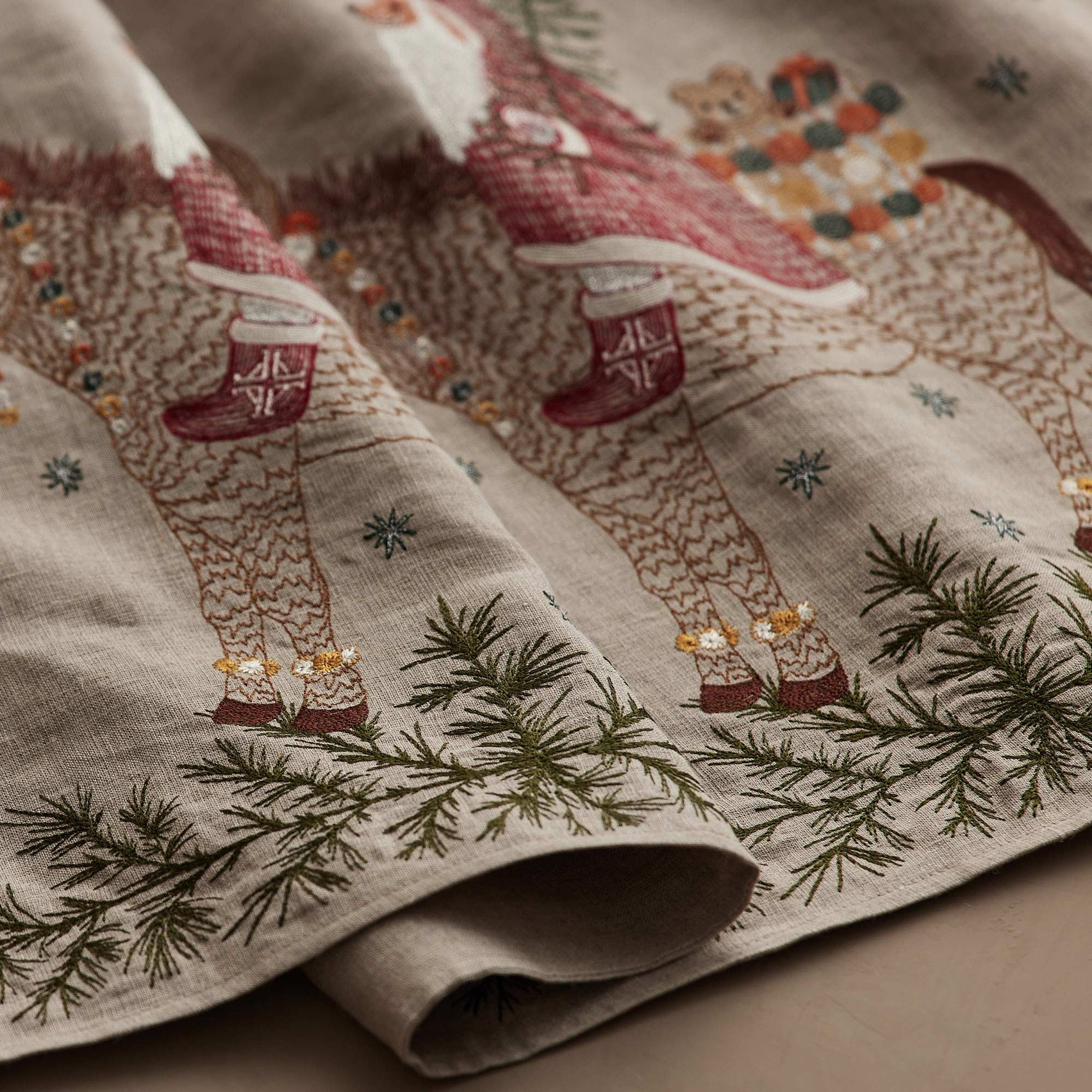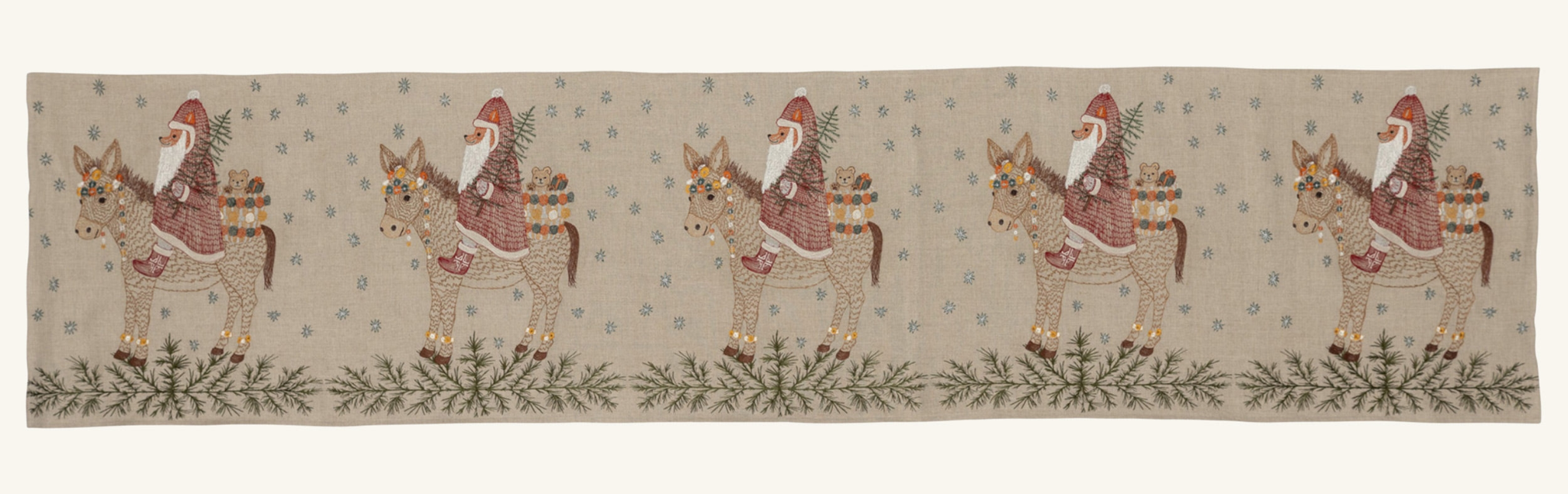 Make way for Santa’s arrival as he rides in on the Christmas Donkey! This season, Fox dresses as Santa with a silver metallic beard, a crimson red cloak, and cozy boots. The Christmas Donkey is adorned in vibrant garlands and helps Santa carry a basket of toys and a Christmas tree as sparkling snowflakes fall around them. Embroidered with glimmering metallic threads and festive orange, marigold, and deep teal accents. Fox’s Santa cloak features unique stitching that resembles a tactile knit texture. Evergreen sprigs decorate the bottom border of the table runner.