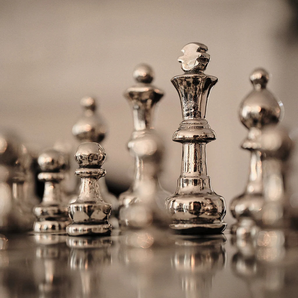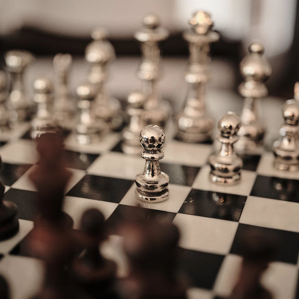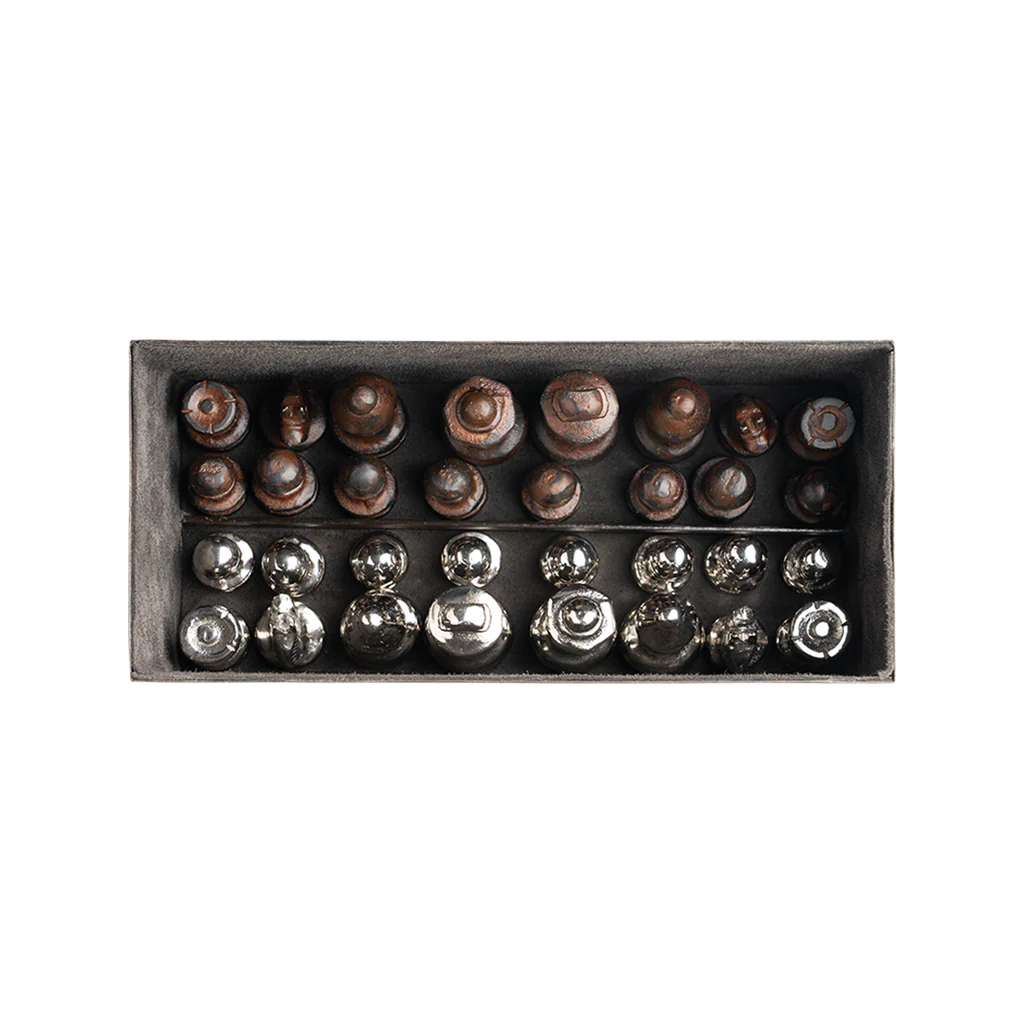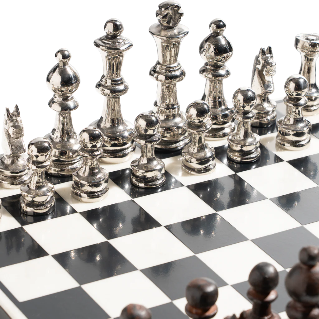 Your move . . . a true collector's item . . . handsome marble chess board with removable iron base. Cast iron chess pieces in both natural and nickel-plated finish. Suede lined iron box to store pieces is included . . . let's play!