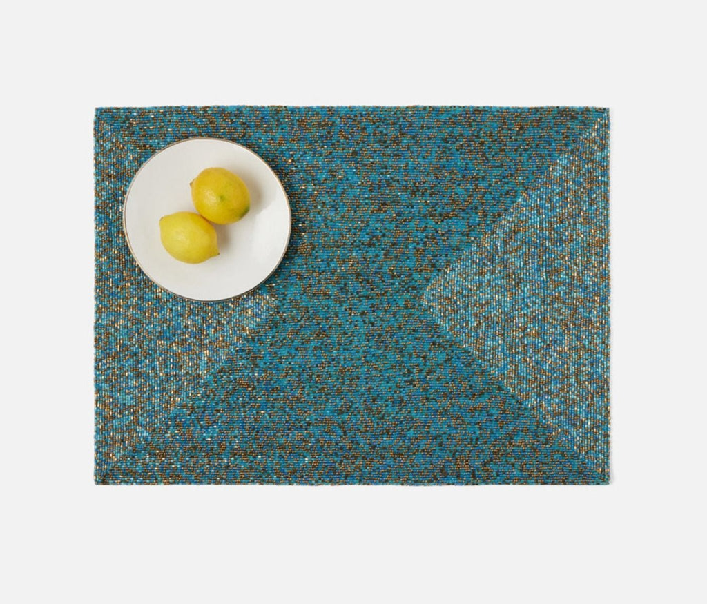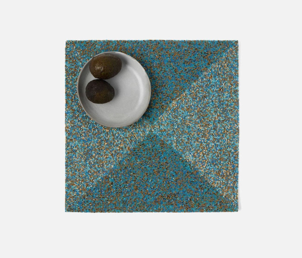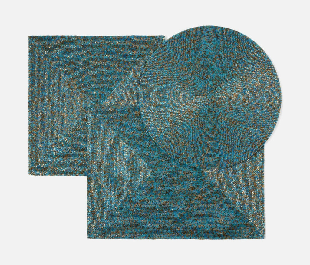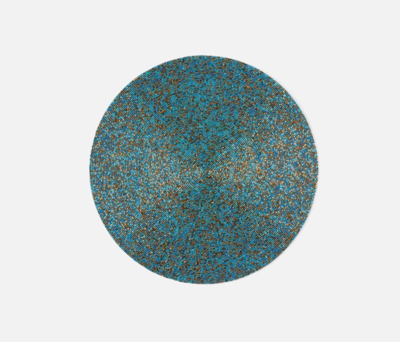 • Coil strands of thousands of turquoise and gold beads creates a placemat inspired by a desert sunset