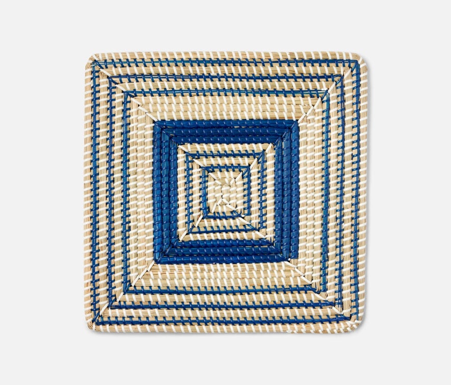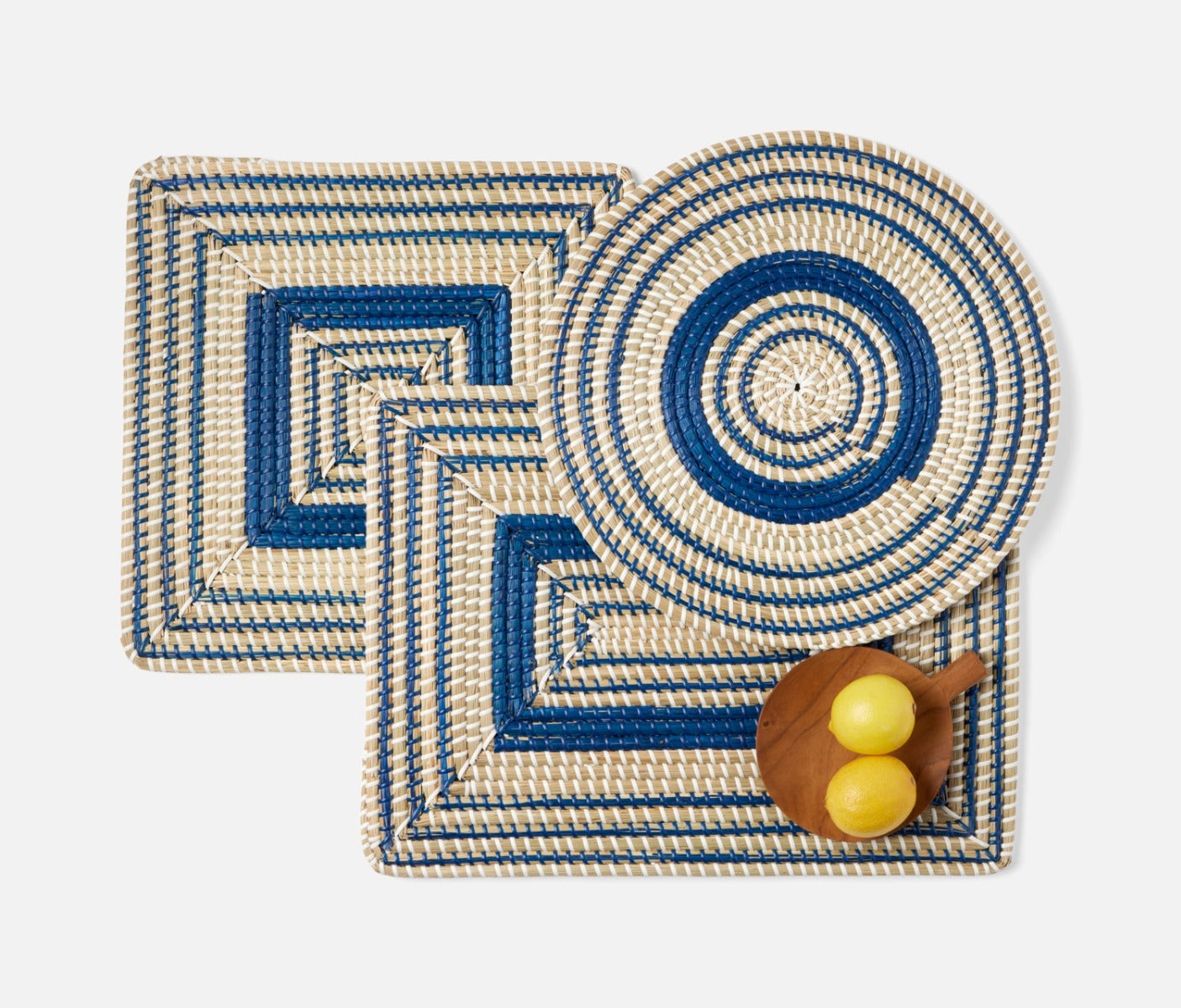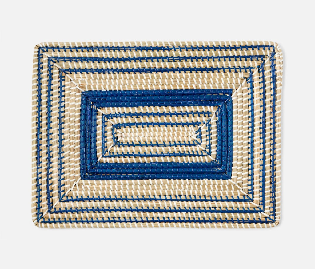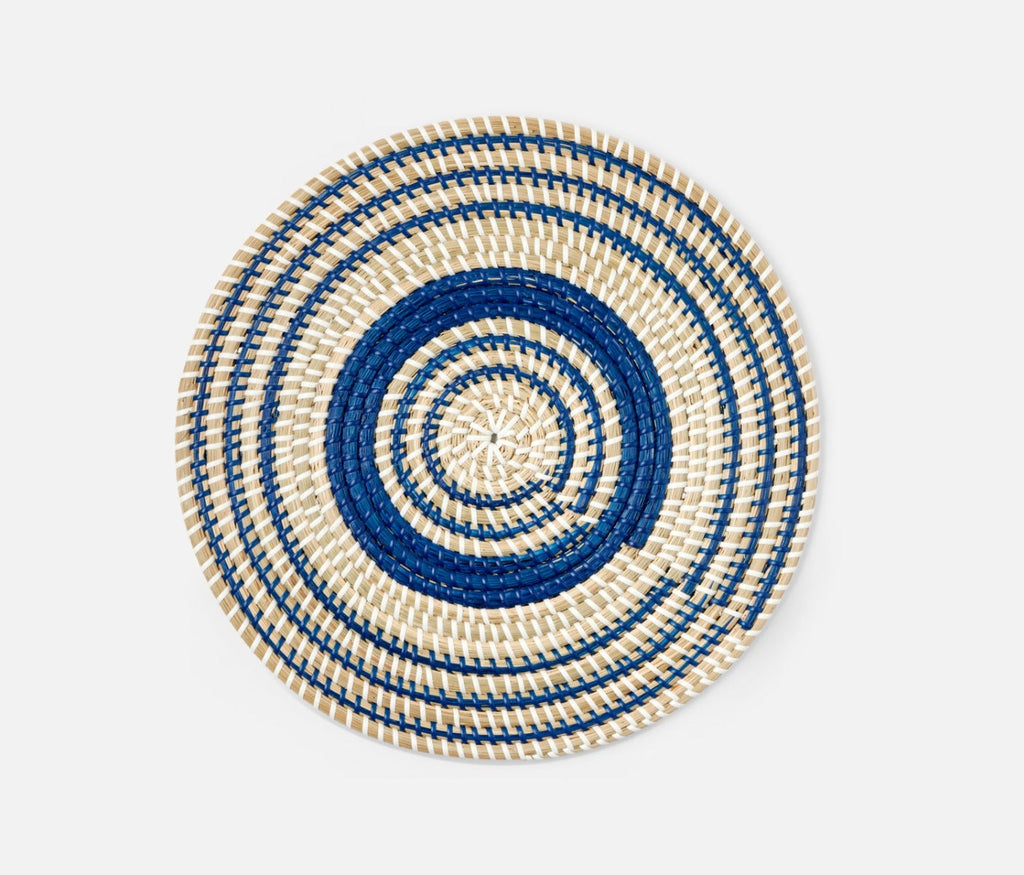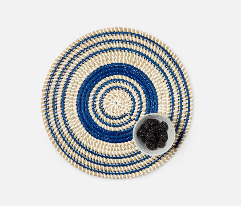 - Natural woven seagrass placemats with contrasting dark blue art deco design in round, square or rectangle shape