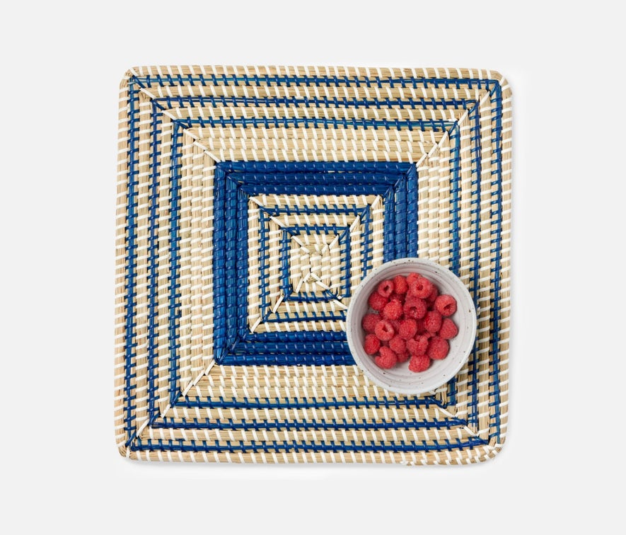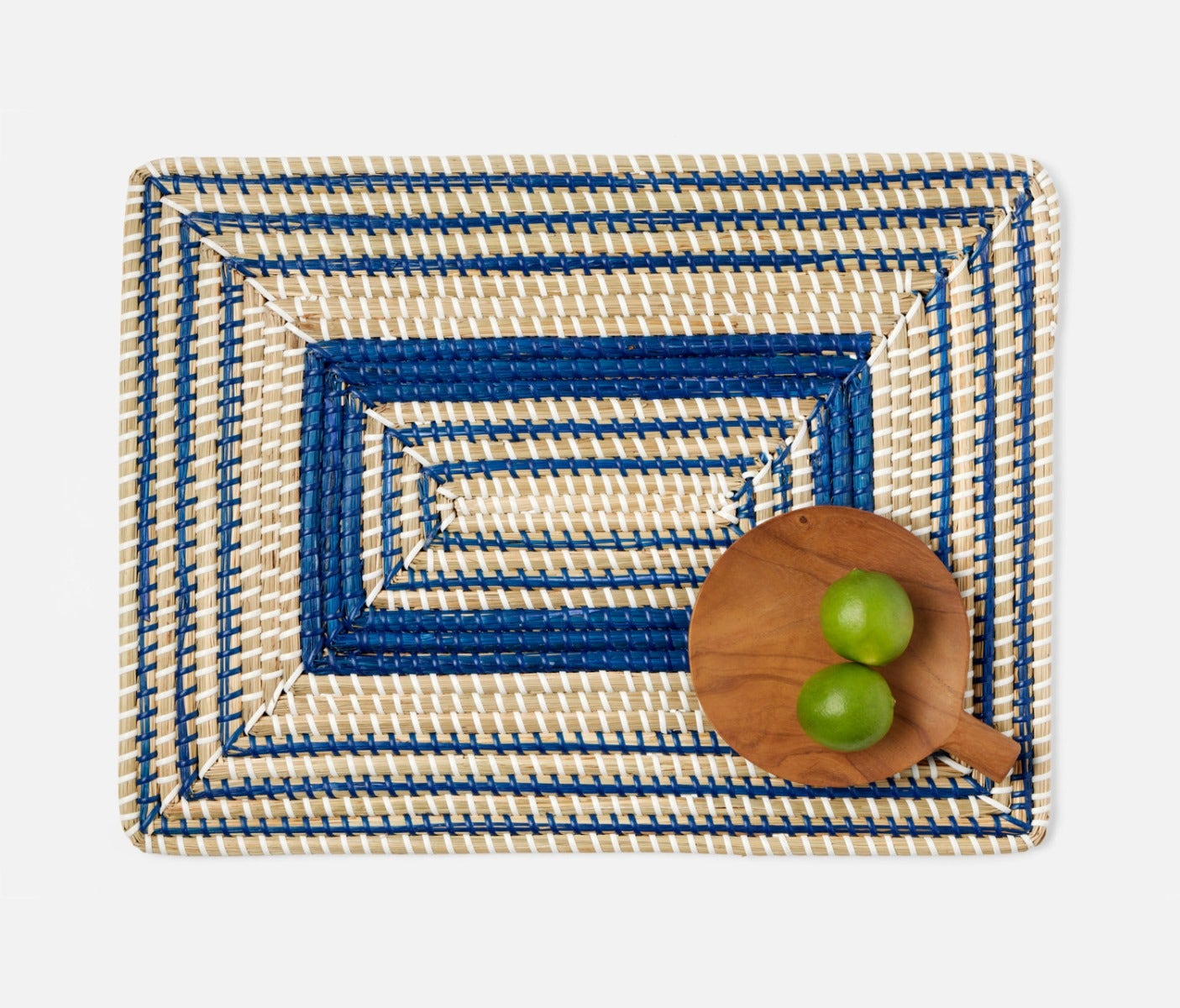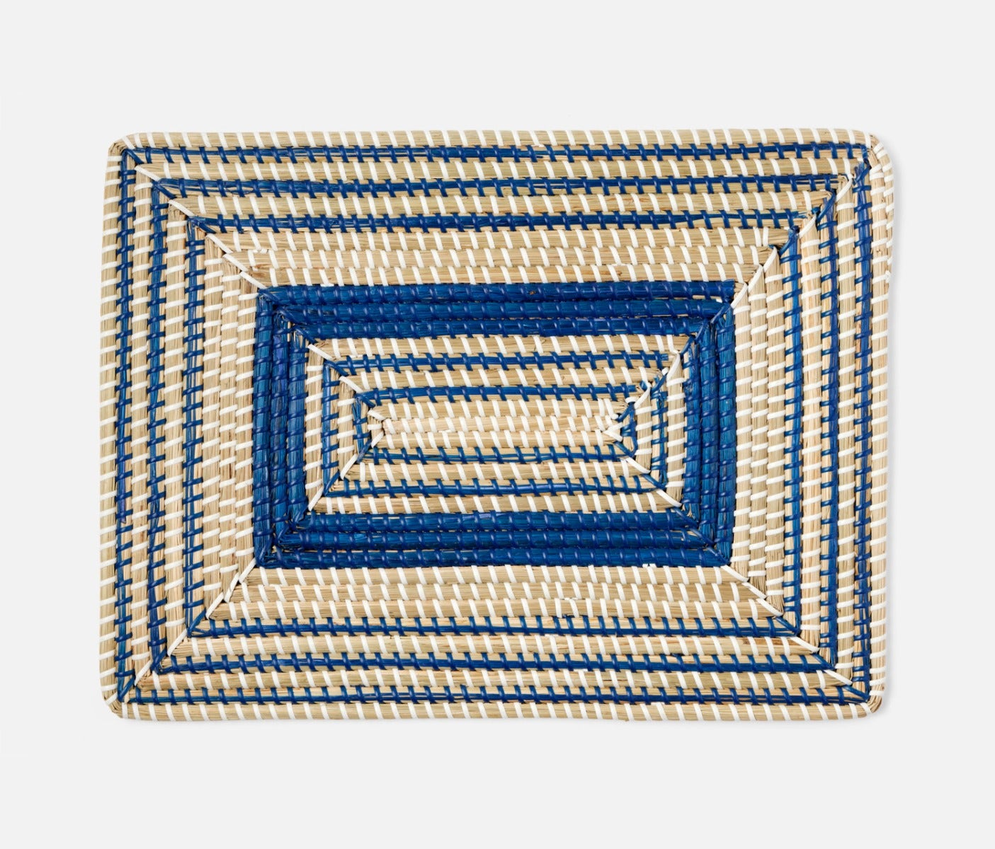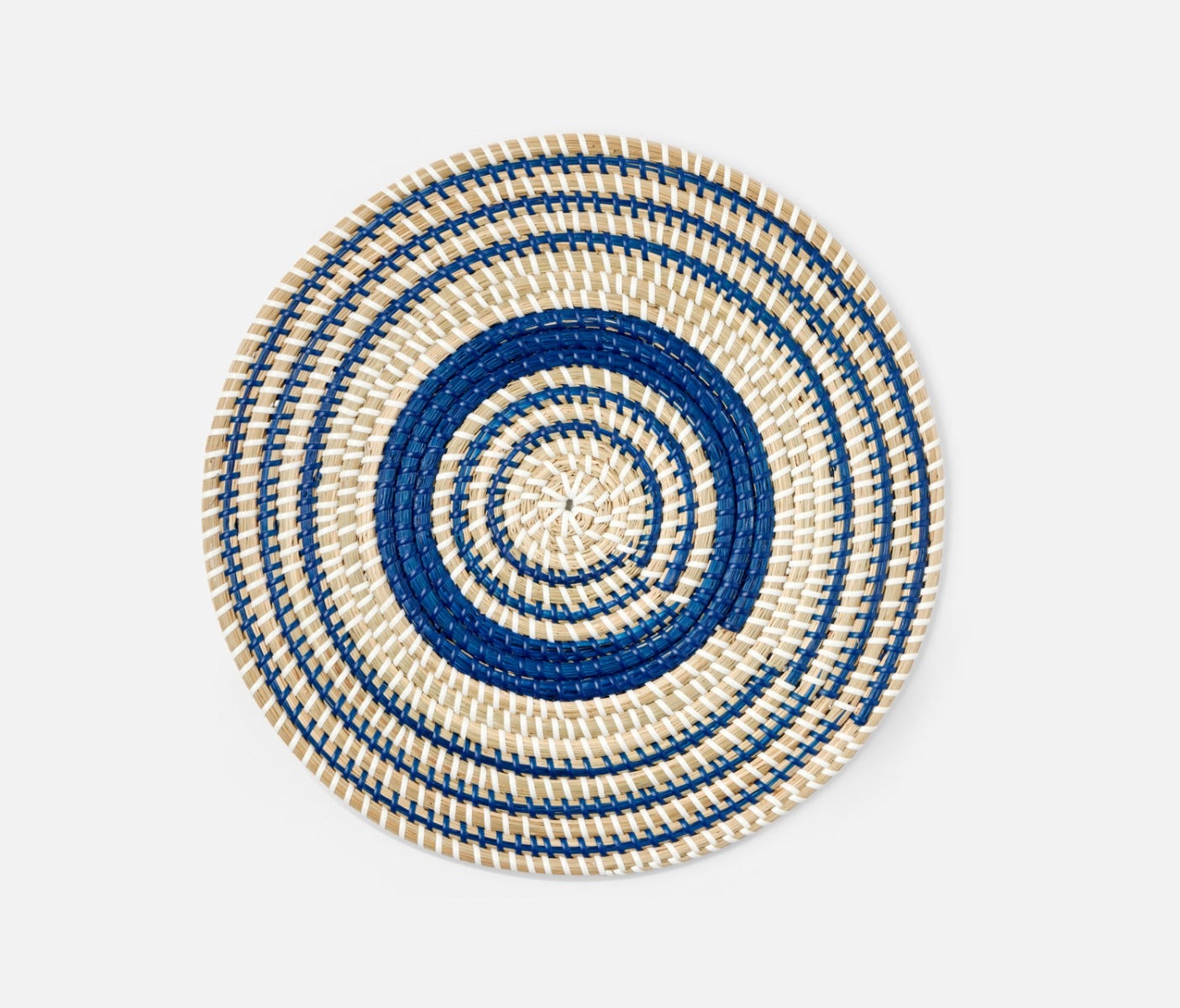 - Natural woven seagrass placemats with contrasting dark blue art deco design in round, square or rectangle shape