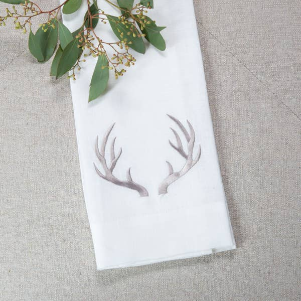 Embroidered antlers on a crisp white linen background. Perfect for a cabin or lake home