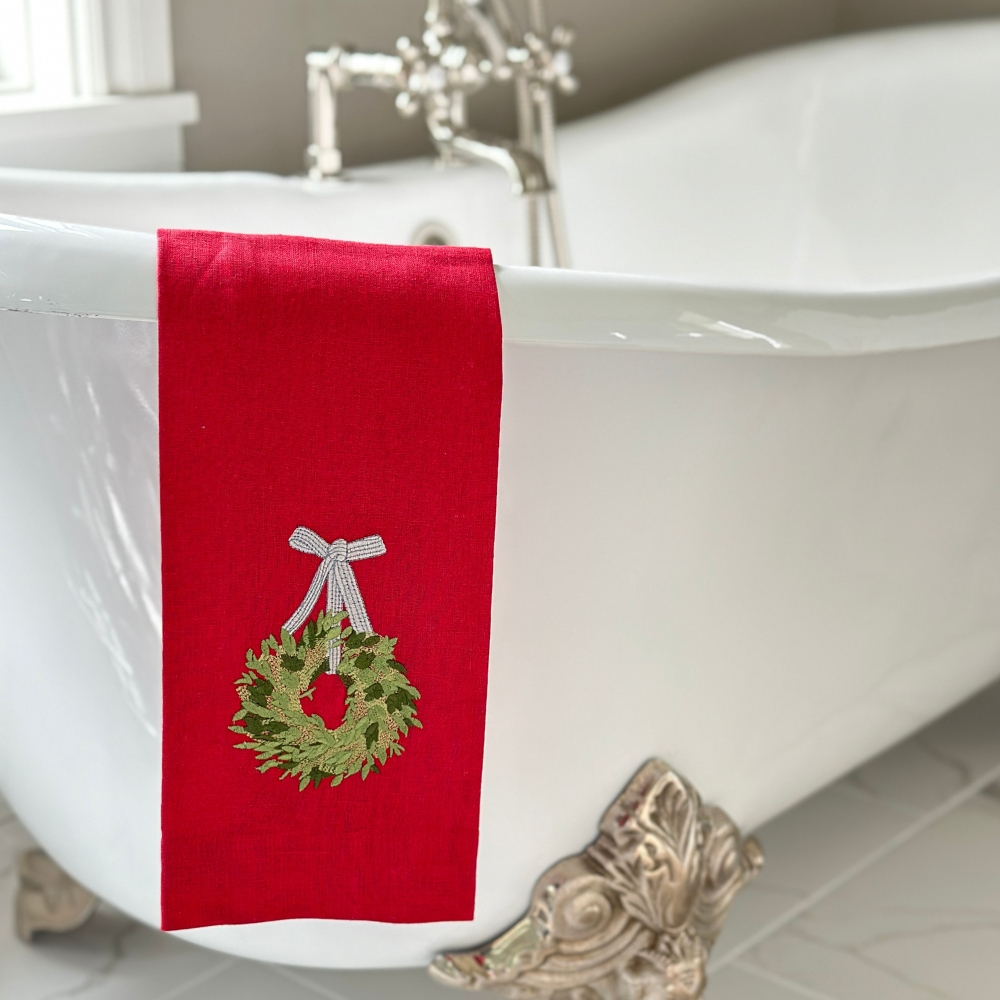 Dress up the kitchen or bath with this beautiful 100% European flax linen embroidered with festive holiday greenery wreath and red ribbon guest towel. So many ways to add beauty to any part of your home.