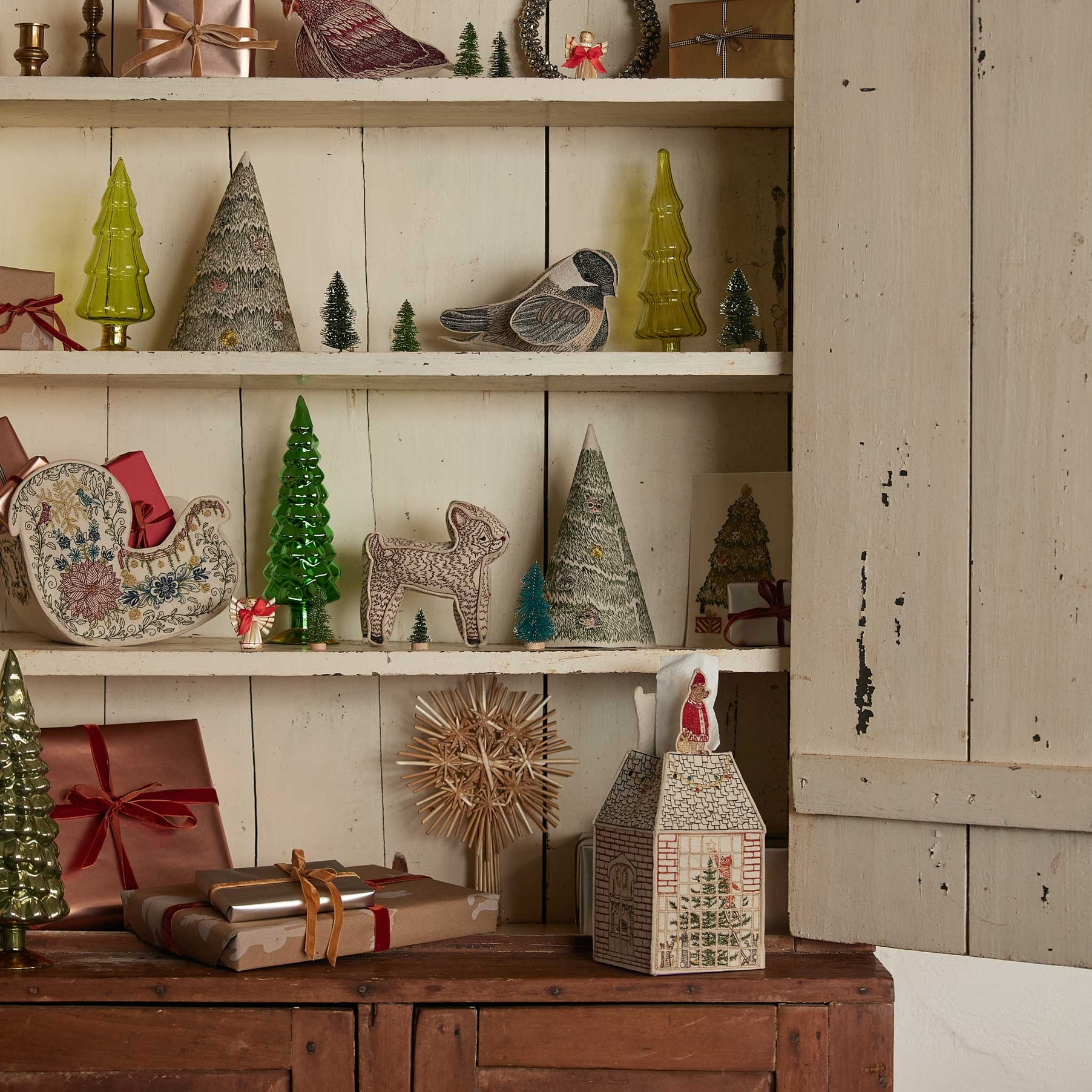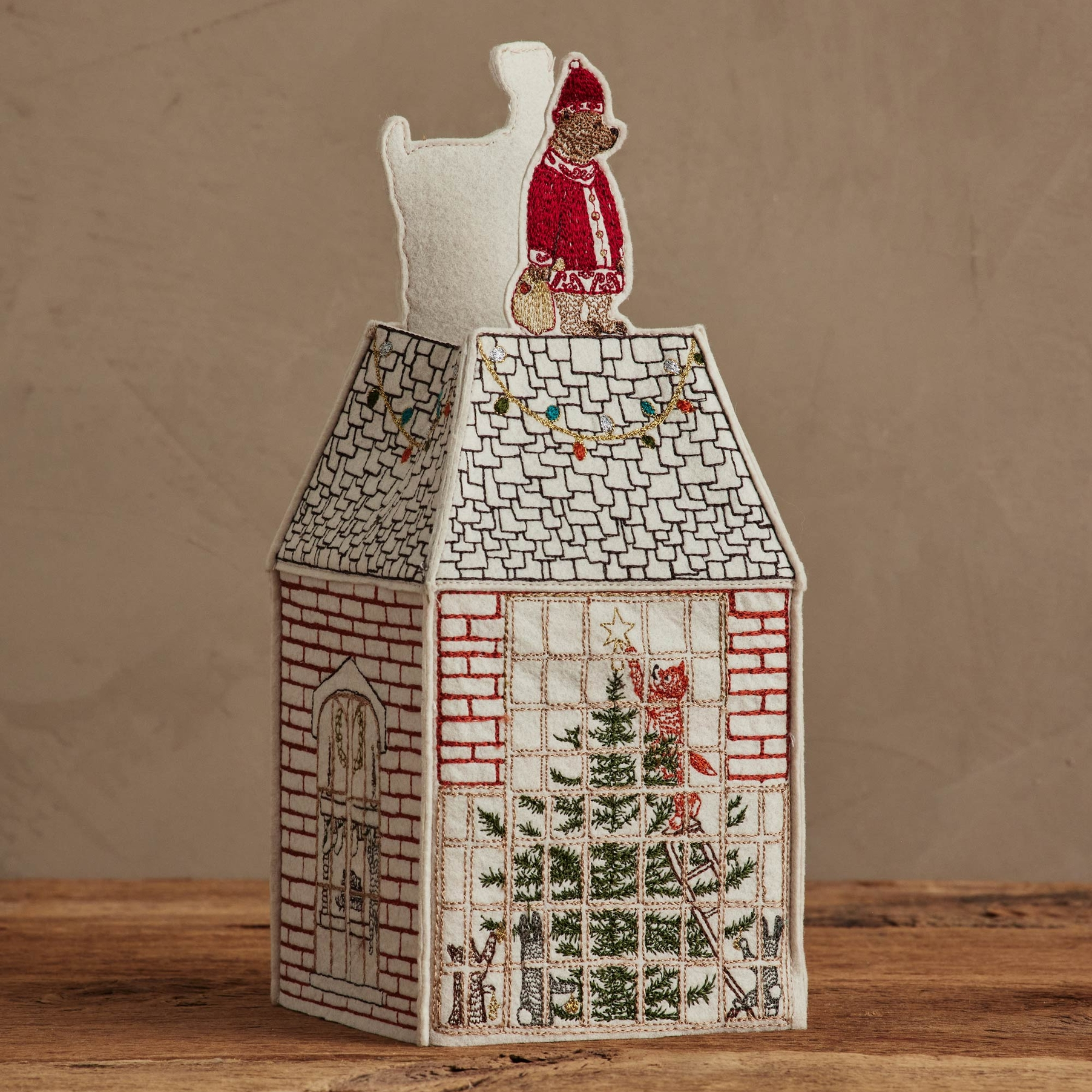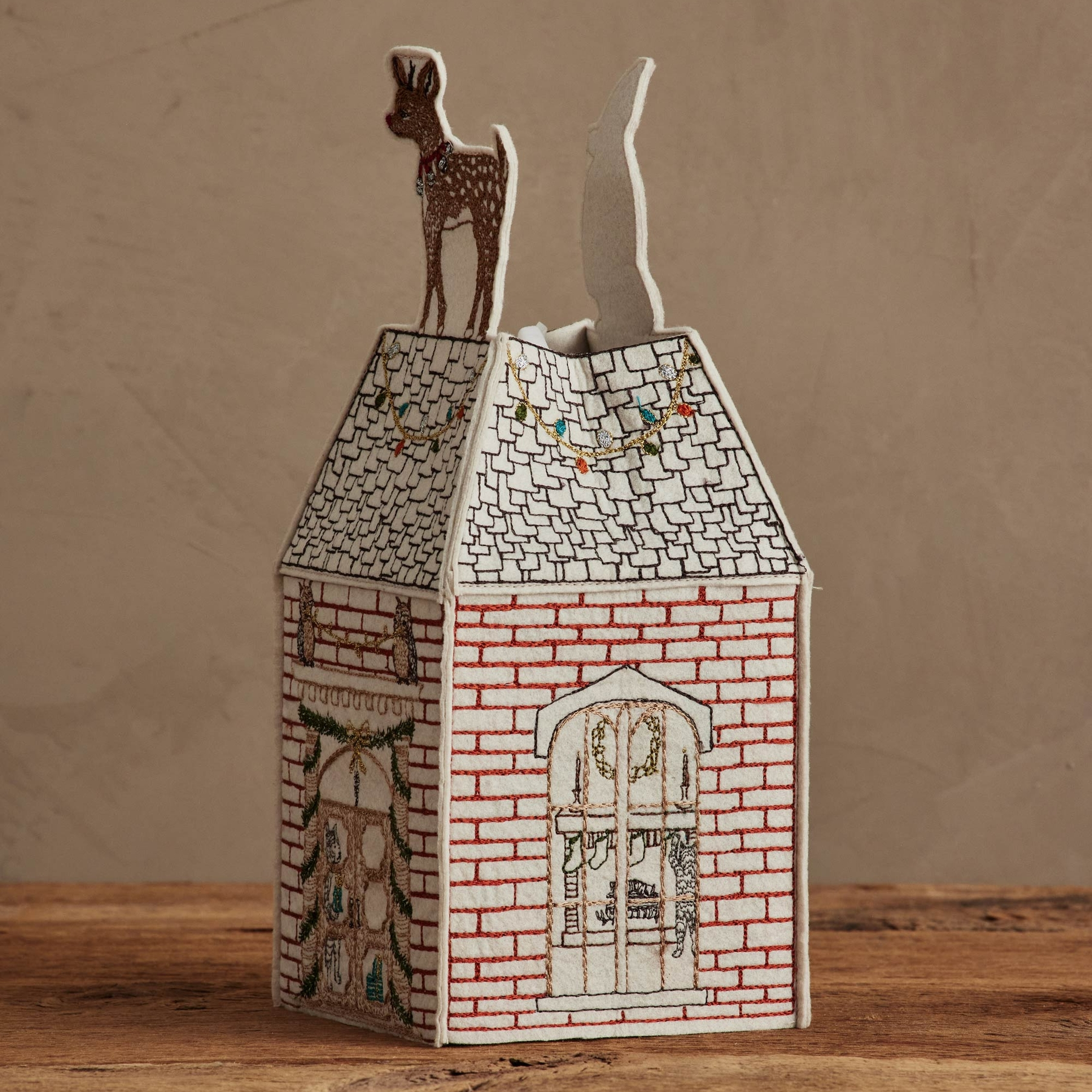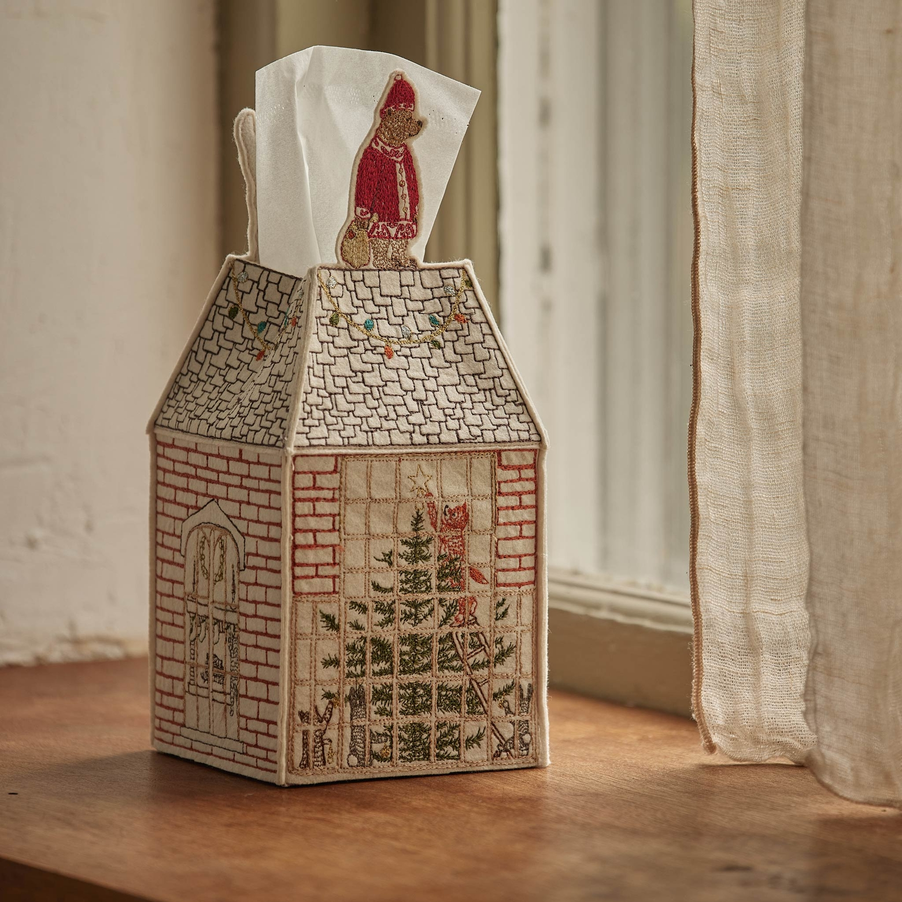 Leave no household object undecorated this Christmas, elevate your tissue box with our Home for the Holidays felt cover. Embroidered on all sides, our tissue box cover depicts a glowing holiday house. Peek inside each window to find fox decorating the tree, bunny setting up the buffet, and a beautiful decorated fireplace. Cat greets us at the door with a wrapped gift. Up on the rooftop find Santa Bear, Rudolph and your tissue as a plume of smoke from the chimney!