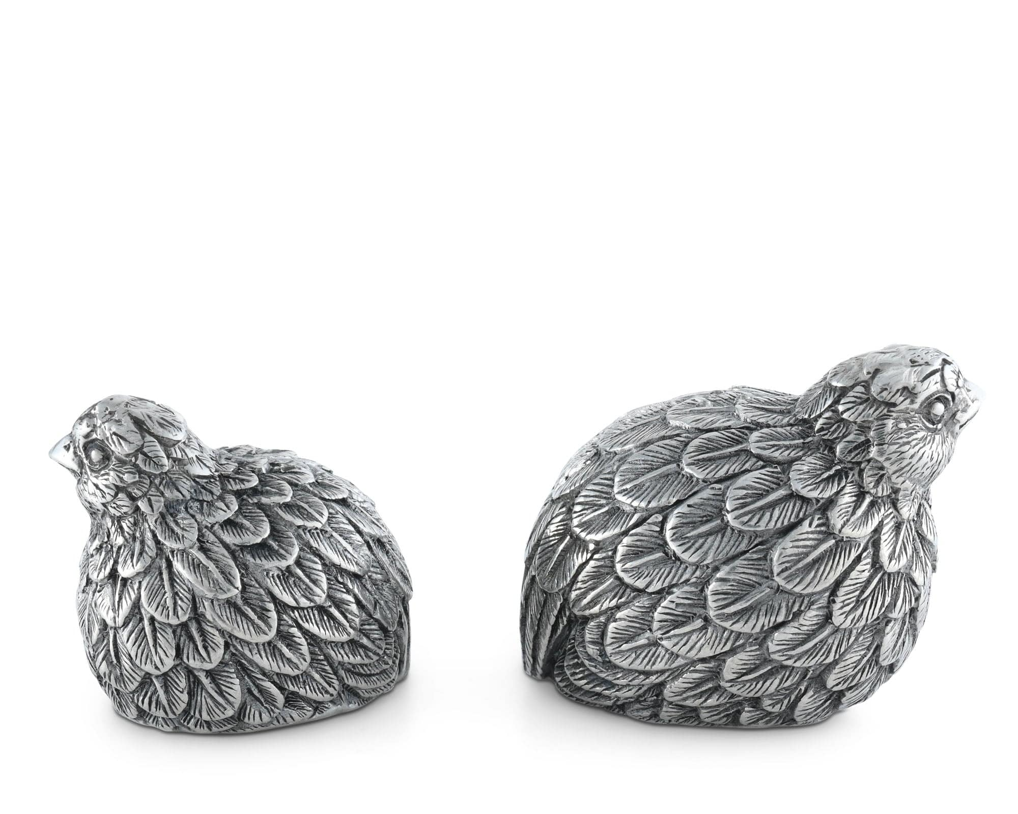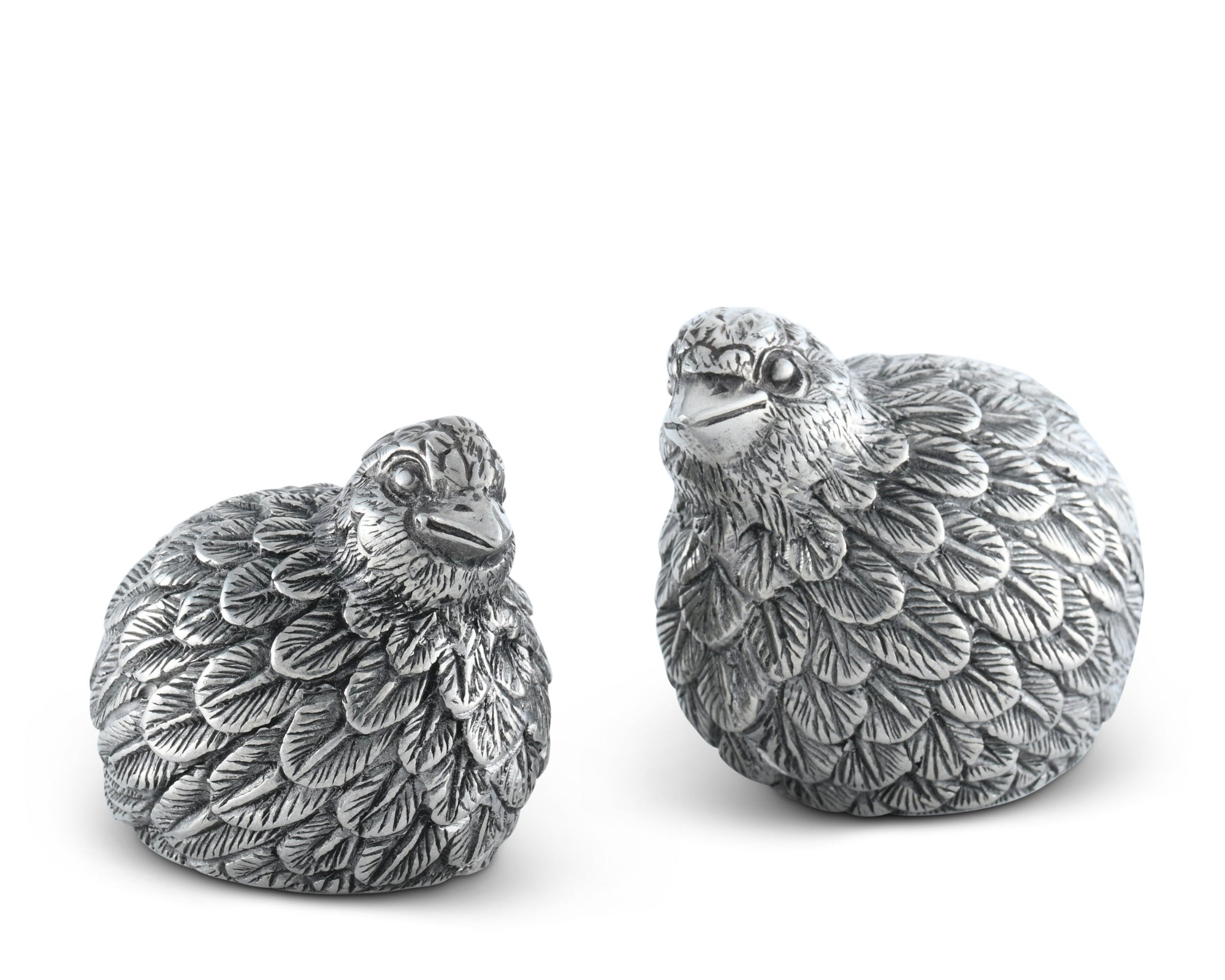 Elevate your dining experience with Vagabond House’s Morning Hunt Quail Salt and Pepper Set. These exquisitely detailed tiny pewter quail statues, boasting intricately detailed feathers and lifelike poses, are a testament to the master craftsmanship of Vagabond's Pewter smiths. This compact duo lends a conversation piece to your table, ideally designed at 3" long, 2.25" wide and 2" tall for a graceful presence to complement all table setups.