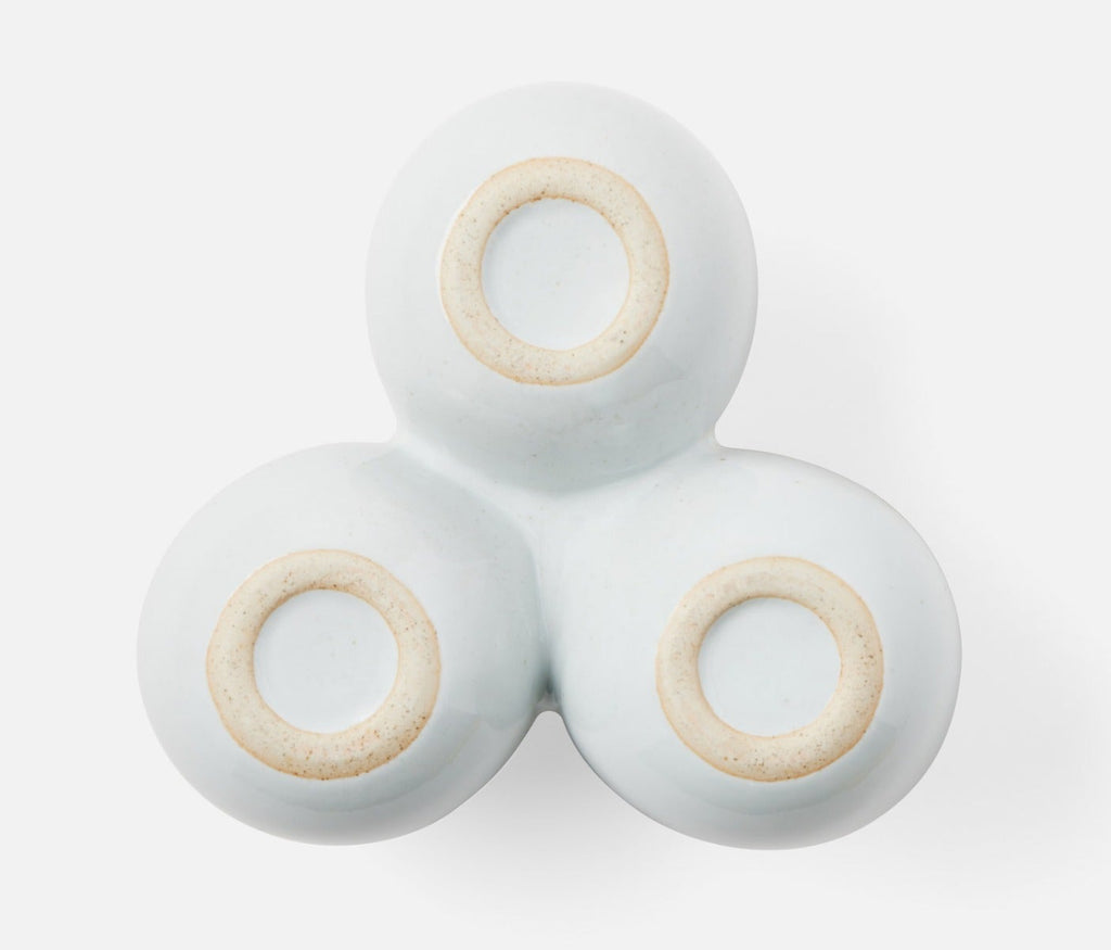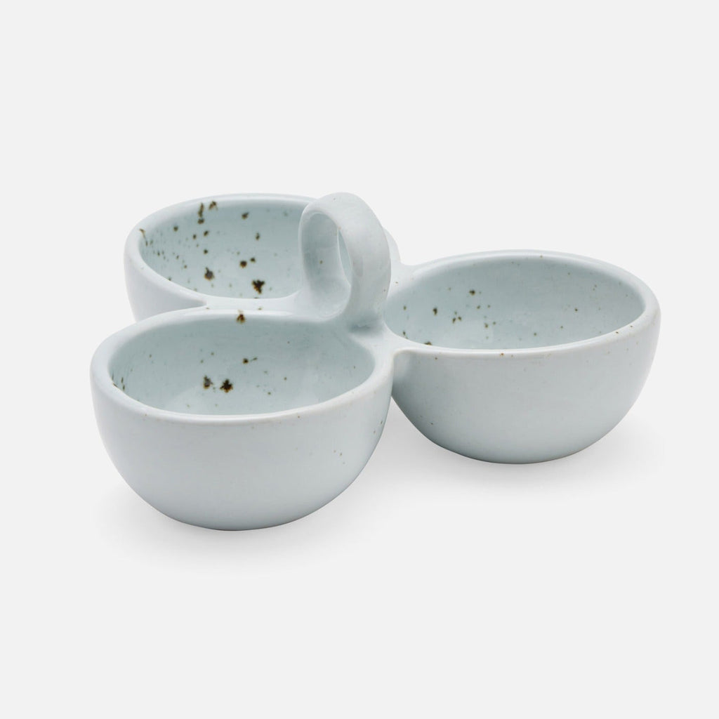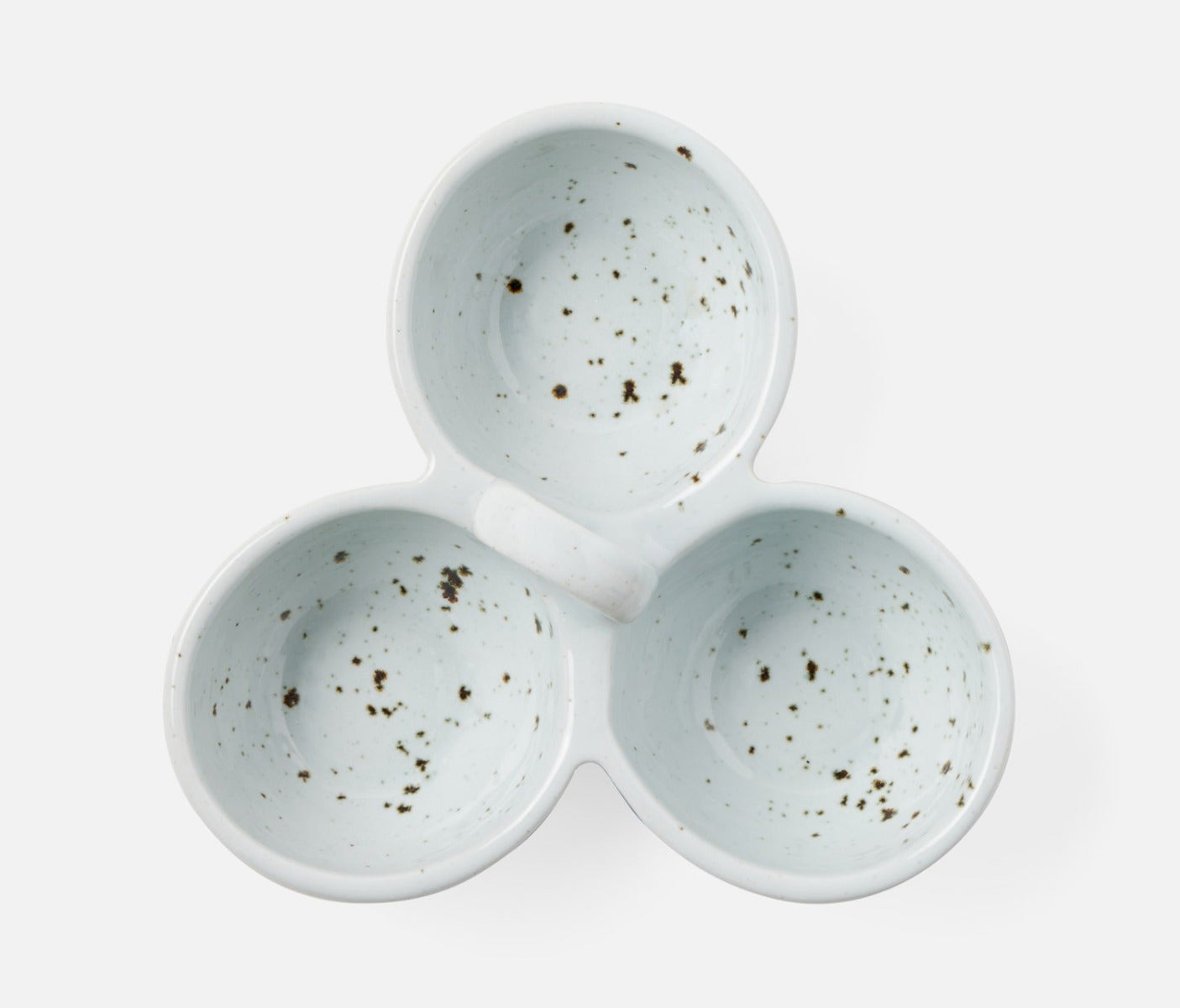 - White Salt Glaze triple bowl nut dish for serving condiments, snacks, and sides