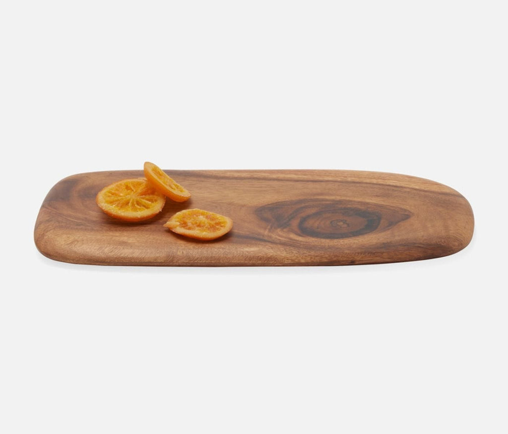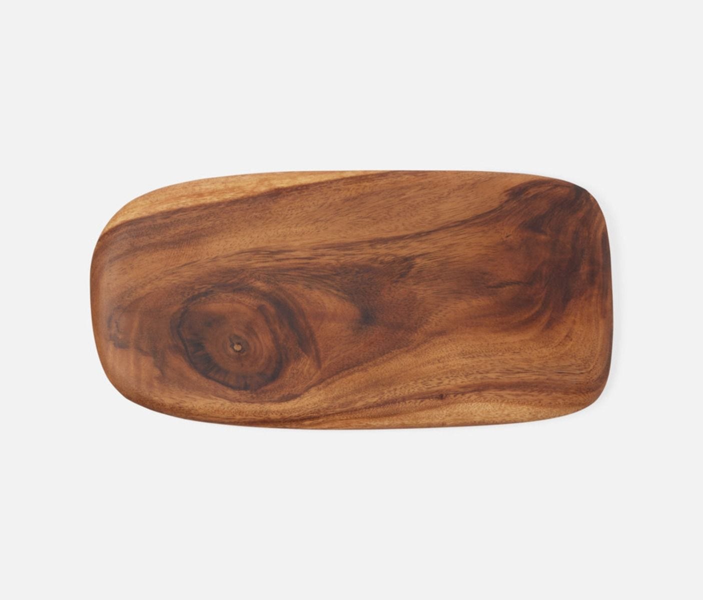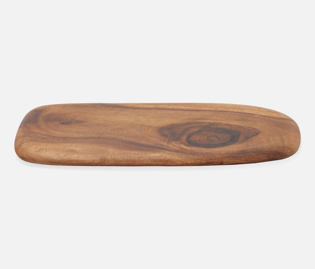 - Hand carved natural acacia wood in an organic rounded slab serving board