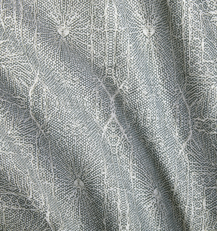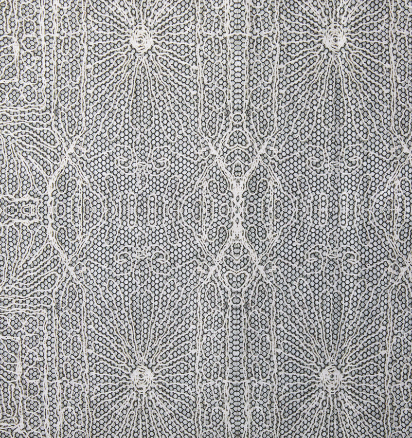 - Printed lace pattern in ivory and black tones with intricately knotted motifs that appear to sit atop the netted lace pattern