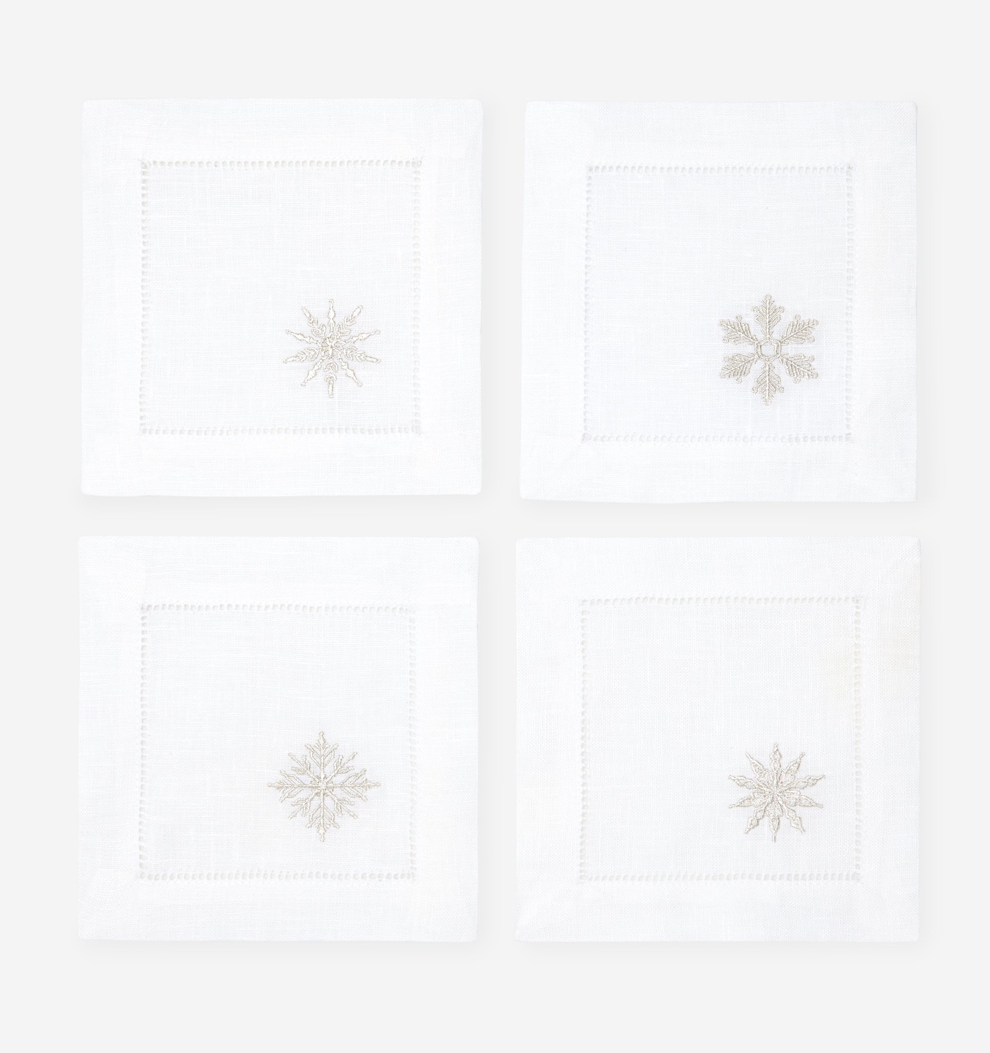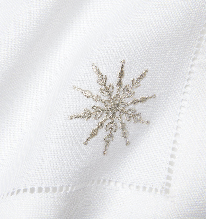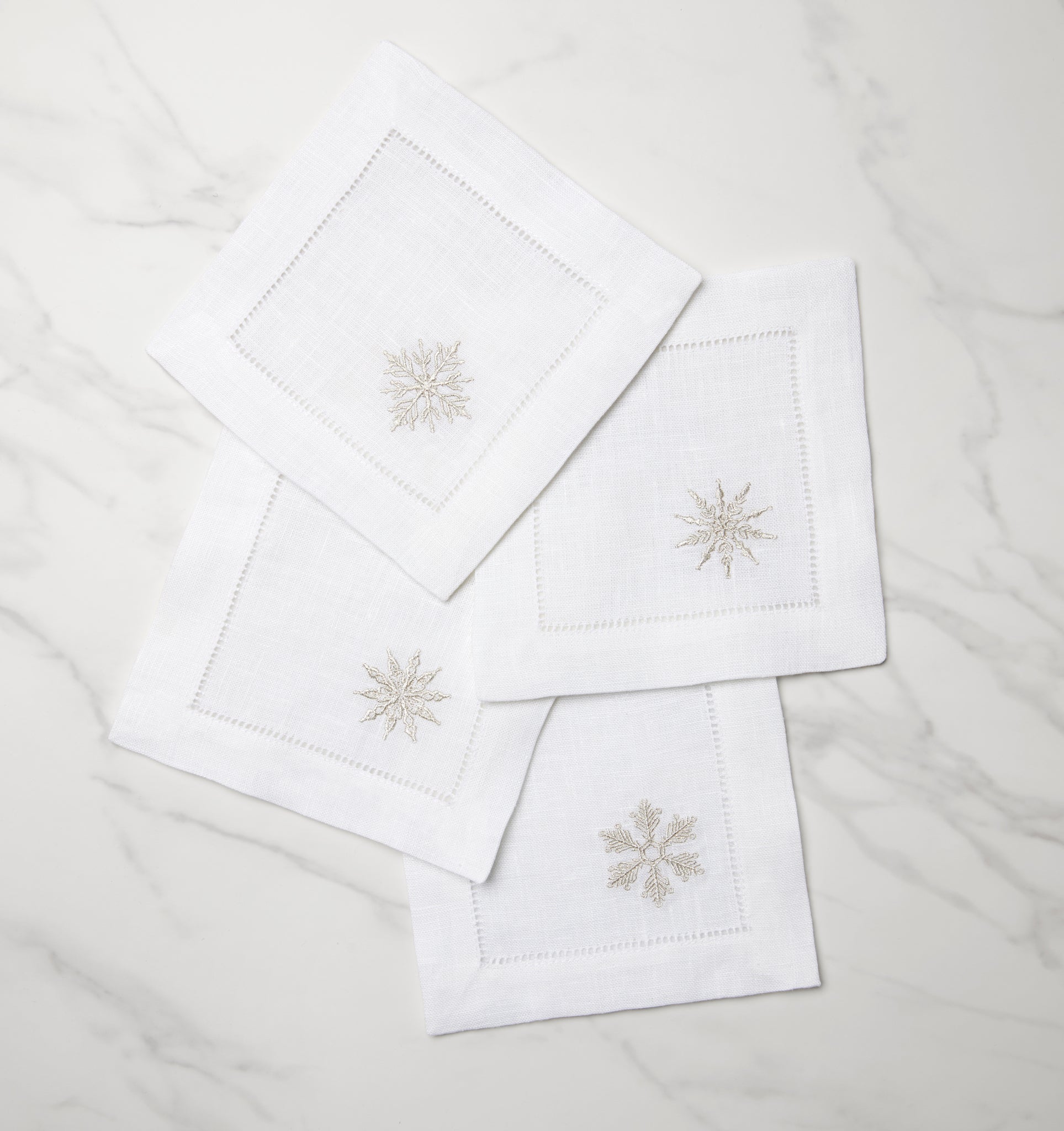 - Four different designs of metallic silver thread snowflakes are embroidered on white pure linen for a cocktail napkin set that captures winter and holiday celebration spirit