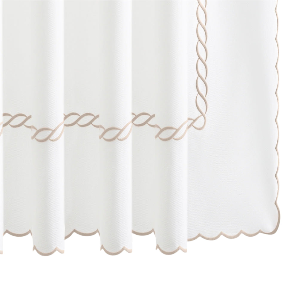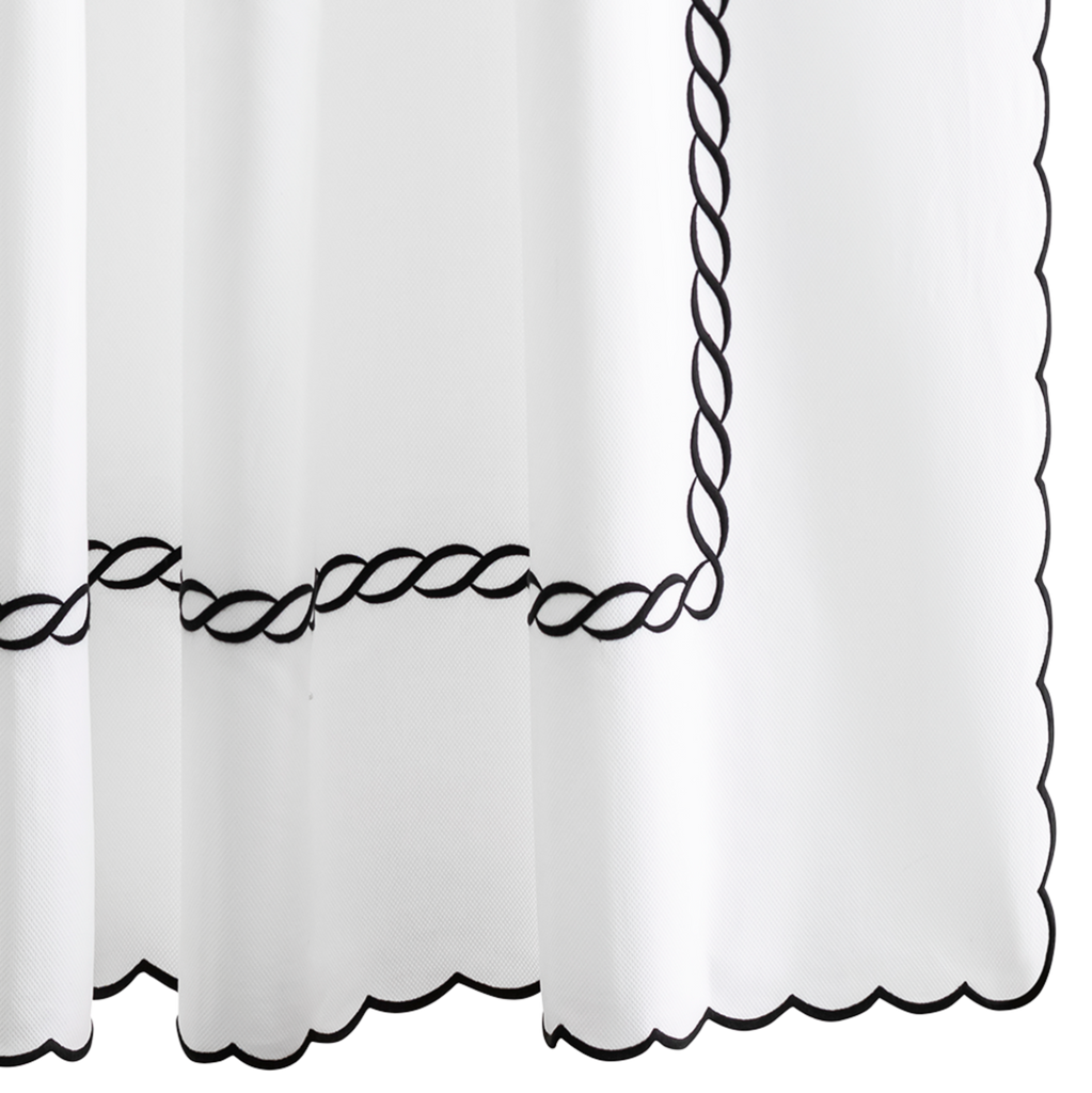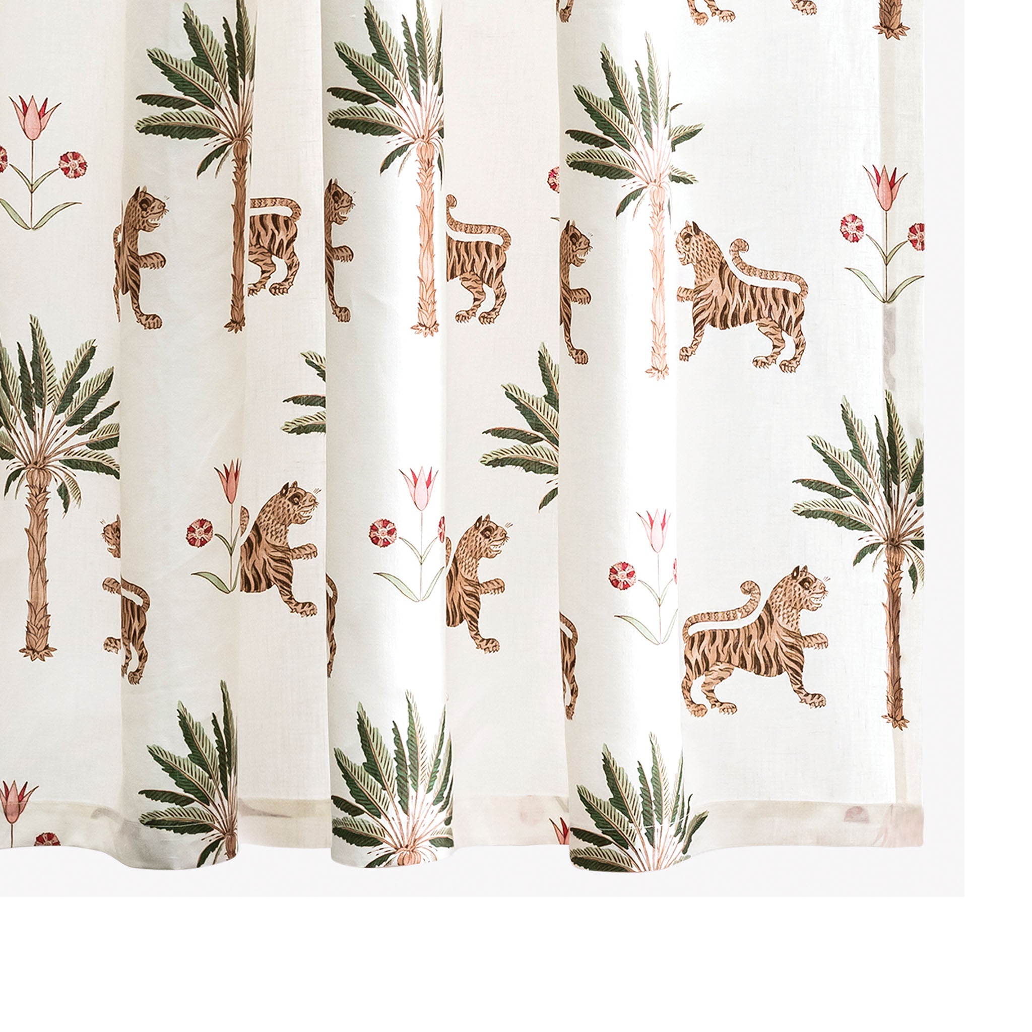 Tiger Palm Shower Curtain features a Schumacher inspired design printed on Matouk's soft linen. Palms, tigers, and florals have a block-print-style feel in soothing tones. A perfect style if you are wanting a playful yet sophisticated shower curtain.