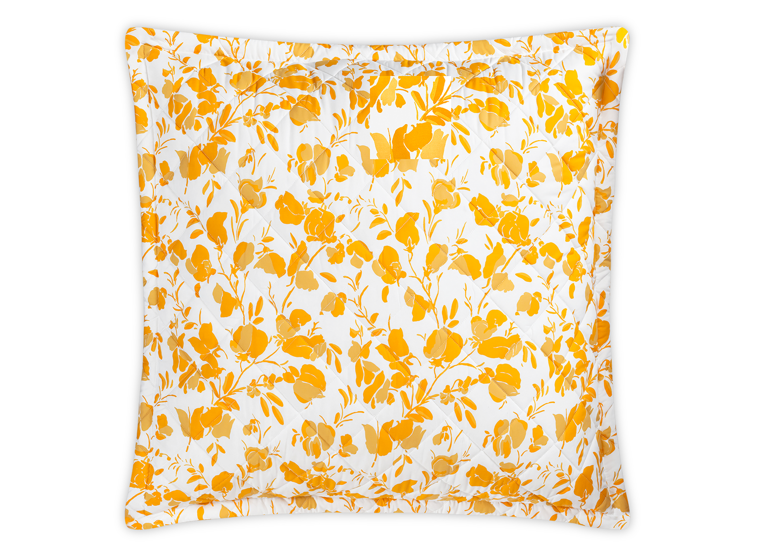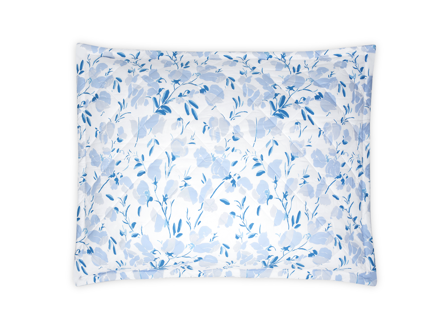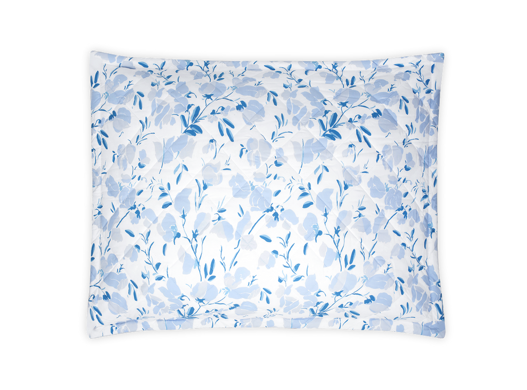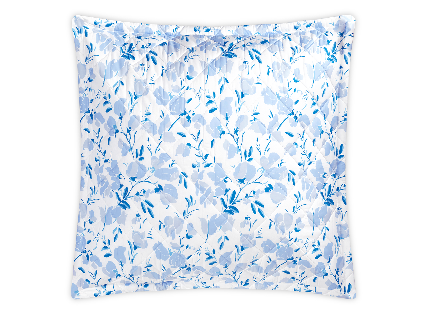 Large scale playful floral print on white Luca percale that is then quilted with a 4" diamond pattern and finished with an elegant satin stitch detail finish.