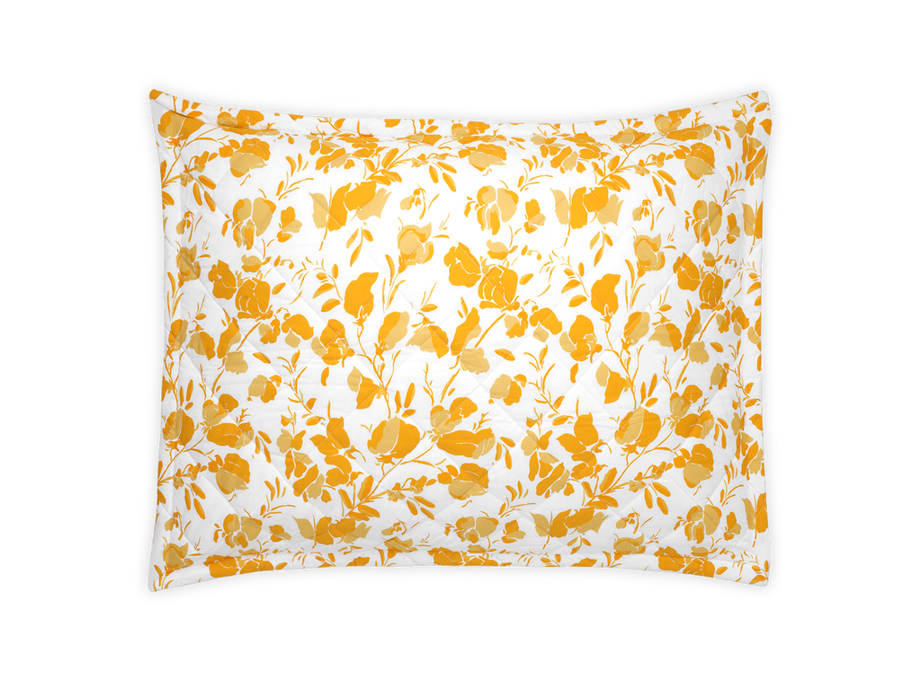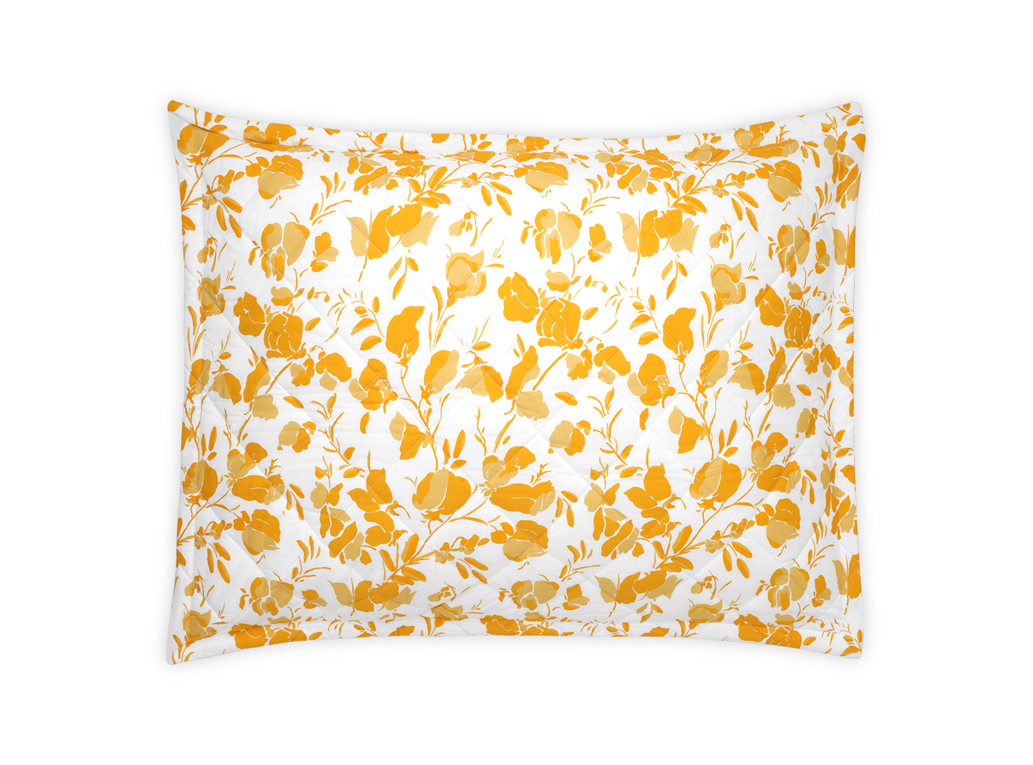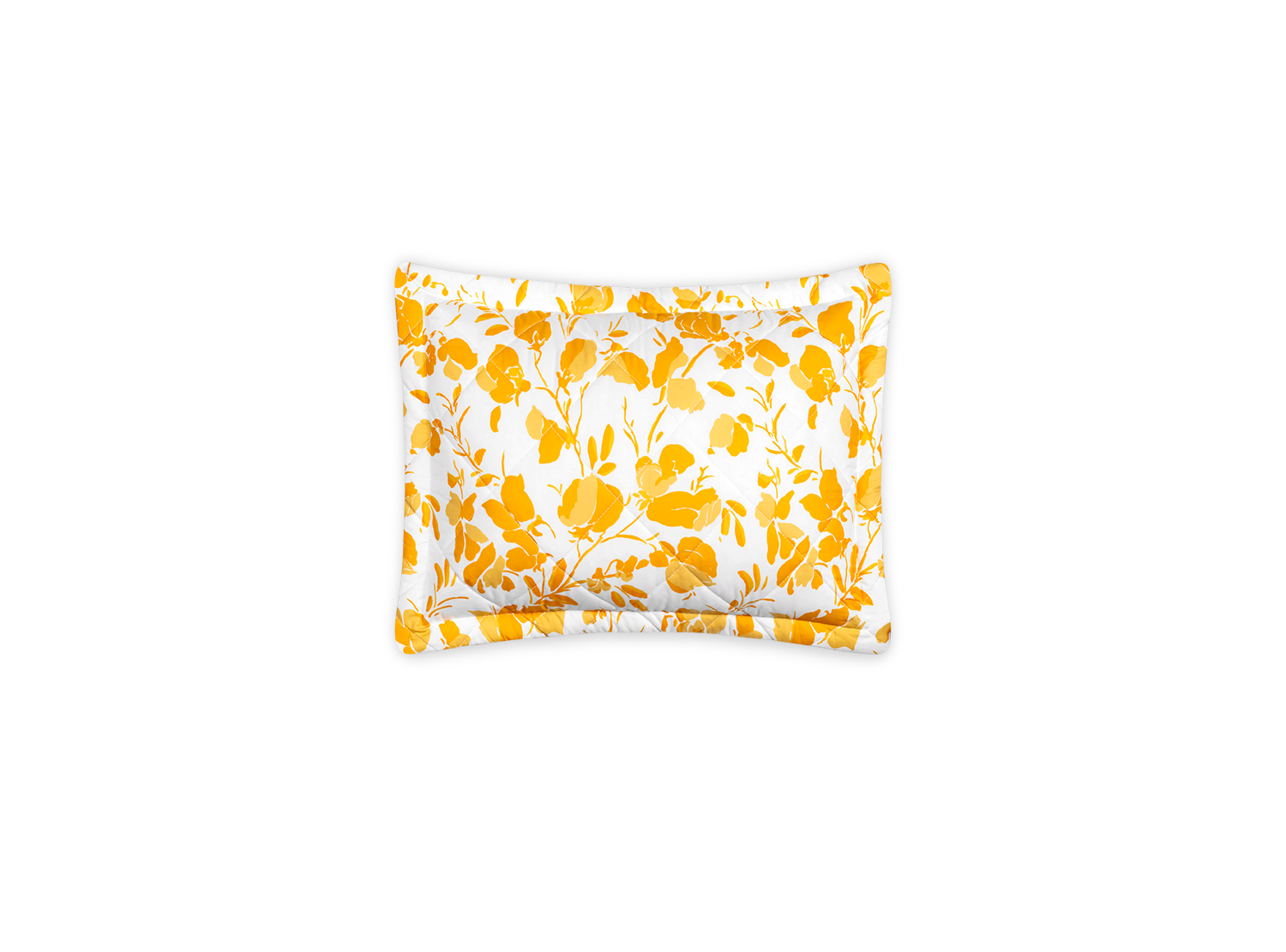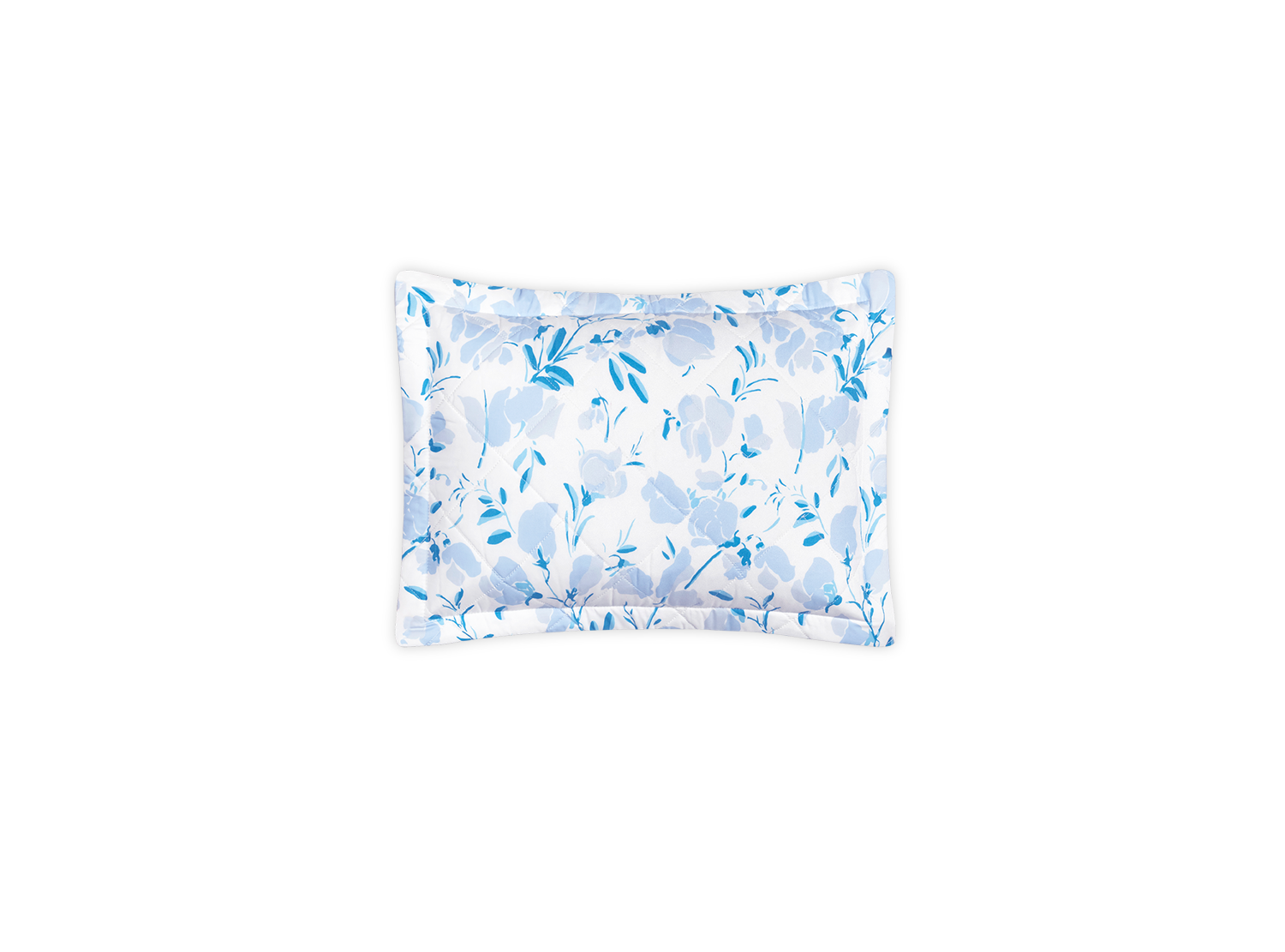 Large scale playful floral print on white Luca percale that is then quilted with a 4" diamond pattern and finished with an elegant satin stitch detail finish.