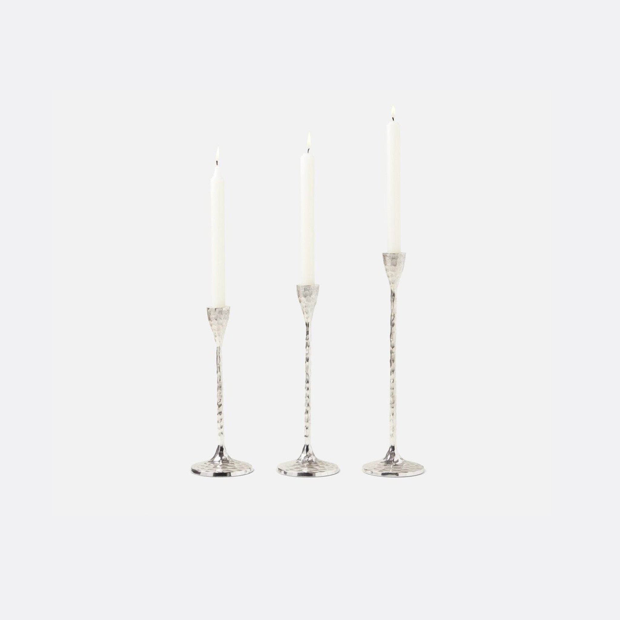 - Brass candlestick set in a silver finish. Hammered into a slender silhouette with a textured, brilliant surface