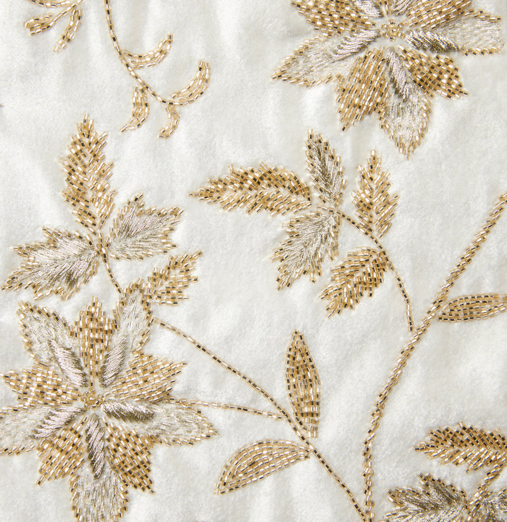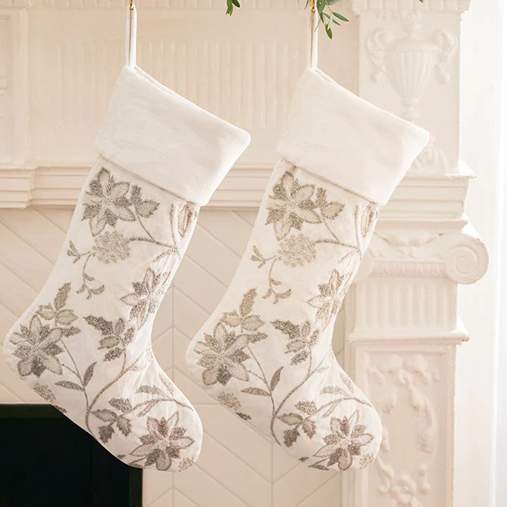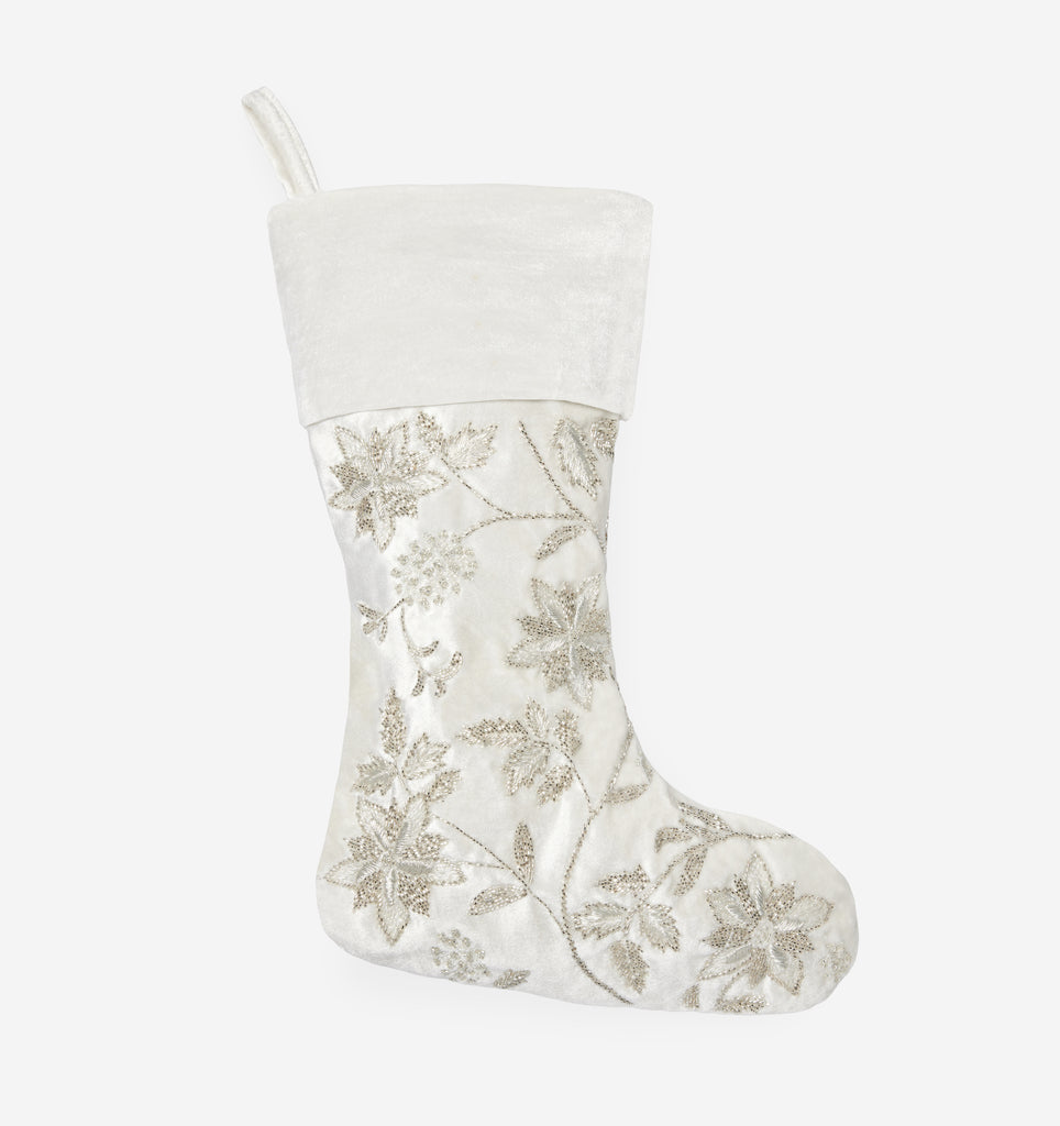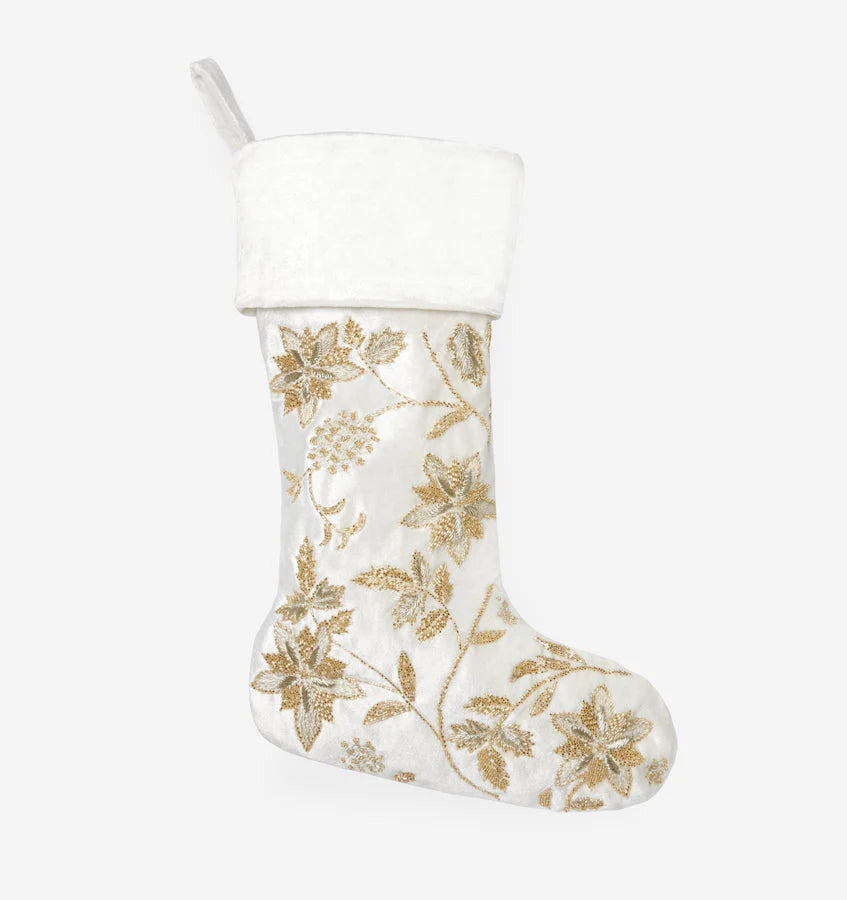 • Hand guided machine embroidered poinsettias with metallic gold or silver threads on an ivory background stocking