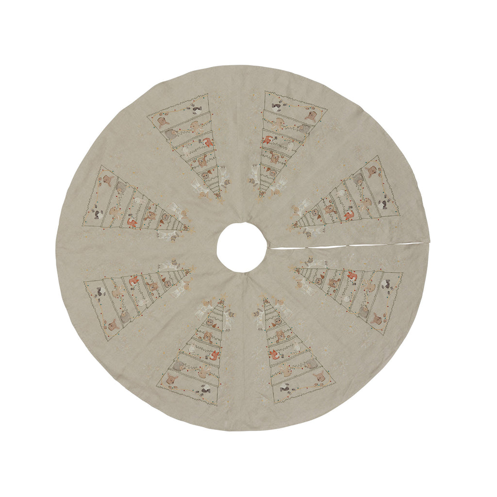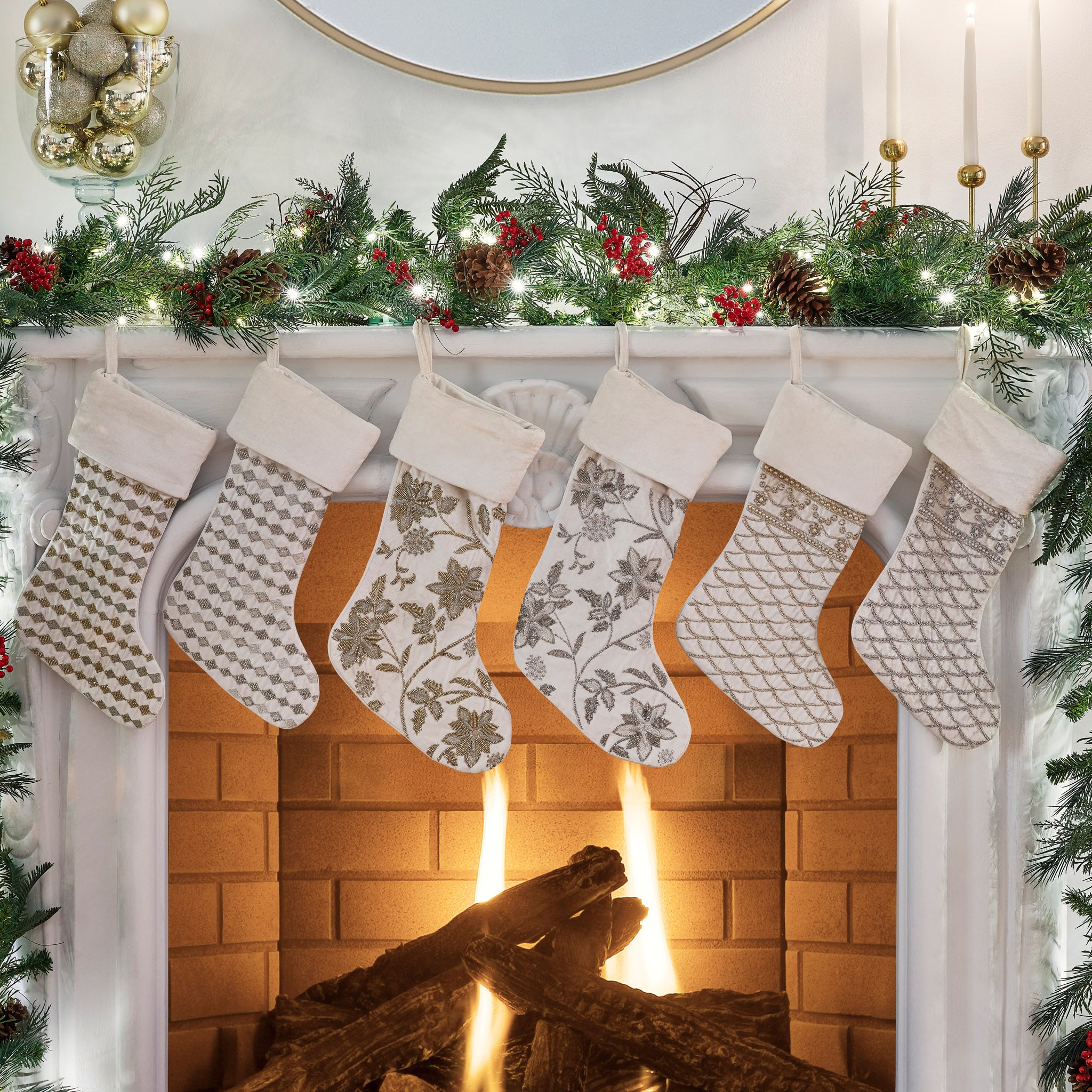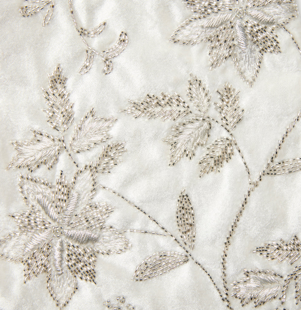 • Hand guided machine embroidered poinsettias with metallic gold or silver threads on an ivory background stocking