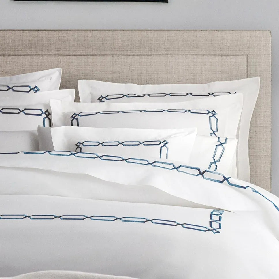 - Duvet Covers have knife edge finish with U-shaped chain embroidery on top of bed, button closures, and corner ties.