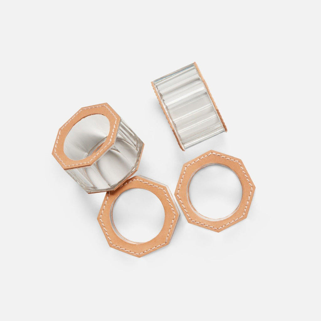- Clear glass crystal napkin rings with aged camel full grain leather detail