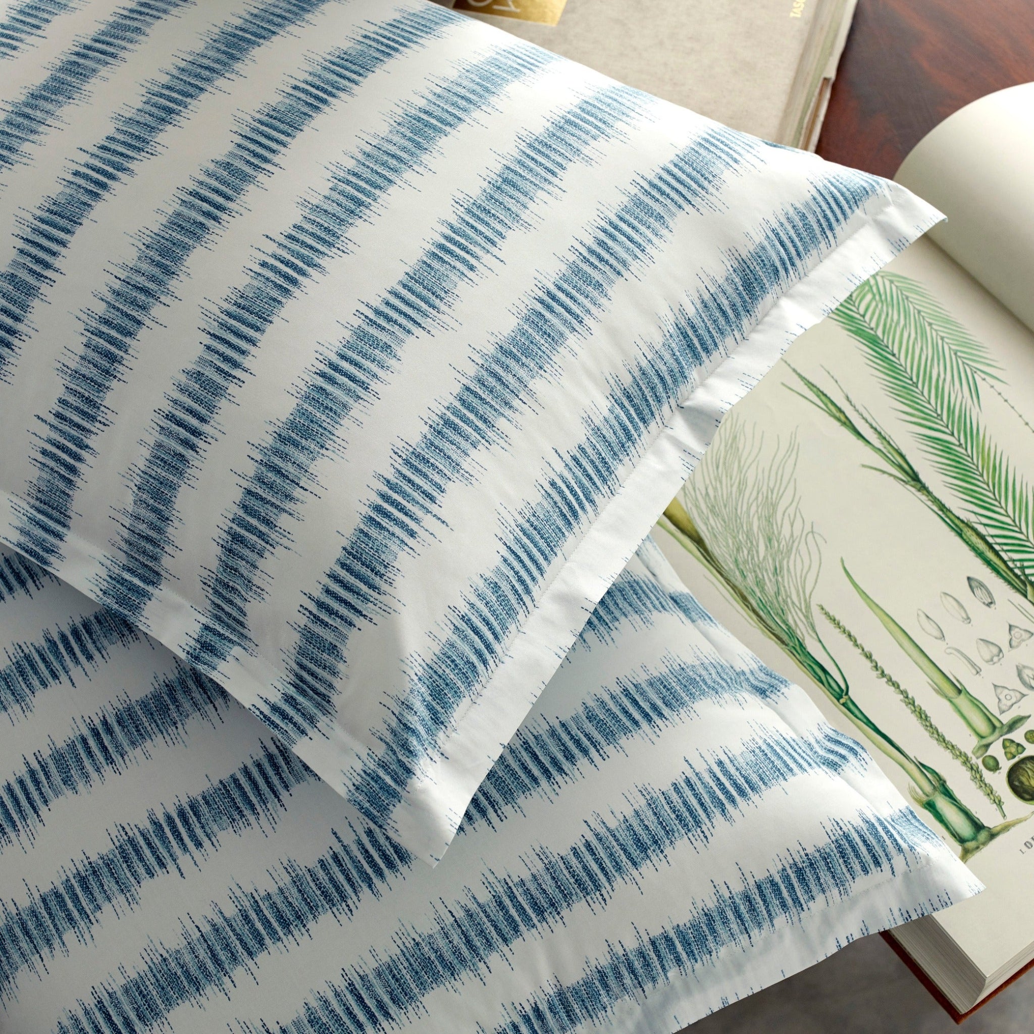 Schumacher's ikat style print of soft, colorful stripes on Matouk's best-selling Luca cotton percale fabric.
