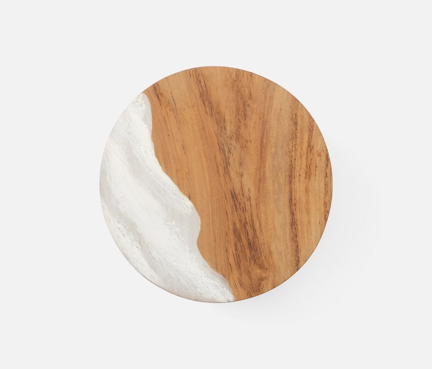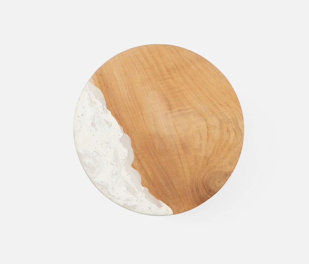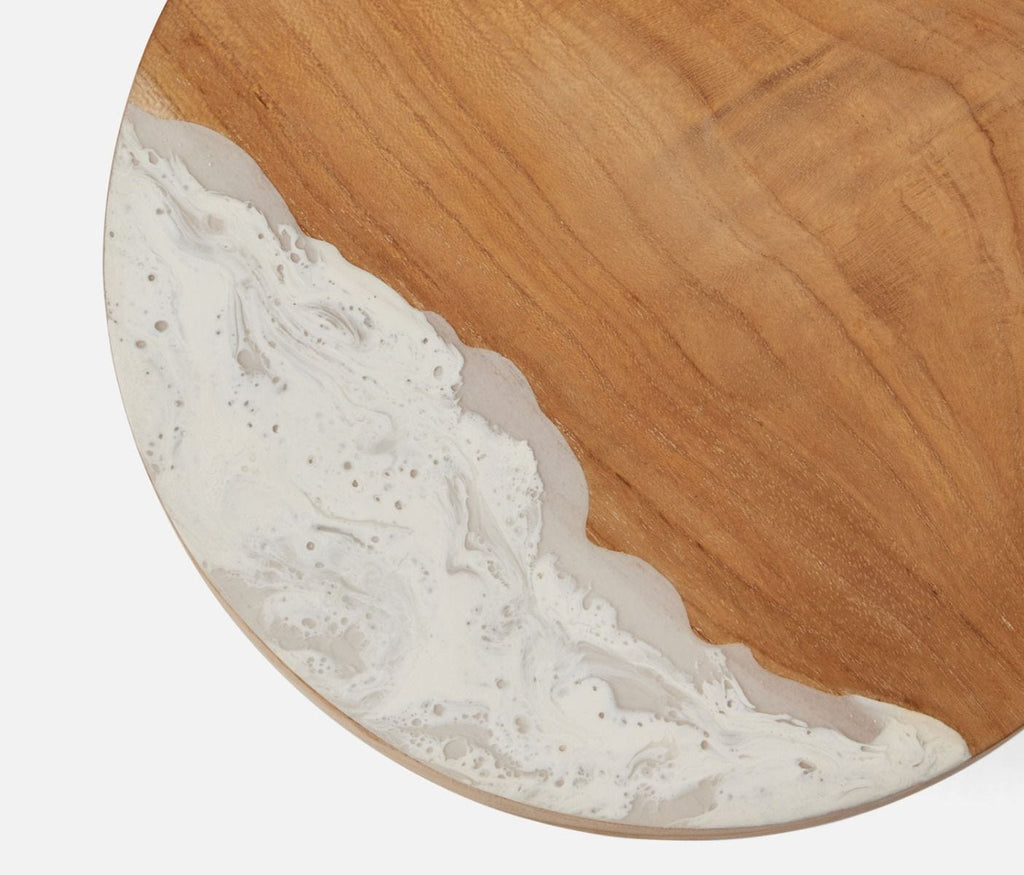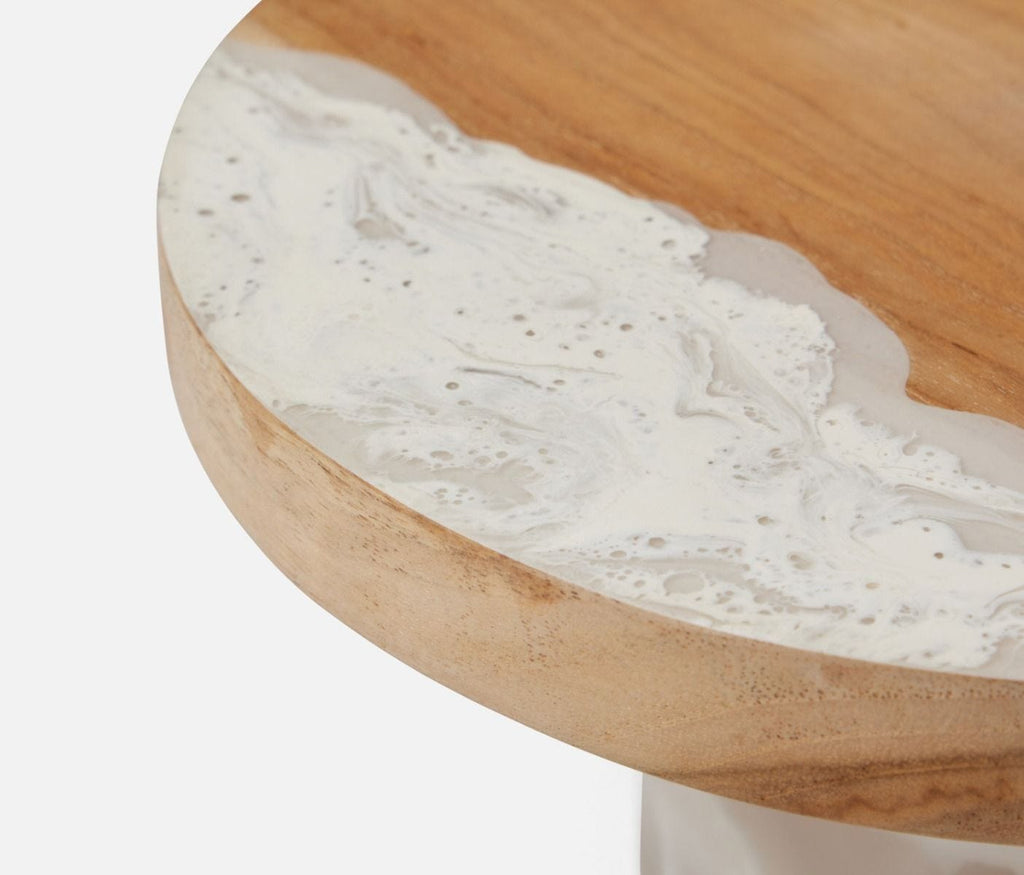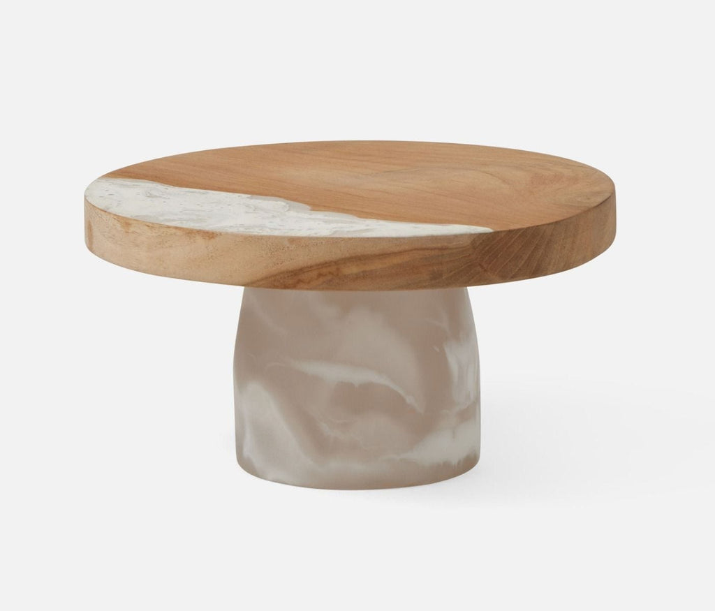 - Natural and durable teak wood cake stand complemented by white swirled resin for a modern, minimal display