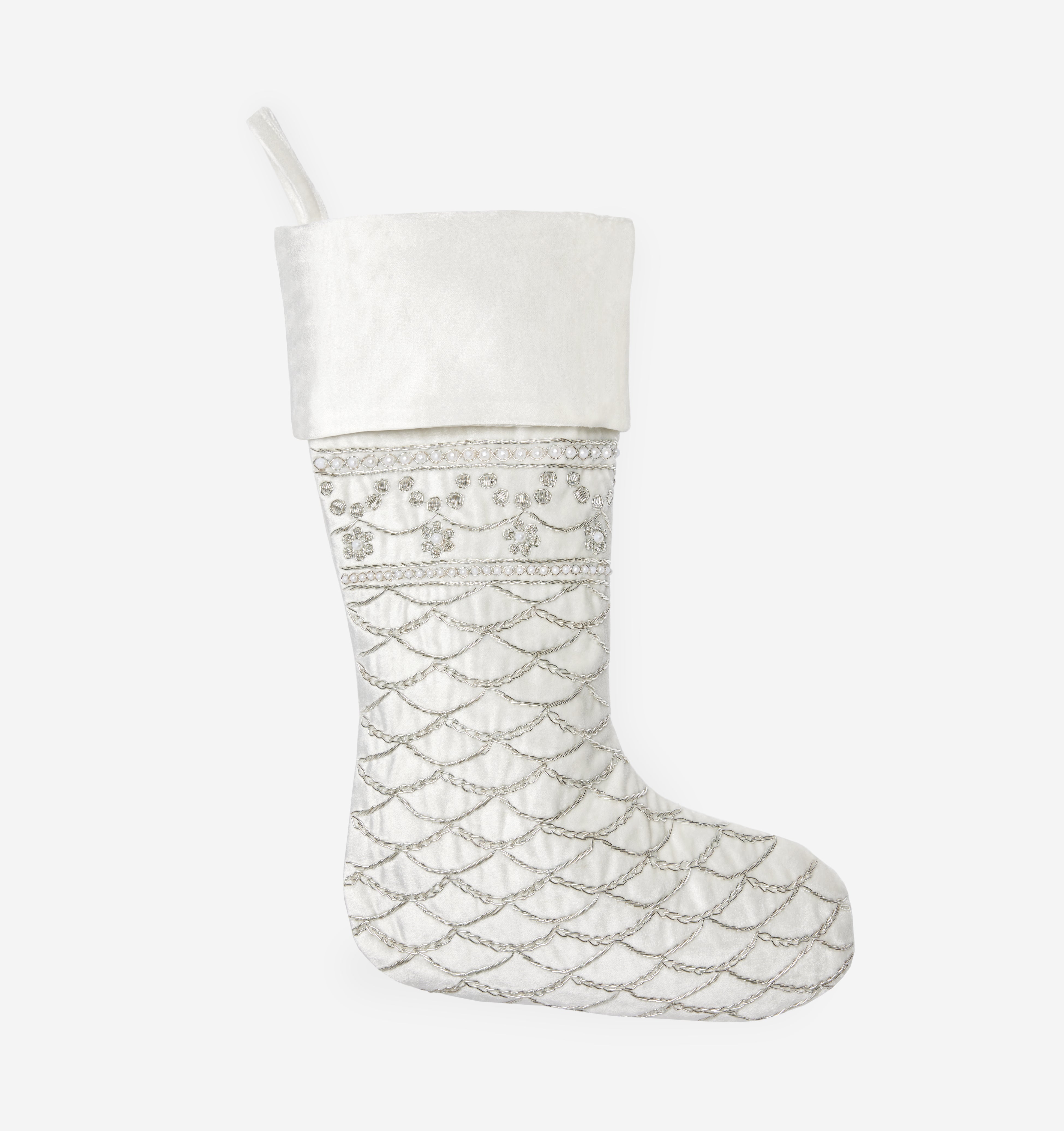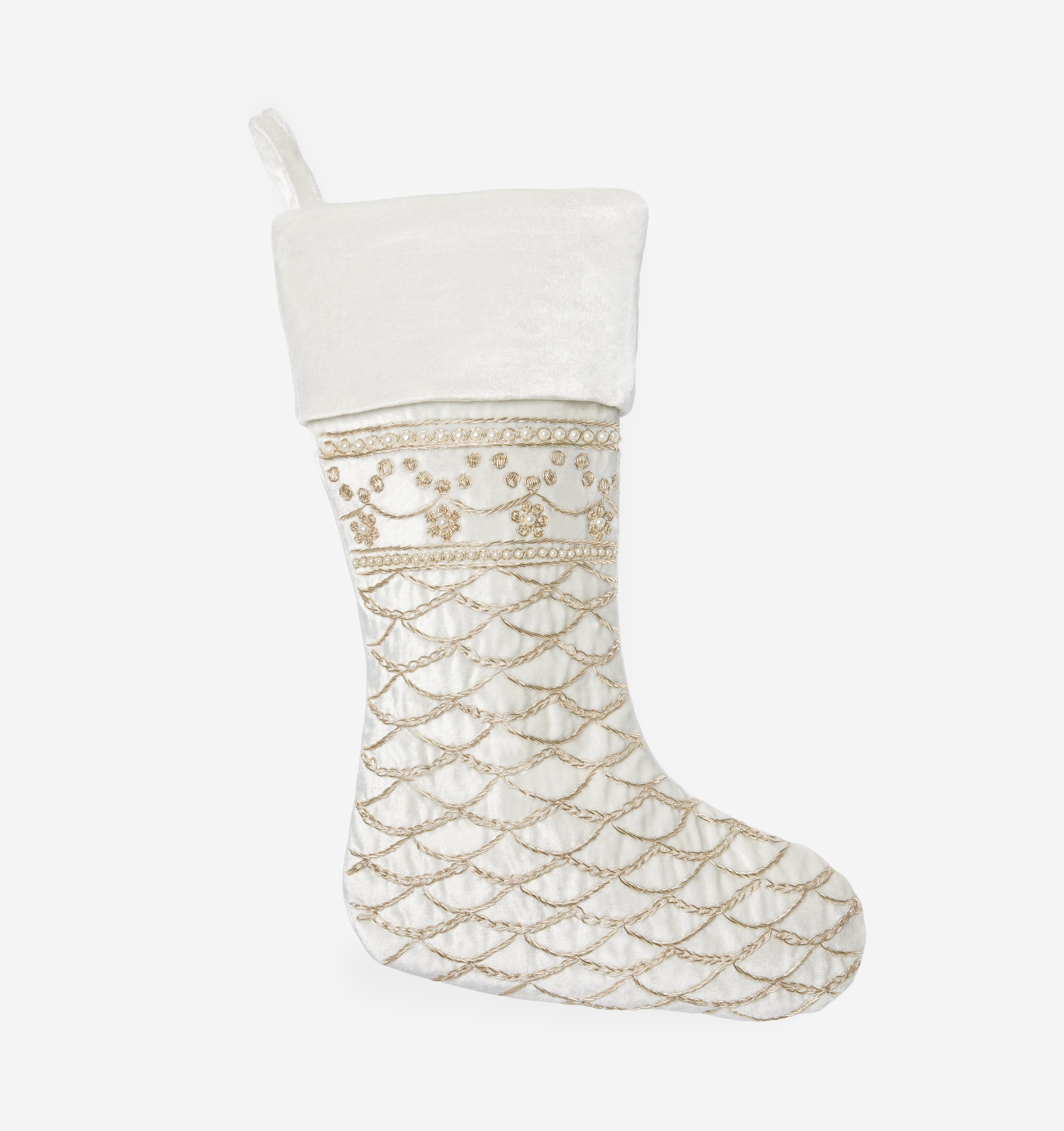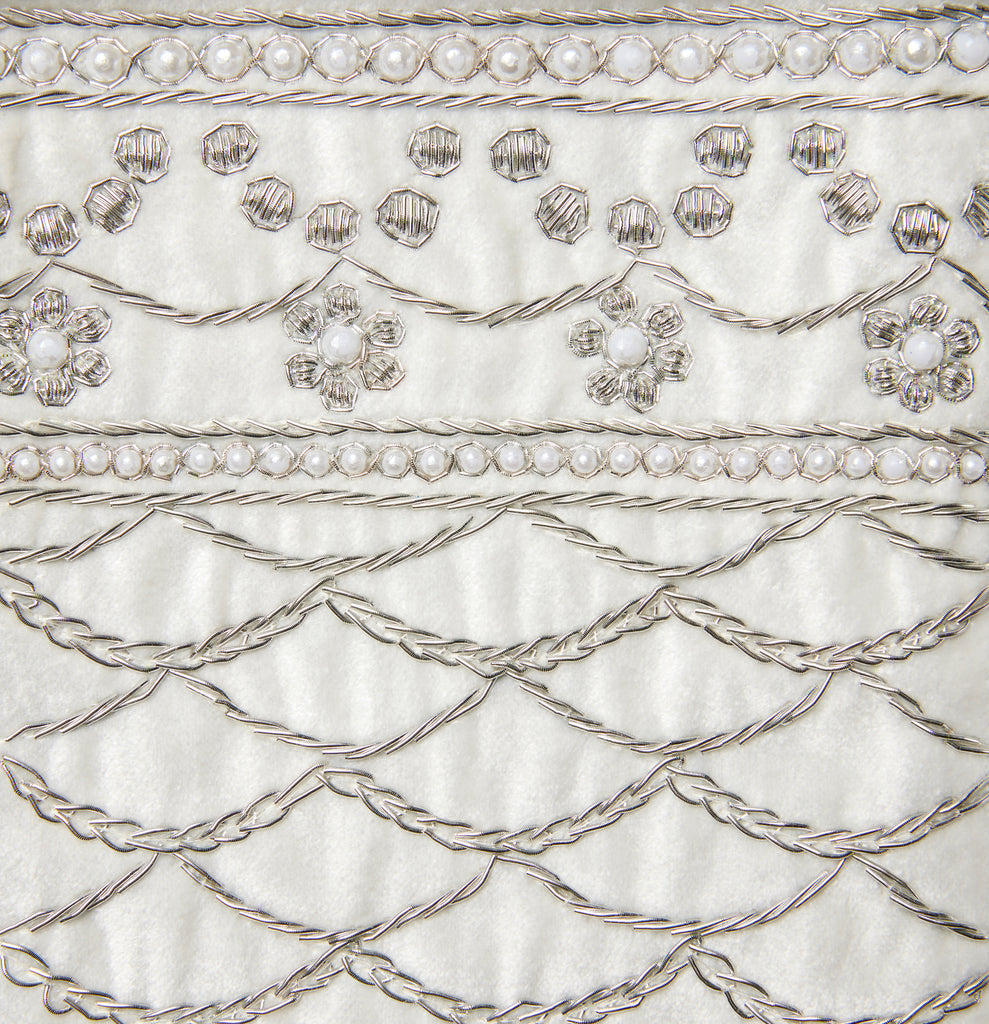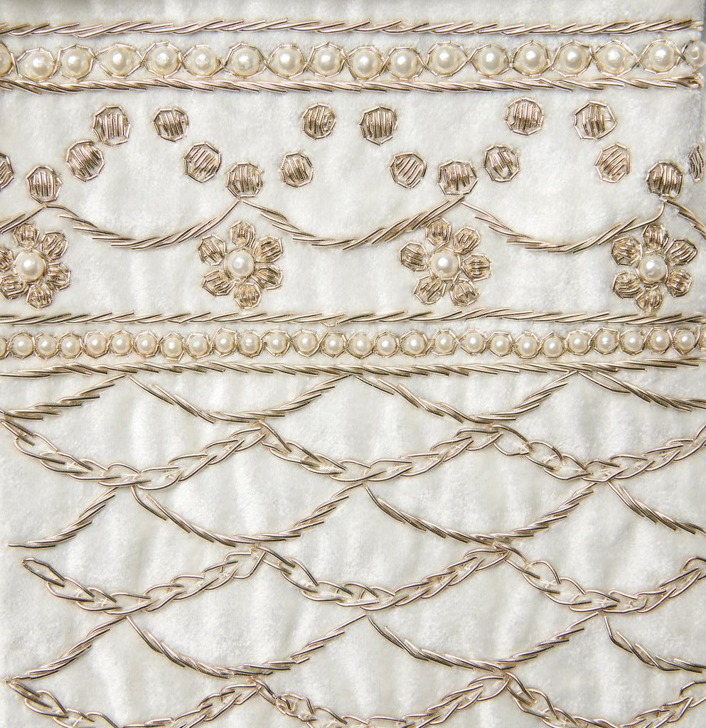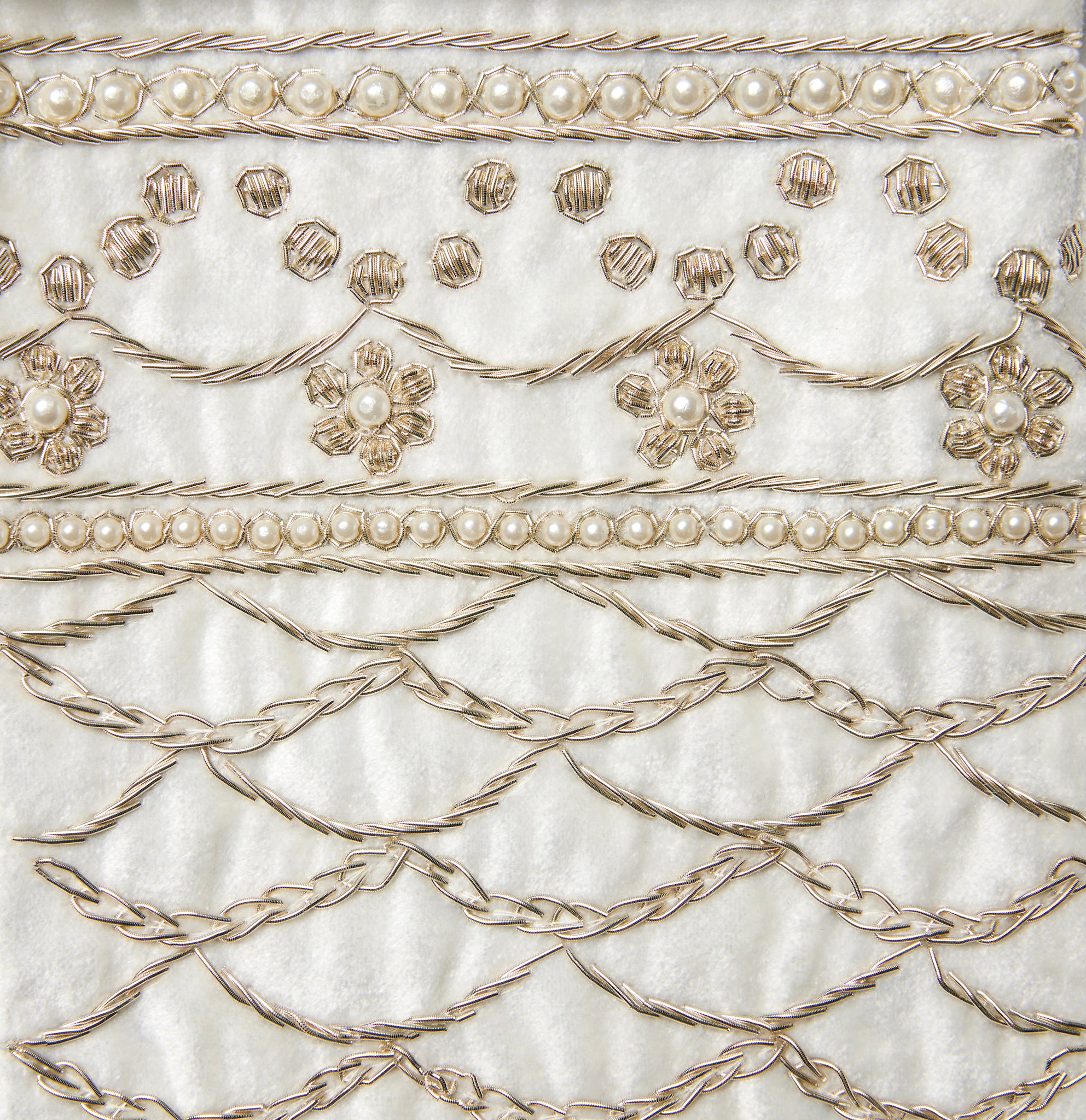 • Hand guided machine embroidered with metallic scallops of gold or silver threads and beading on an ivory background stocking