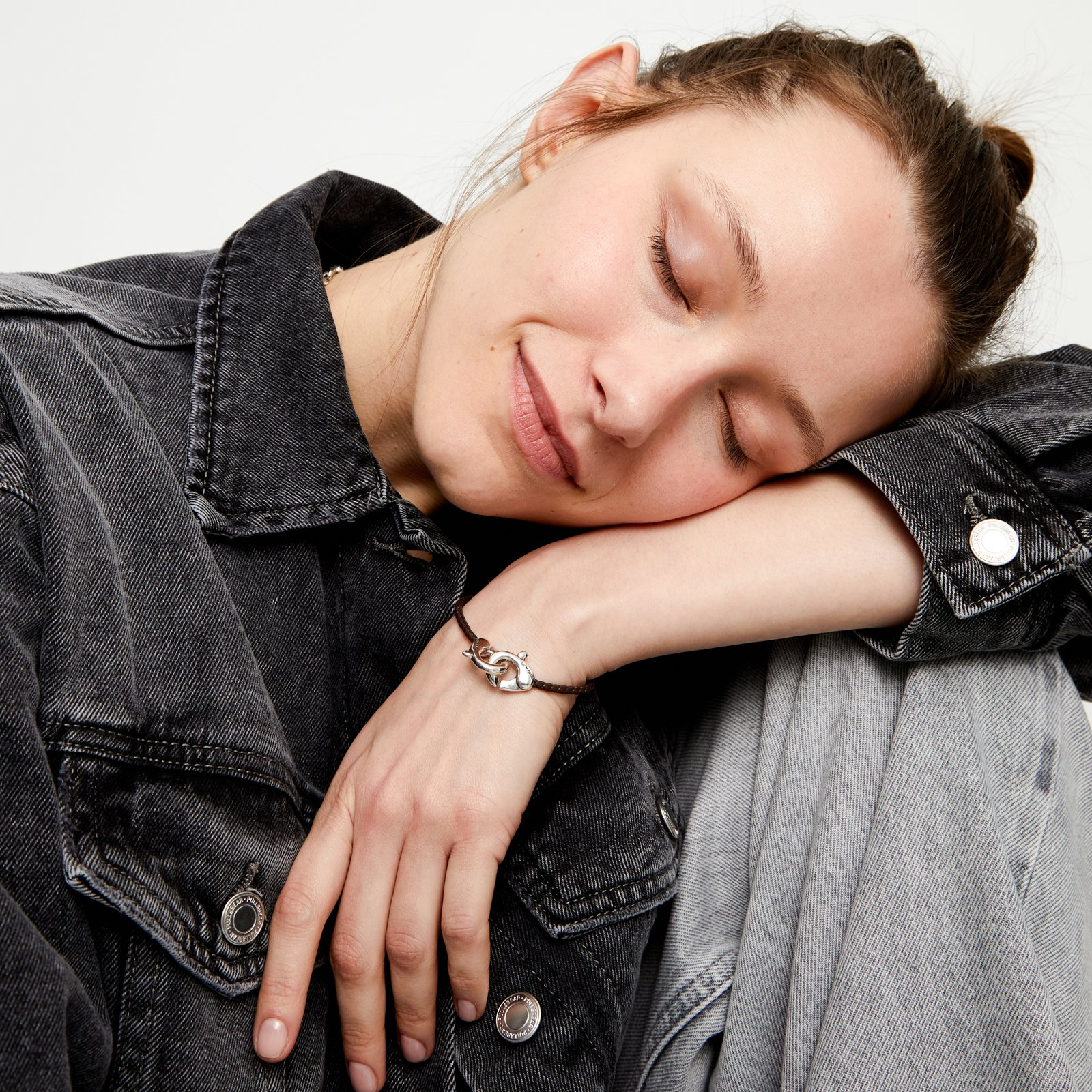 The essence of connection with a classic touch. This bracelet features heavy-duty brown braided leather, a color that evokes earth and stability, with the distinctive sterling silver-plated interlocking carabiner clasp. A versatile and powerful basic.