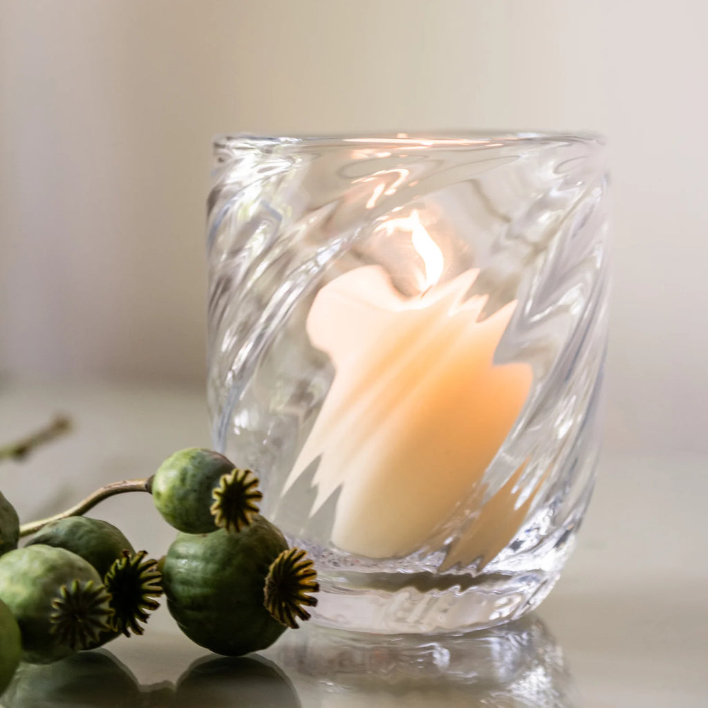 Care: Clean with glass cleaner and a soft cloth. Extinguish candles before the flame reaches the base. Do not expose glass to extreme heat changes, such as placing in the freezer. A shock in temperature can cause fractures.