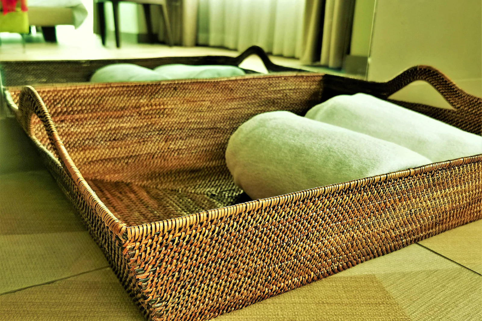 - This substantial basket adds handy storage to any bedroom or living space. Carrying it is a breeze thanks to the sturdy handles.