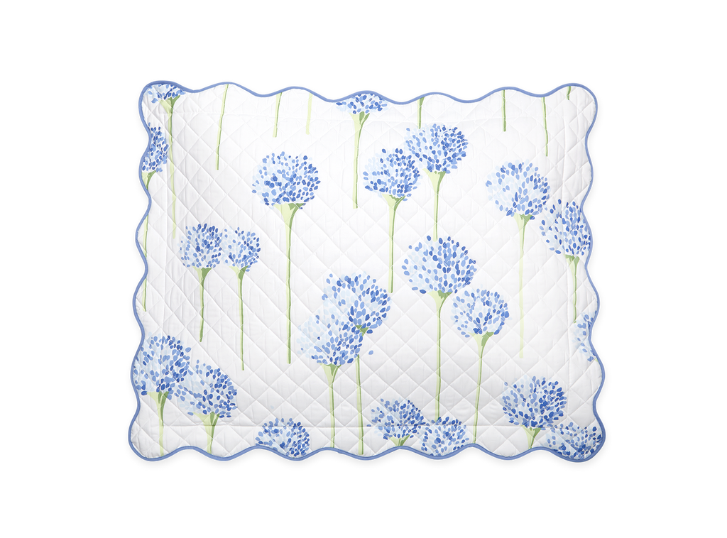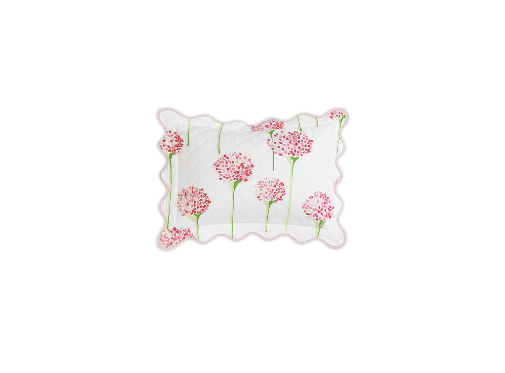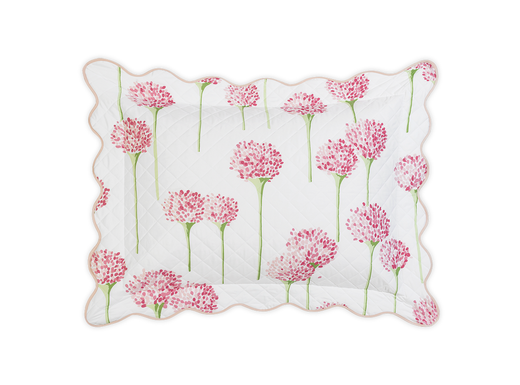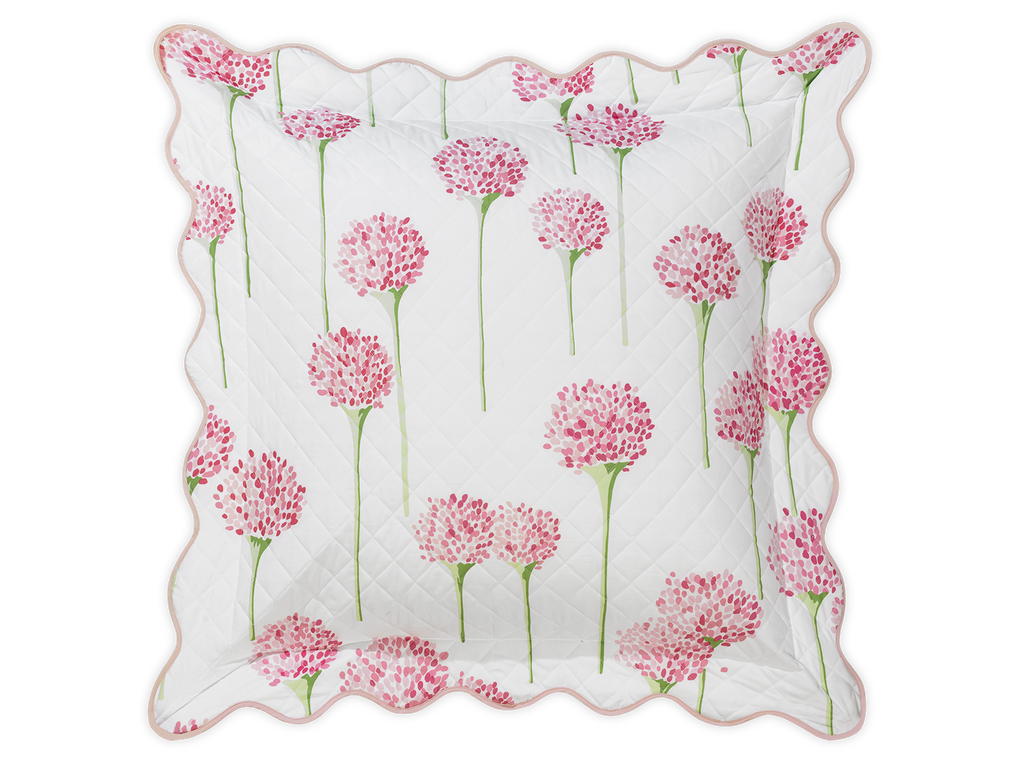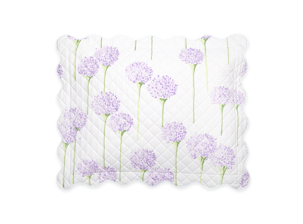 Matouk's most popular pattern in collaboration with artist Lulu de Kwiatkowski features happy, vibrant allium flowers on Luca cotton percale that is quilted in a 2" diamond pattern and finished with a soft wavy scallop edge.