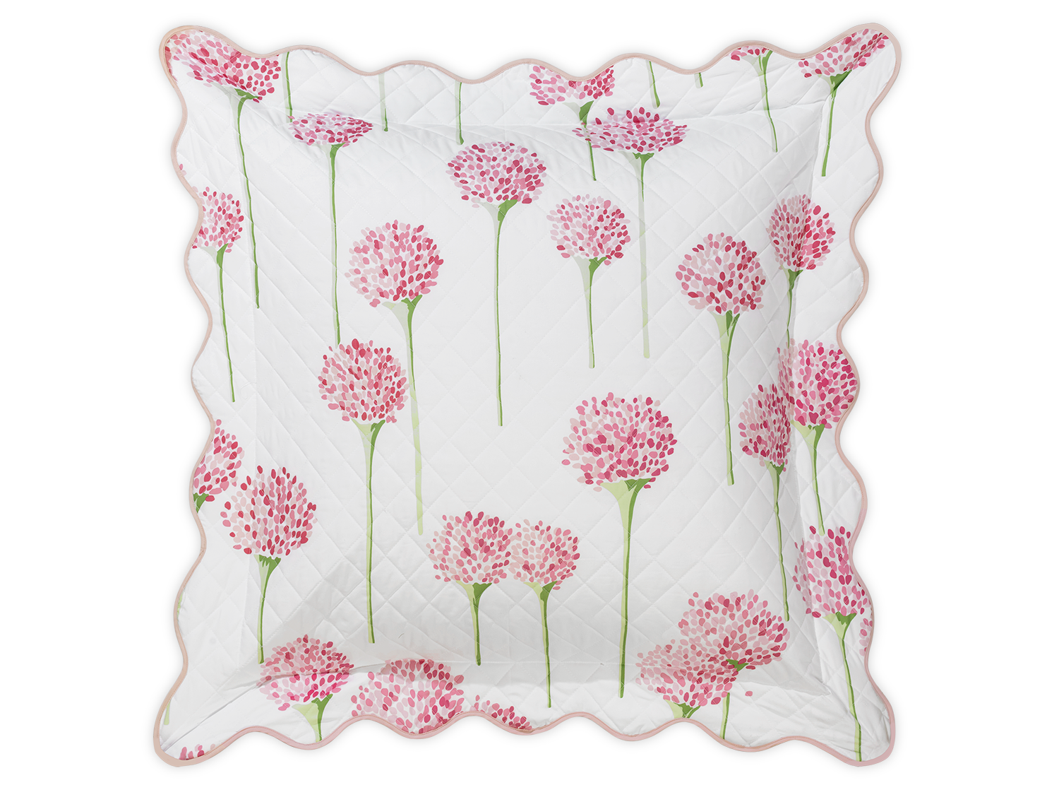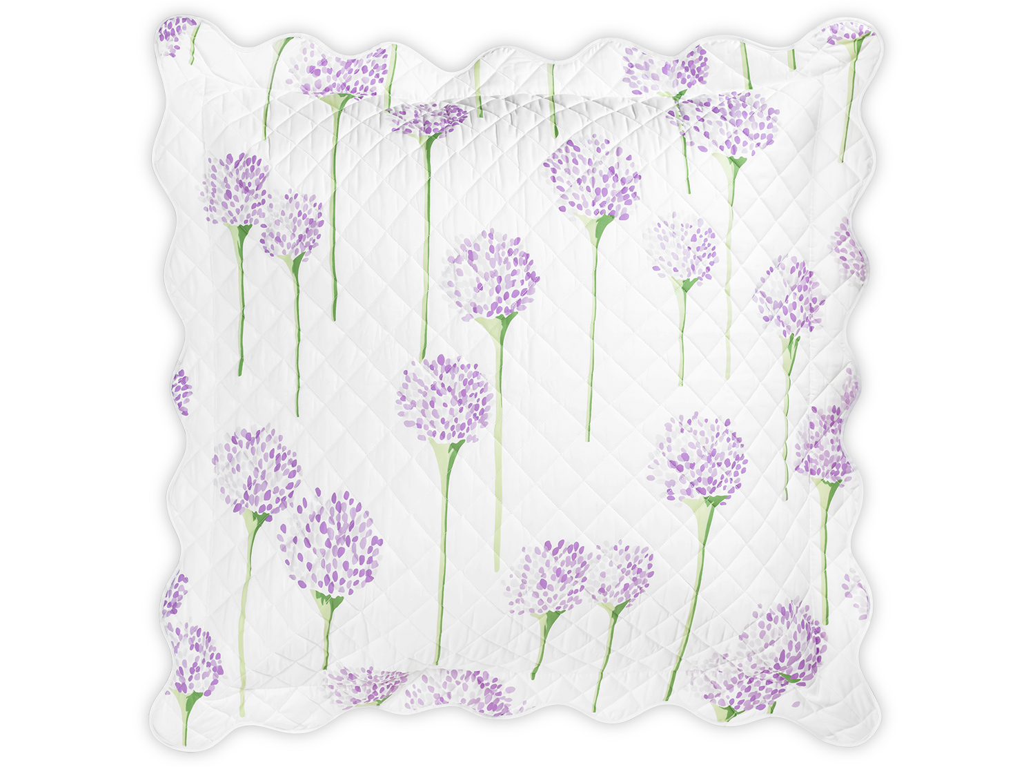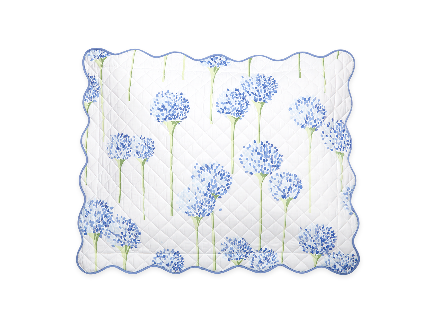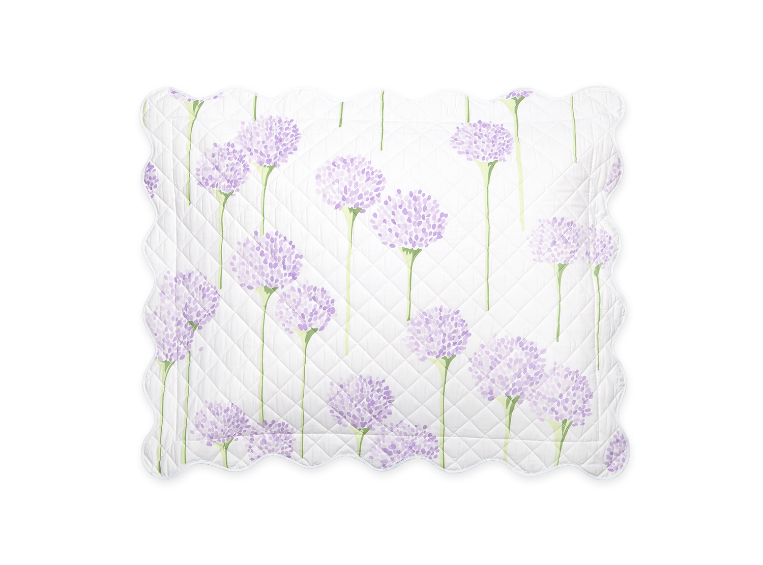 Matouk's most popular pattern in collaboration with artist Lulu de Kwiatkowski features happy, vibrant allium flowers on Luca cotton percale that is quilted in a 2" diamond pattern and finished with a soft wavy scallop edge.