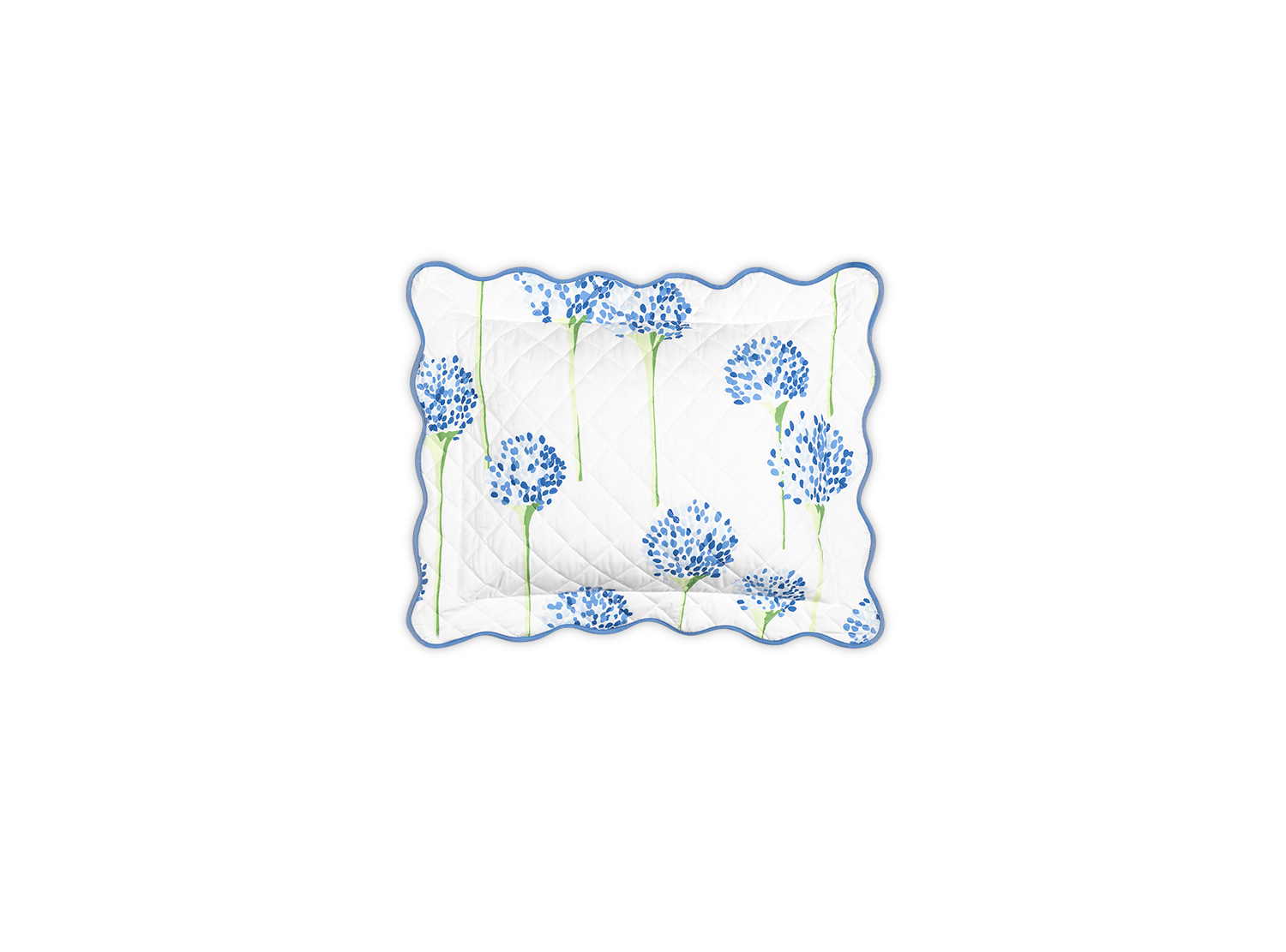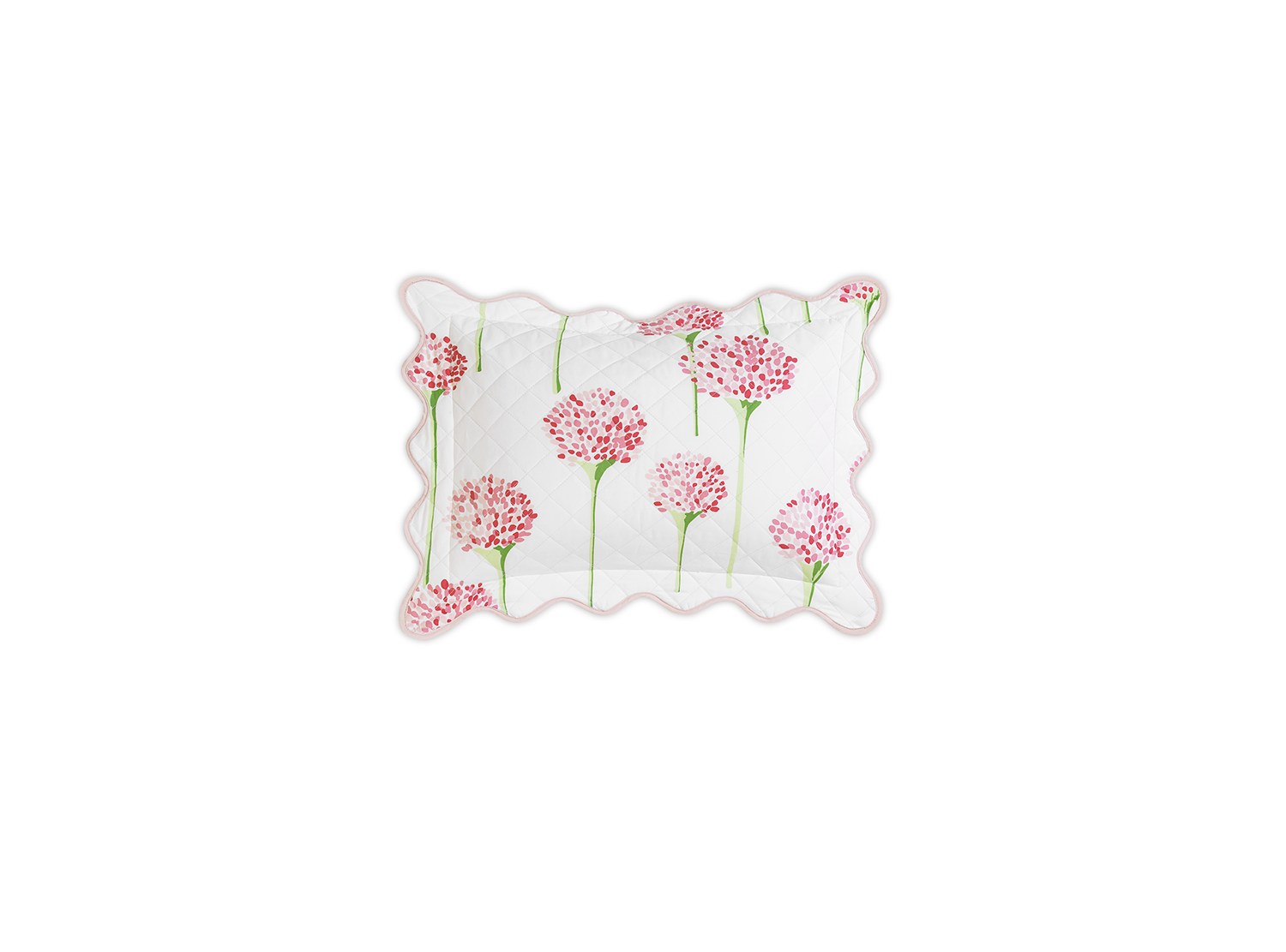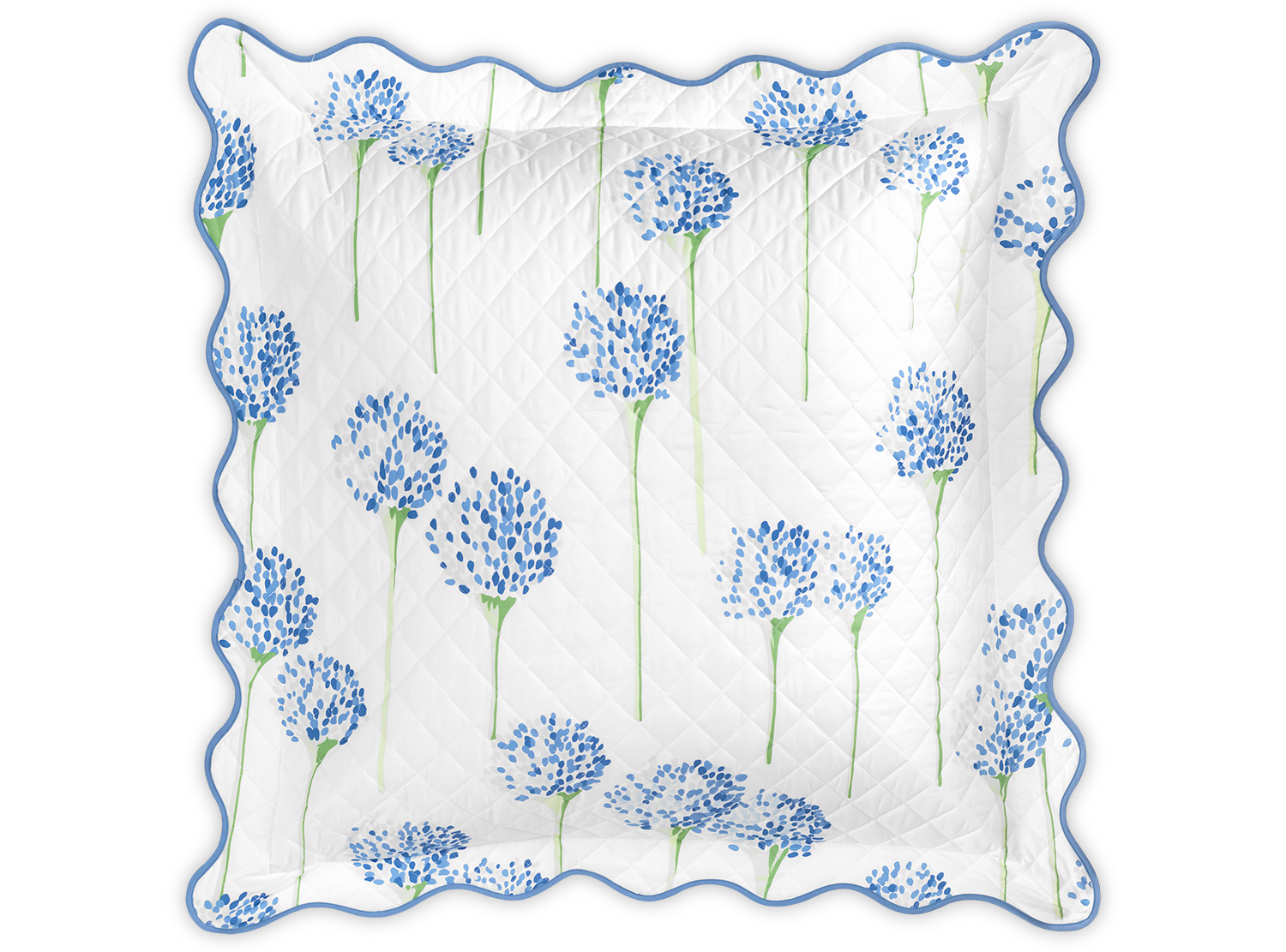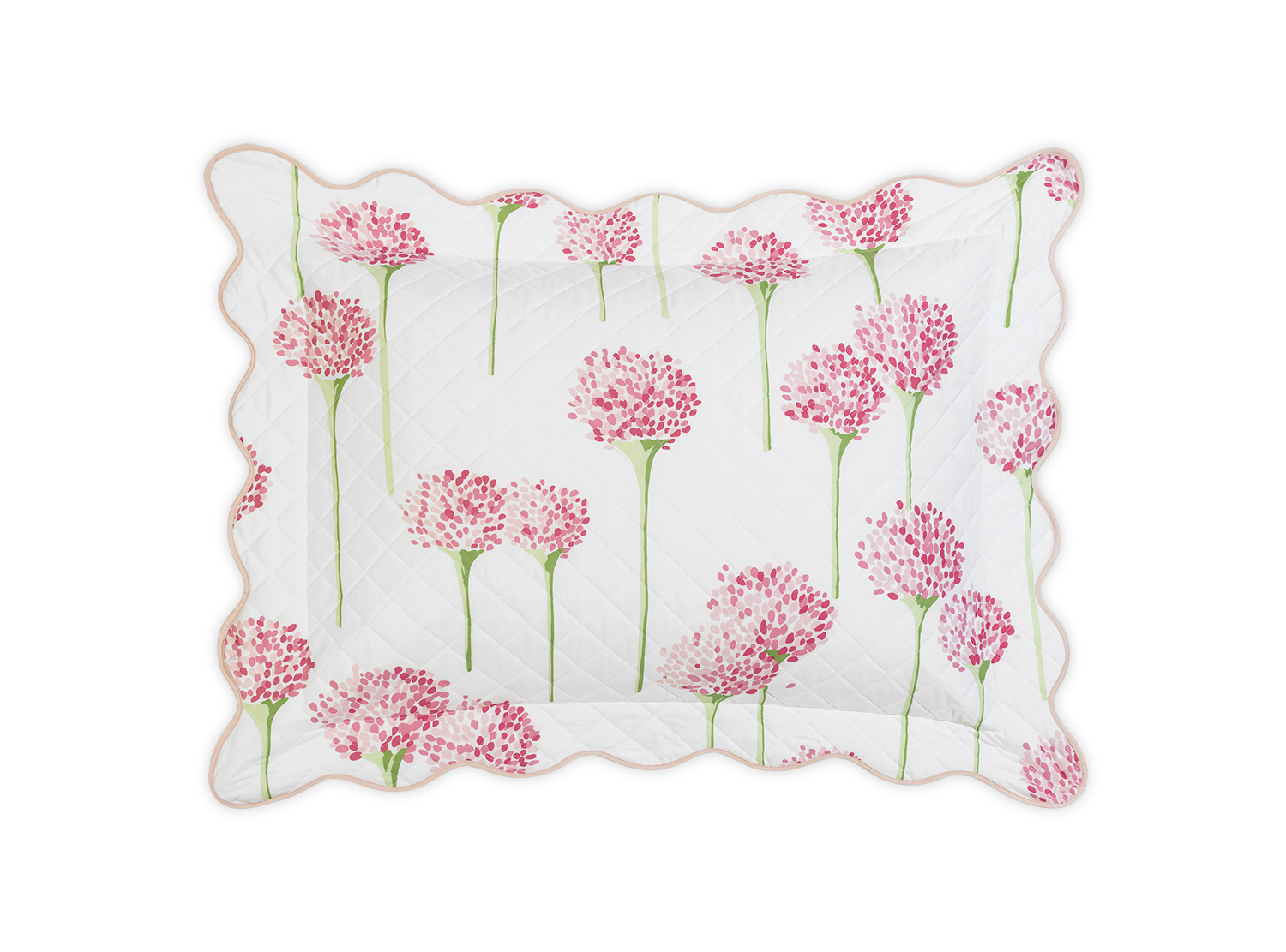 Matouk's most popular pattern in collaboration with artist Lulu de Kwiatkowski features happy, vibrant allium flowers on Luca cotton percale that is quilted in a 2" diamond pattern and finished with a soft wavy scallop edge.