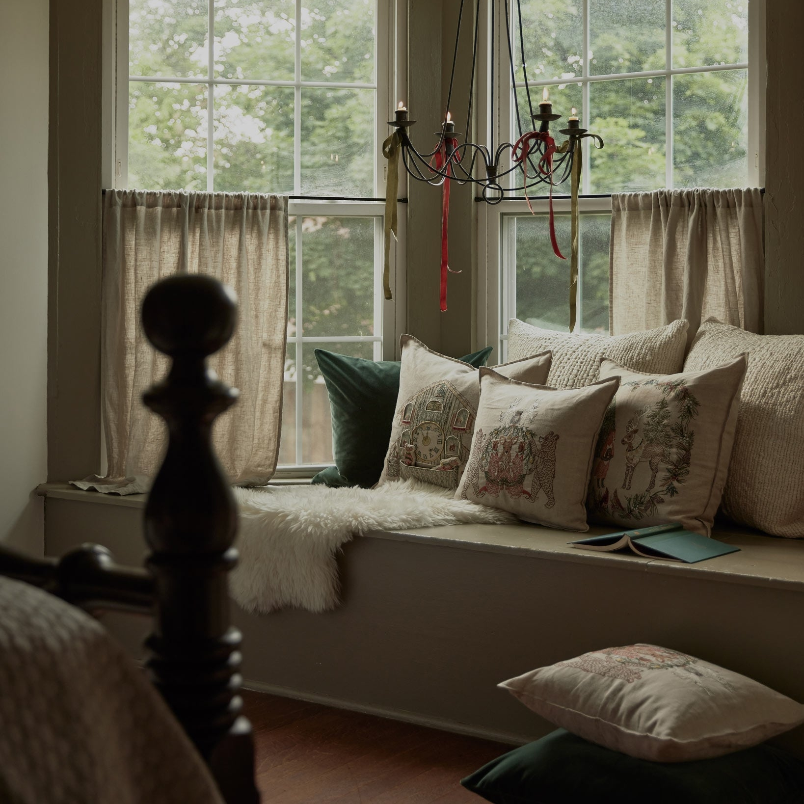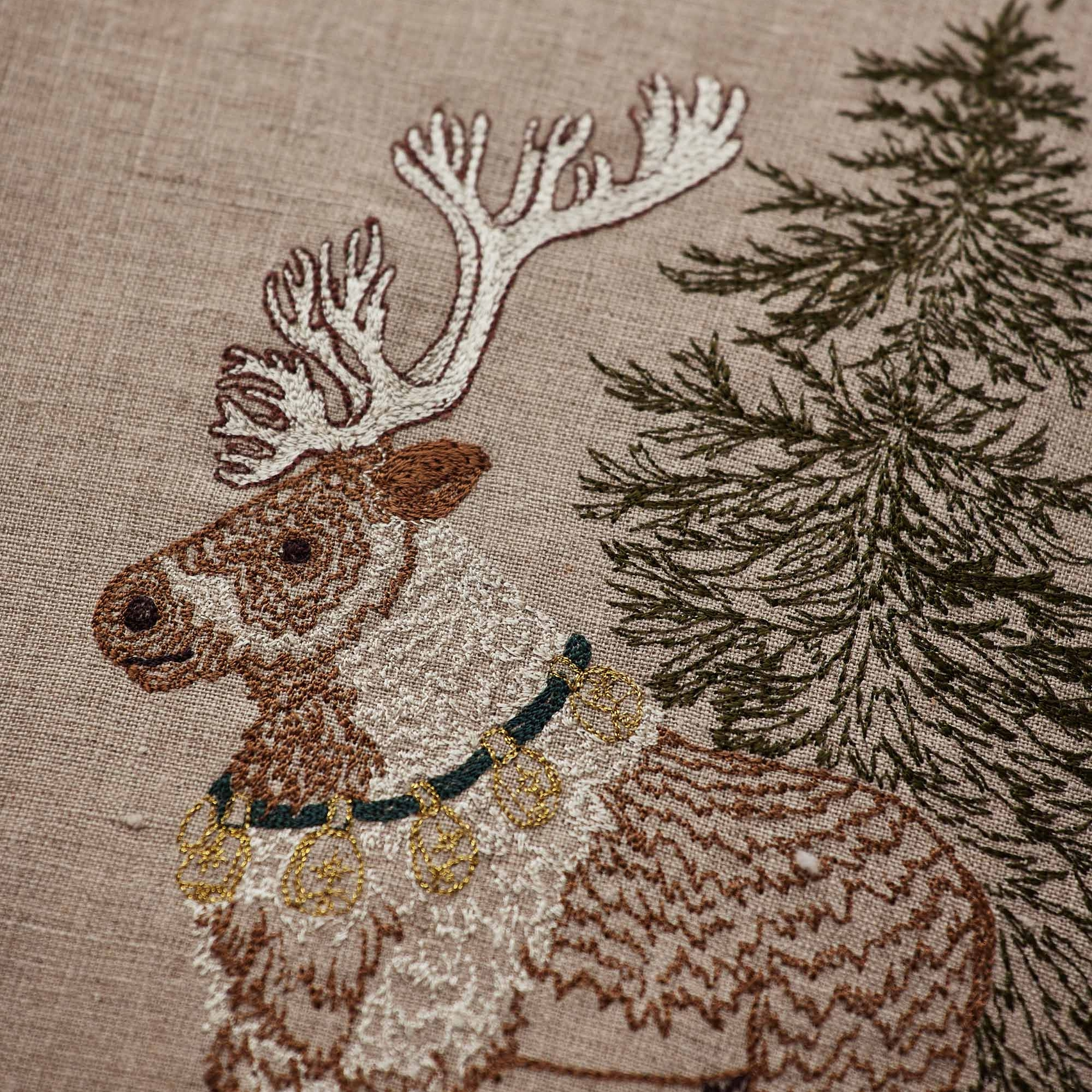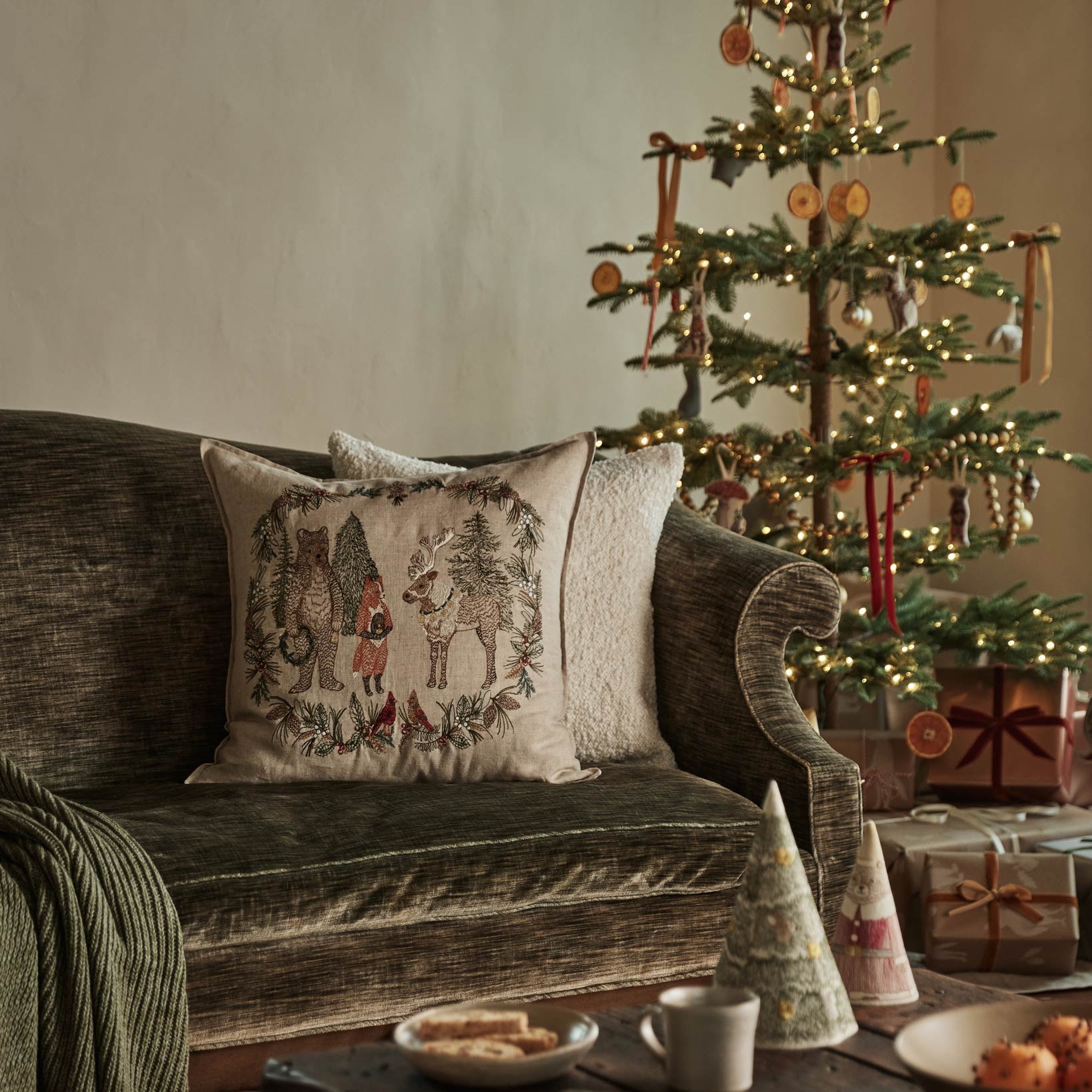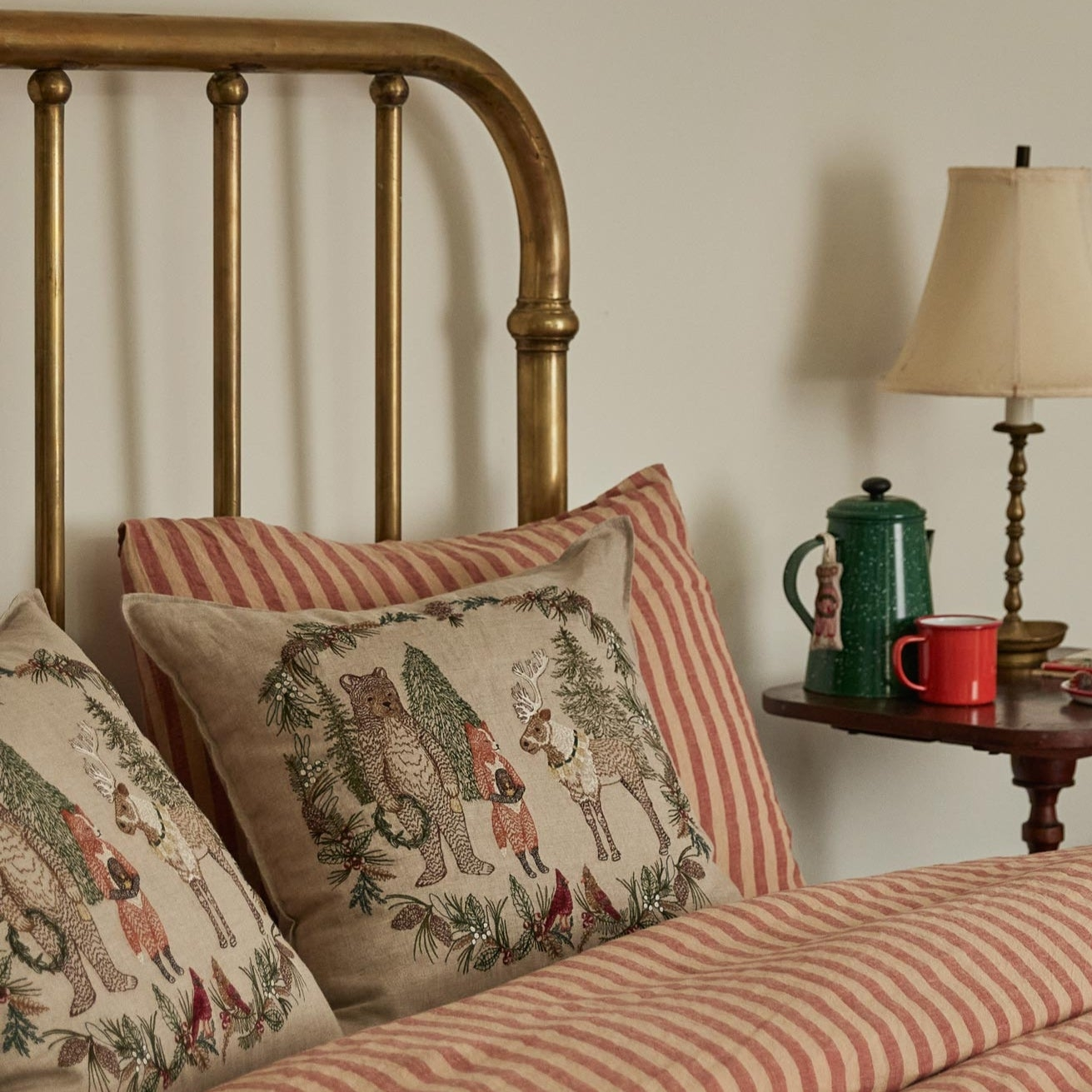 Christmas Cheer illustrates a gathering of wondrous woodland dwellers in a conifer forest. Bear, fox, reindeer, and hedgehog come together, framed by an evergreen wreath with pinecones and cardinals. Bring a little Christmas Cheer to your home when decorating with our holiday pillow.