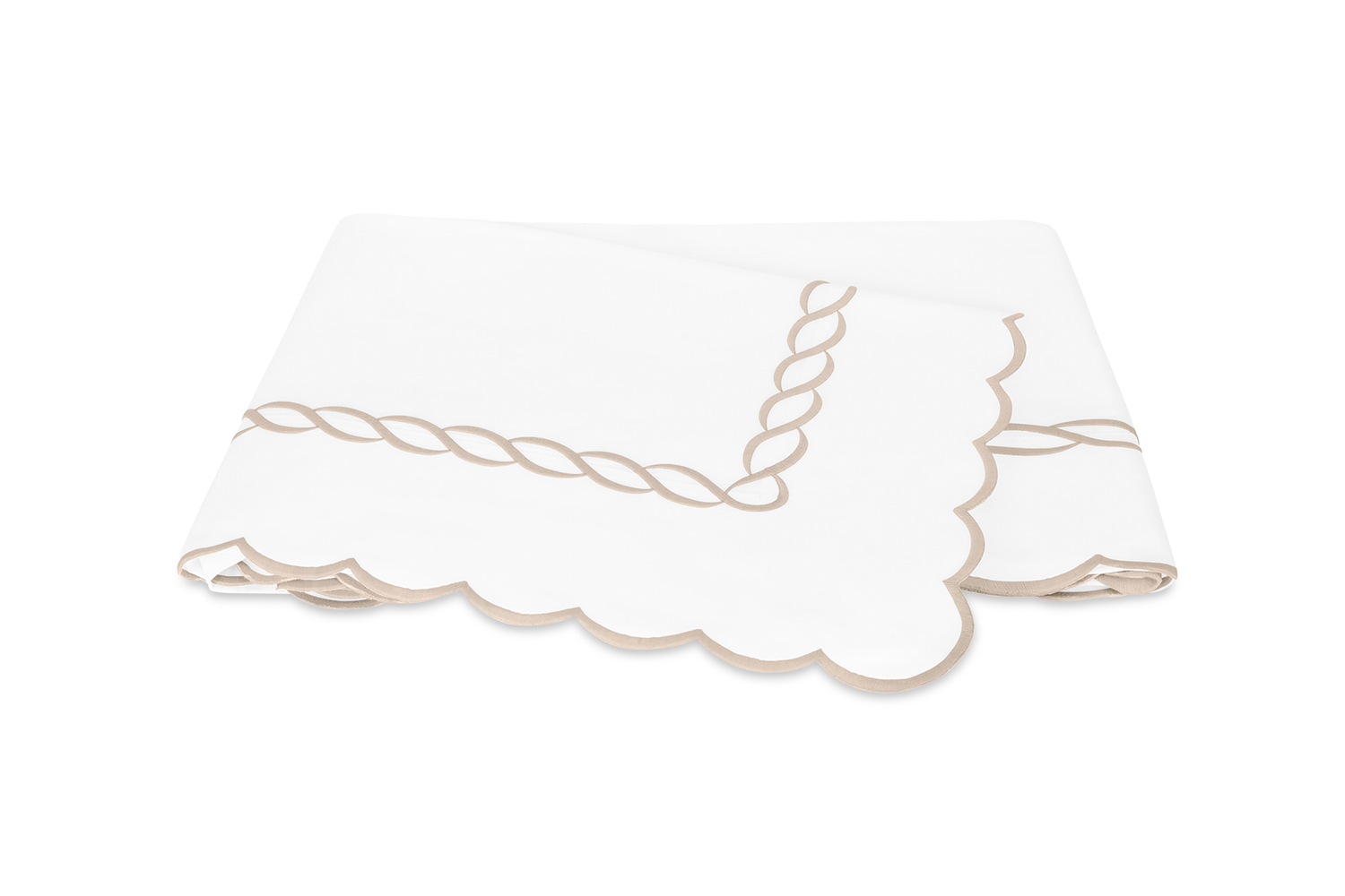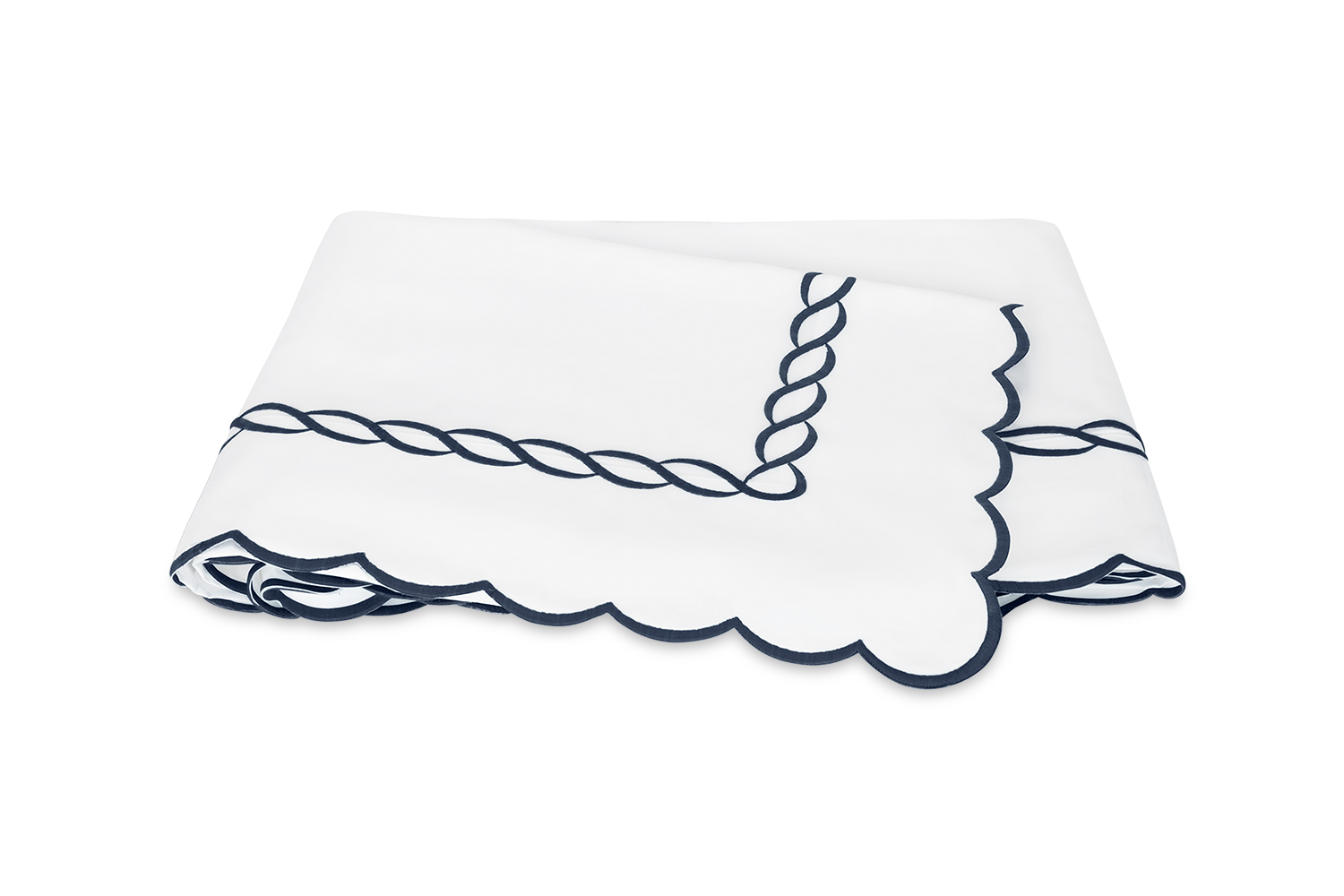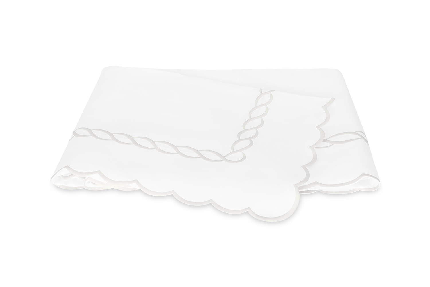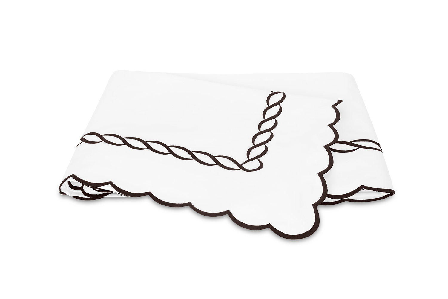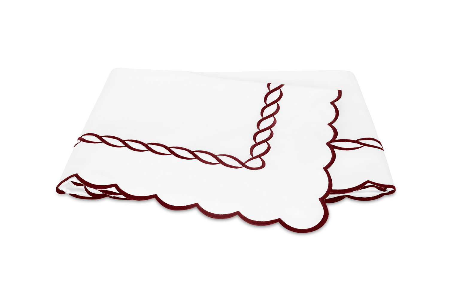 Matouk's popular Classic Chain embroidery is paired with equally popular scallop embroidered edge for a striking combination of crisp white percale and beautiful embroidery color