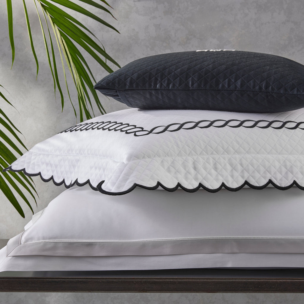 Petra diamond matelassé with Matouk's quintessential Classic Chain embroidery and scalloped finished edges
