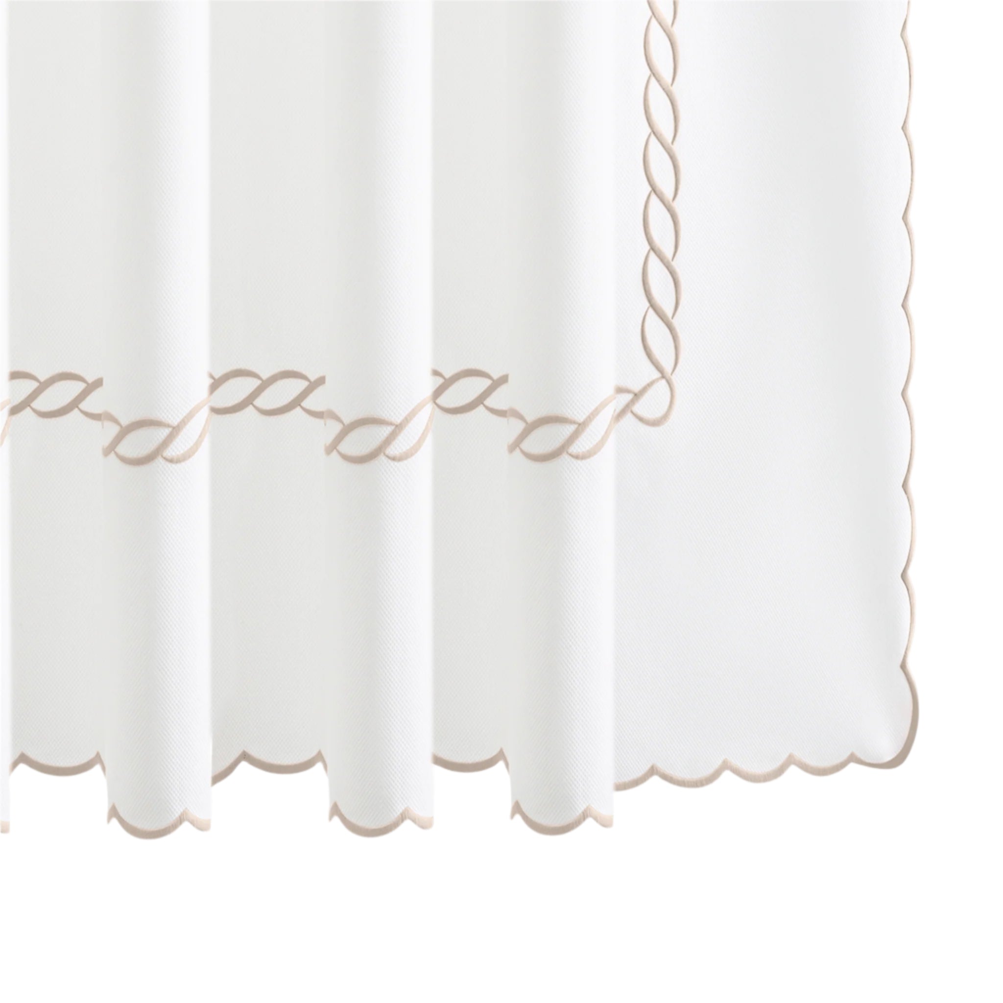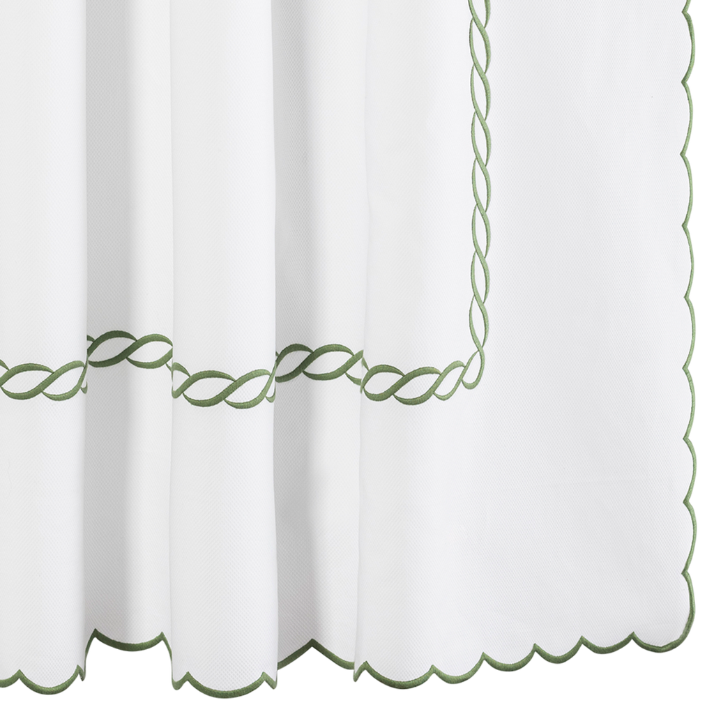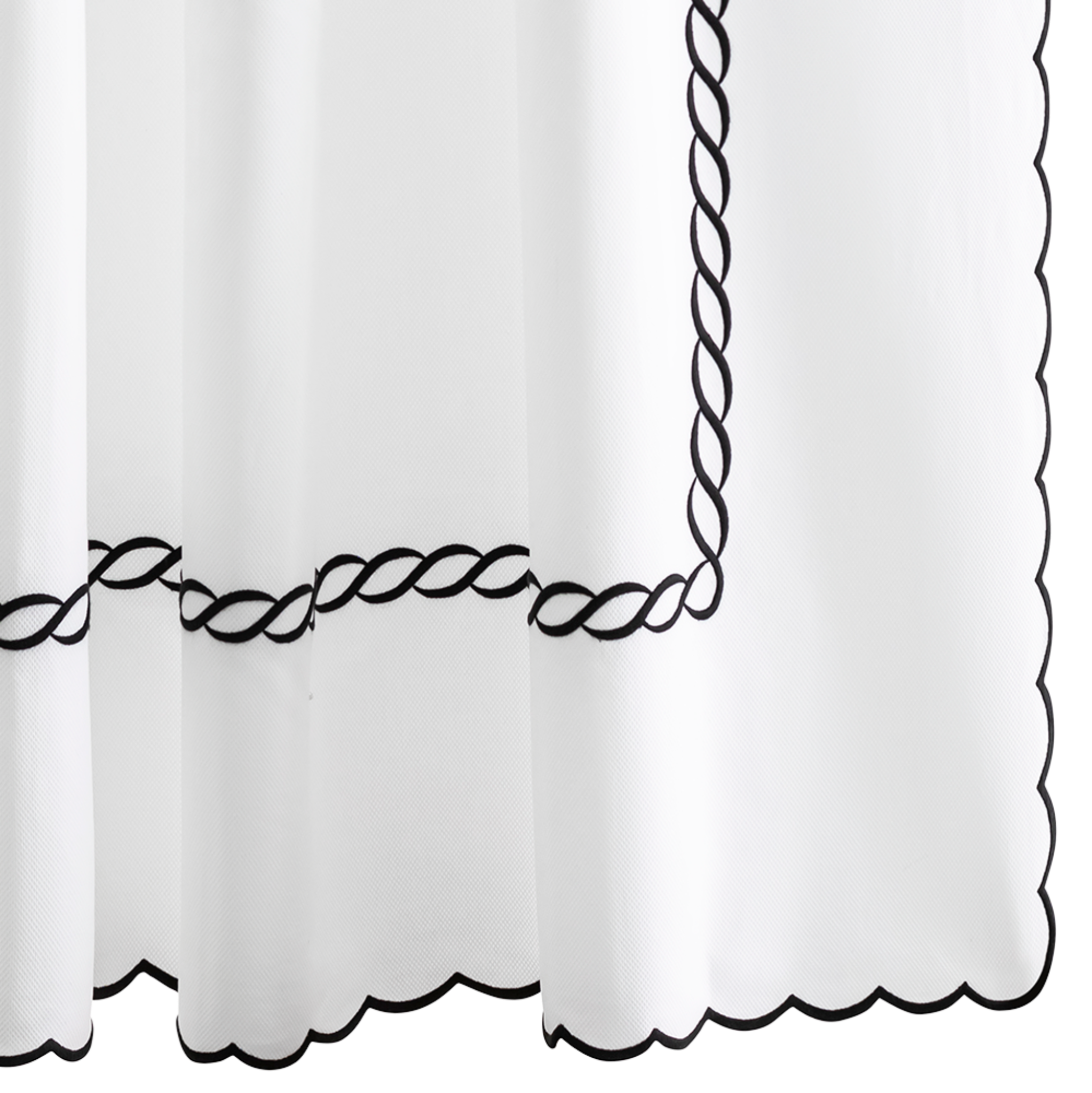Classic Chain Scallop shower curtains offer quality, beauty, and a timeless design. A continuous chain of meticulous embroidery complements the 100% cotton white pique fabric. That same color embroidery is then used to complete the scalloped design on the edges of the shower curtain, completing this traditional look.