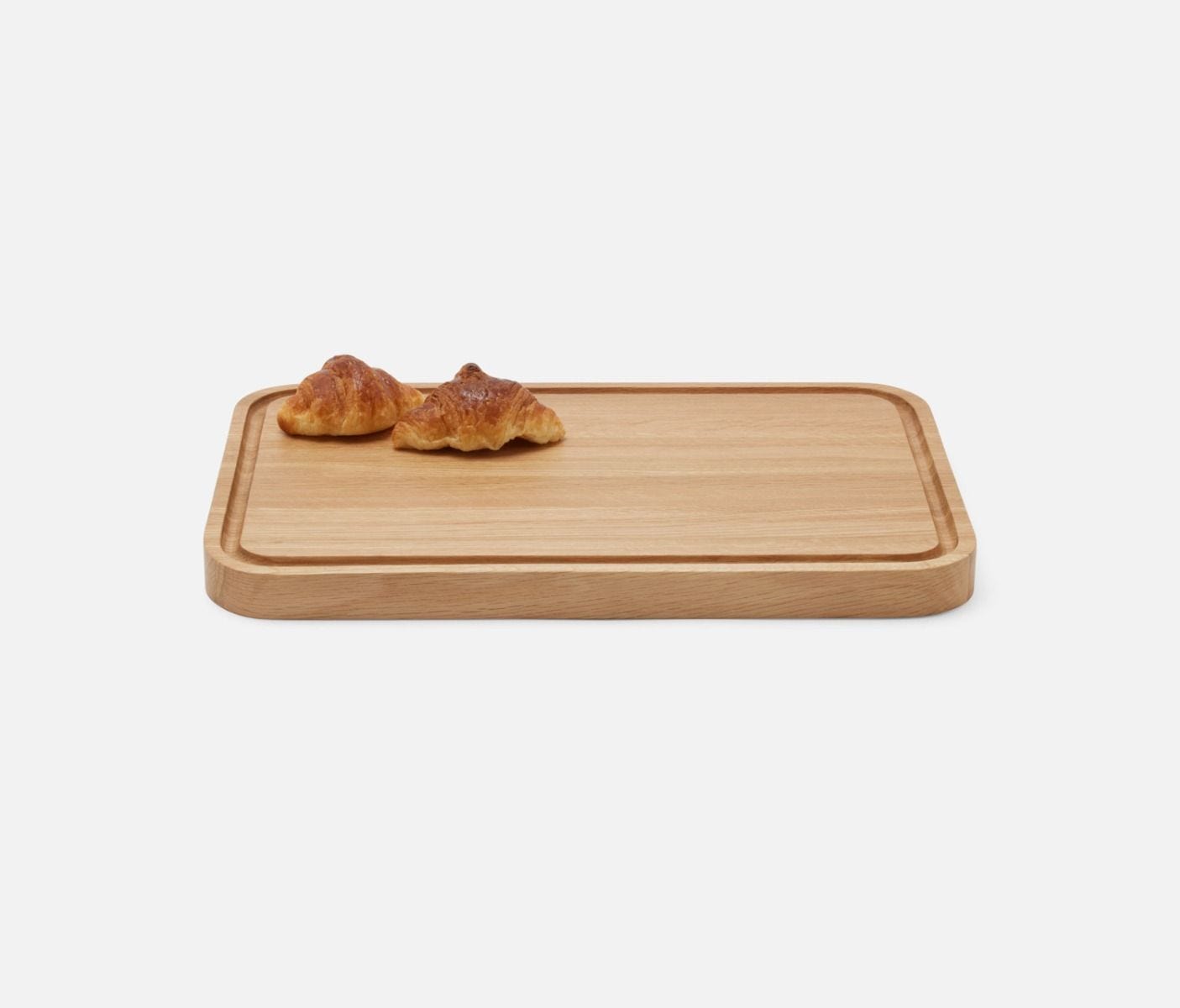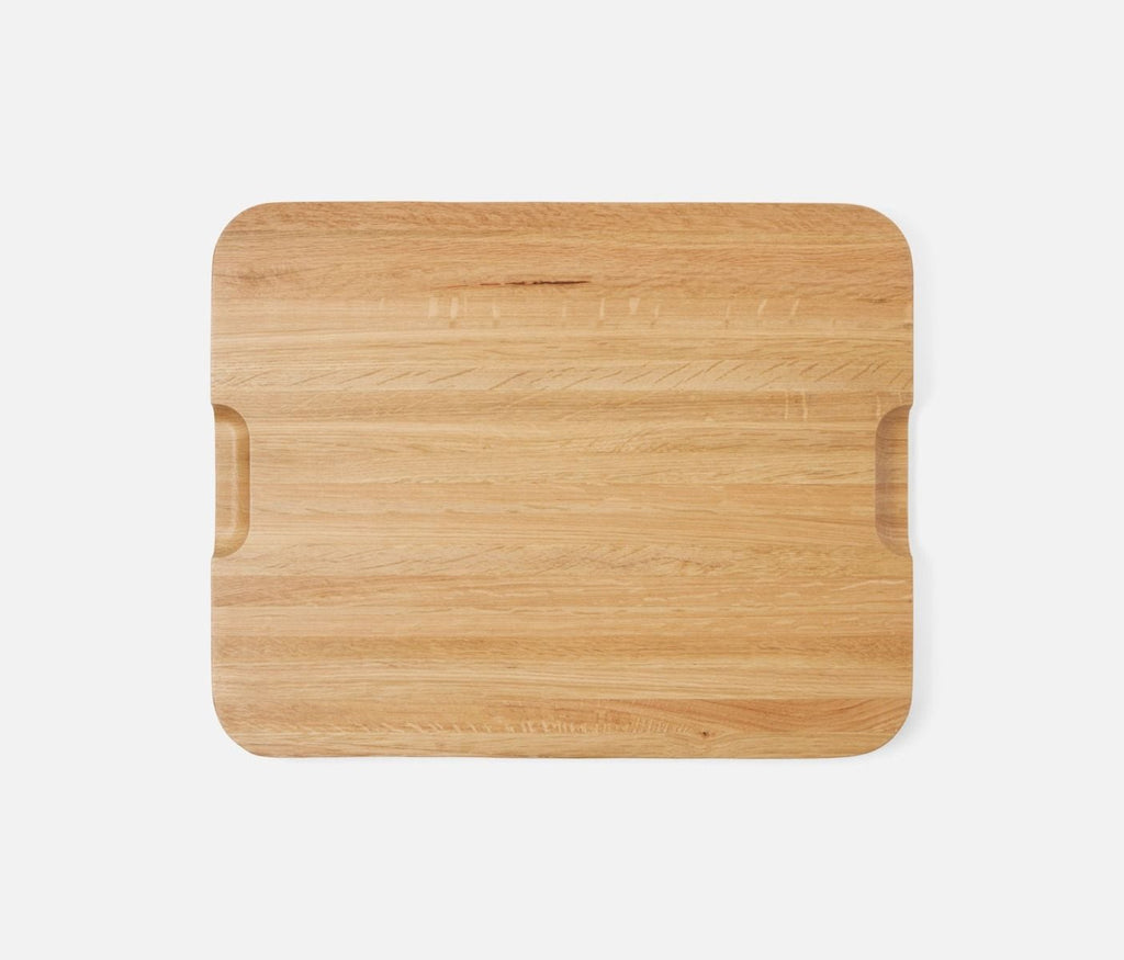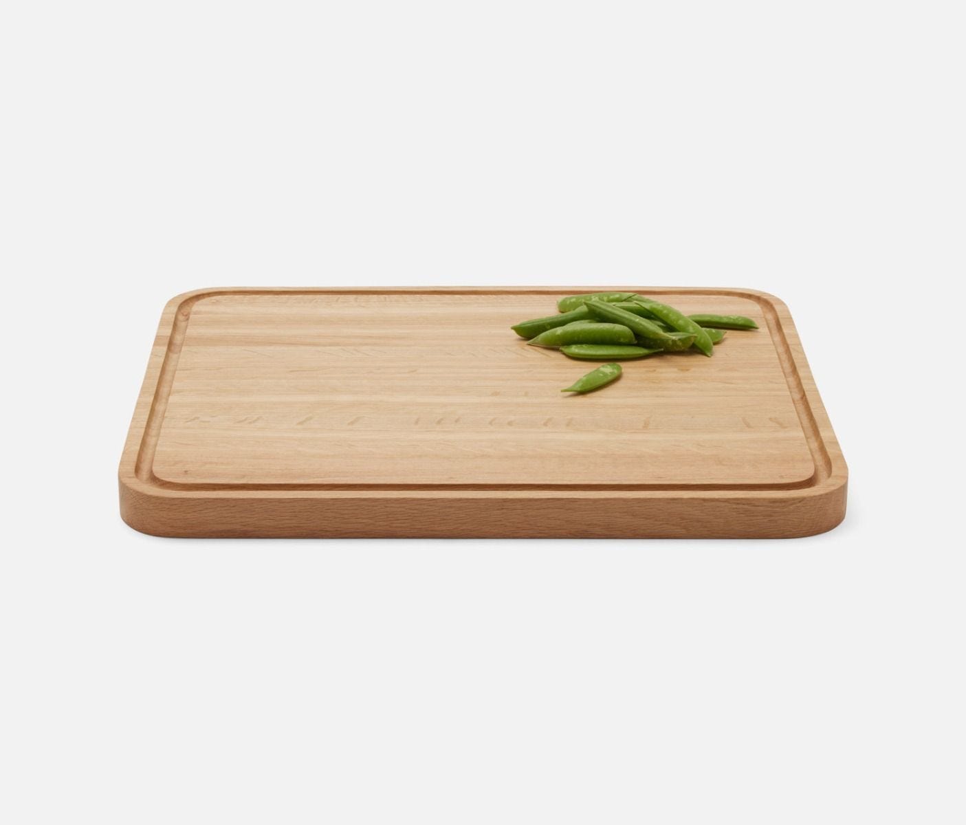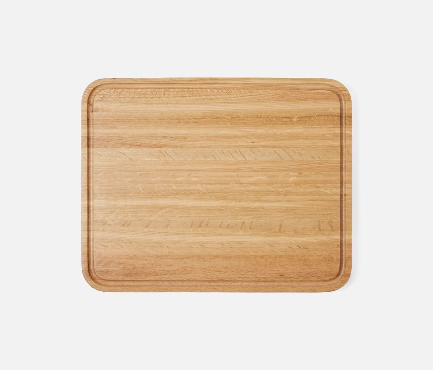 - Warm natural oak wood carving board with indentation around the perimeter to capture juices