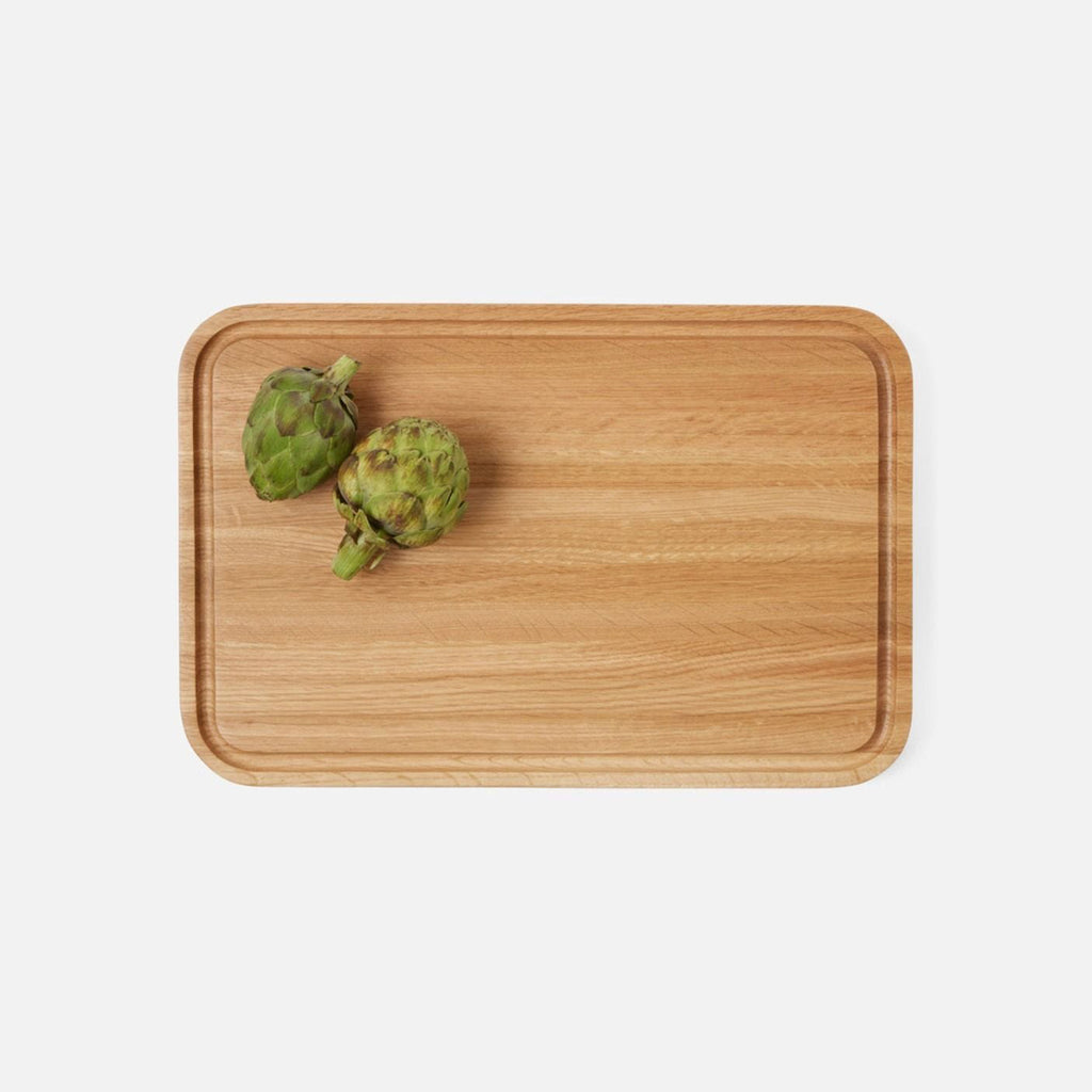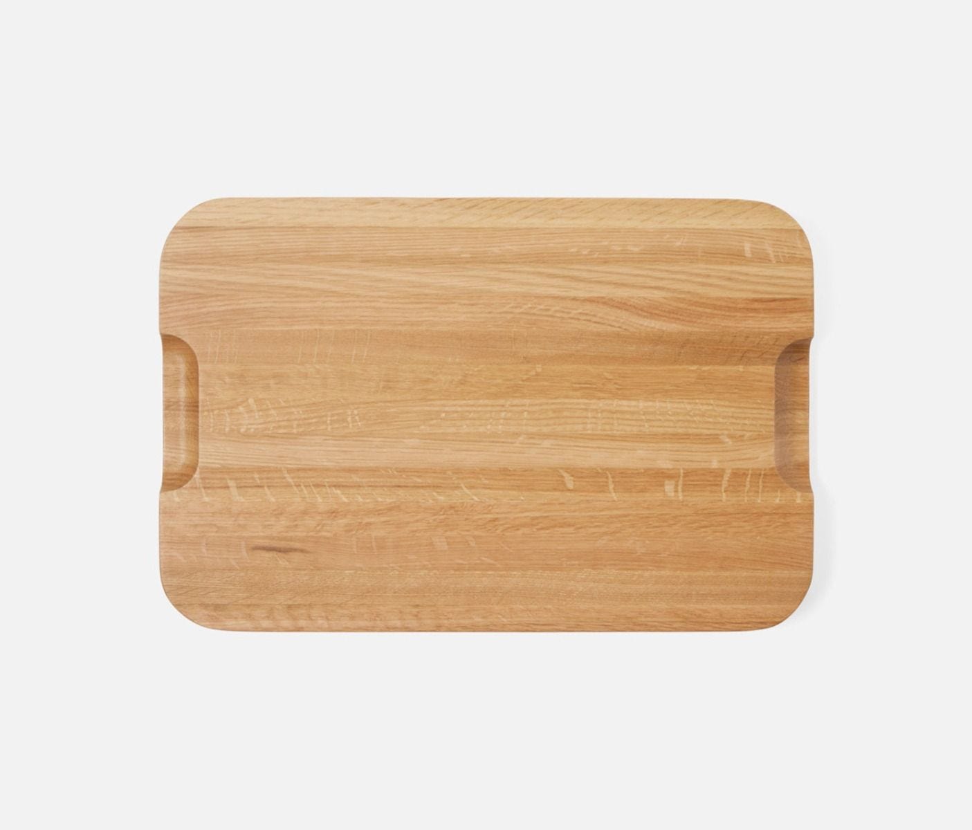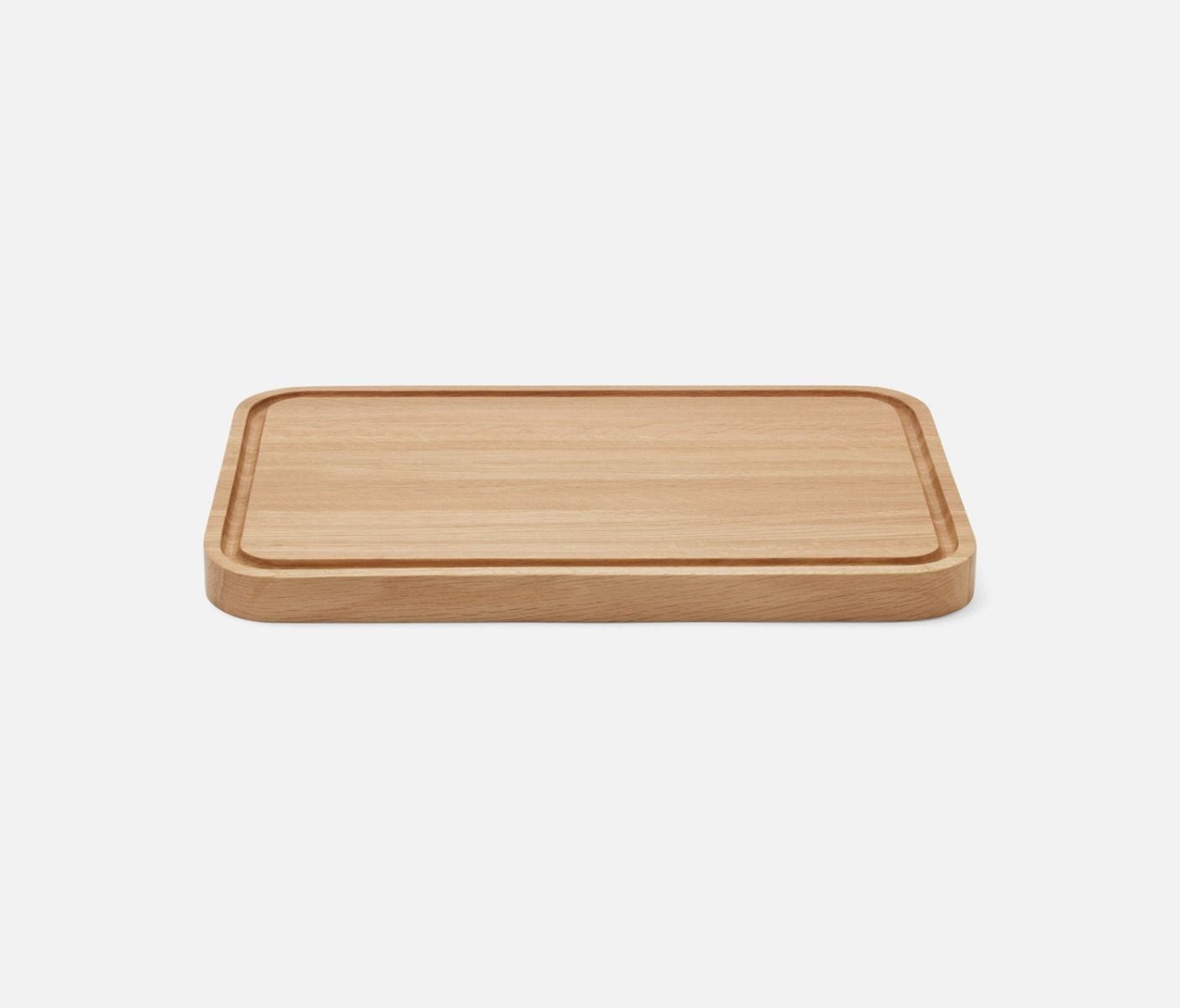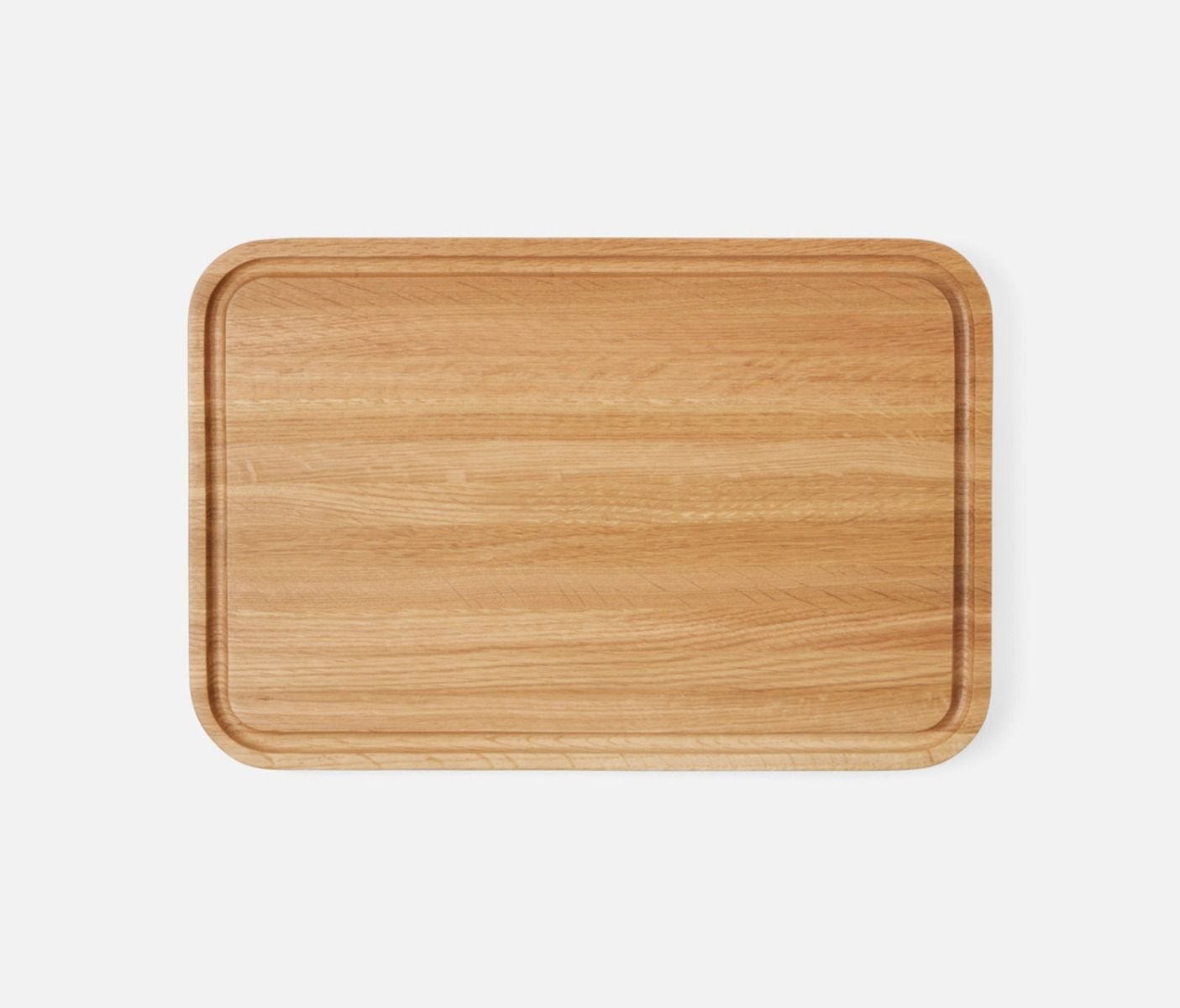 - Warm natural oak wood carving board with indentation around the perimeter to capture juices