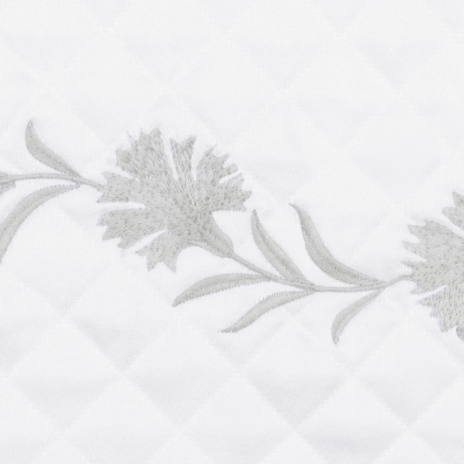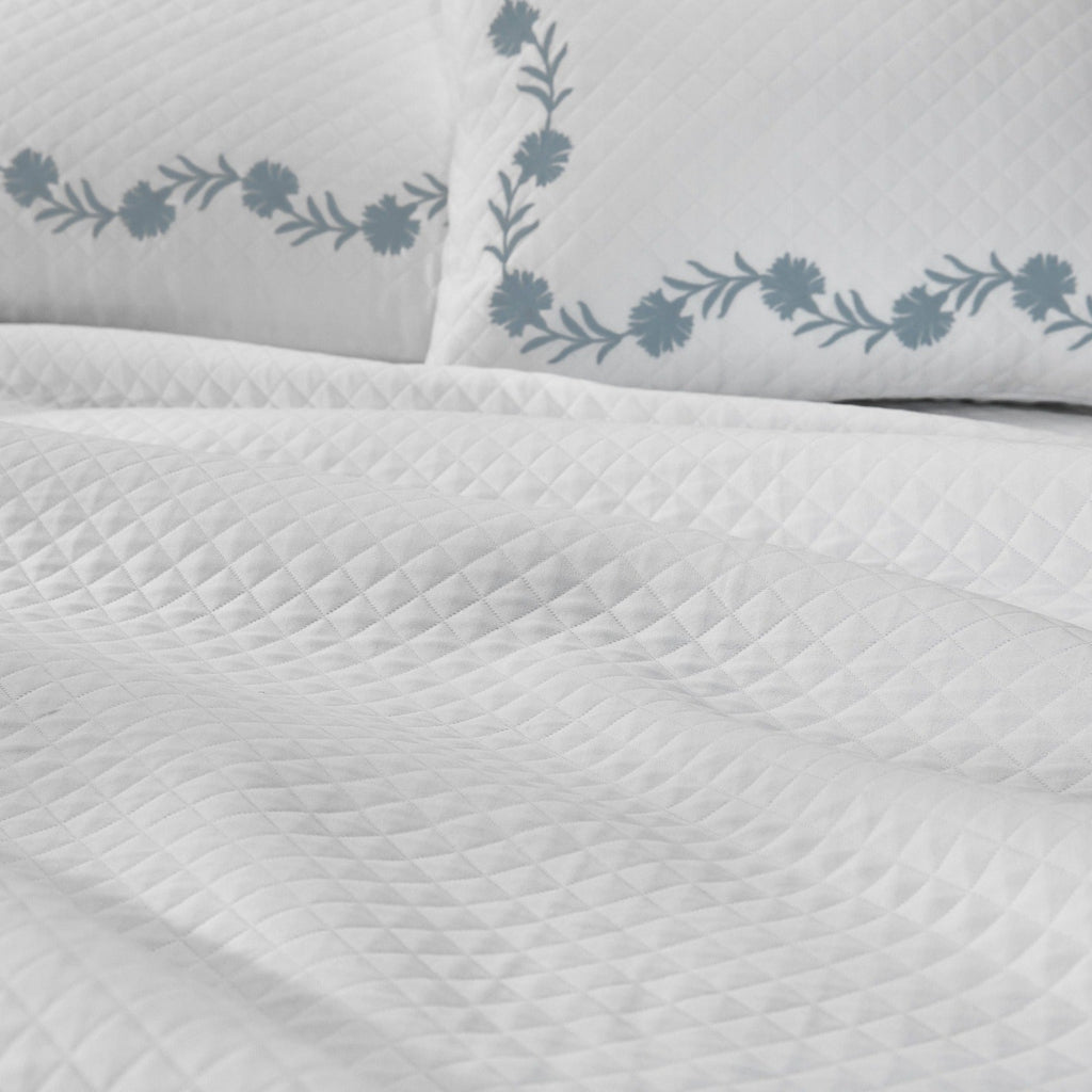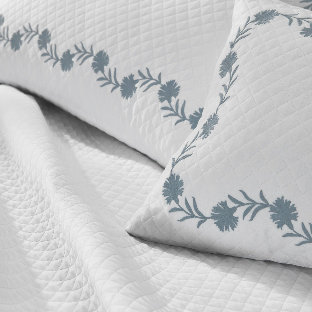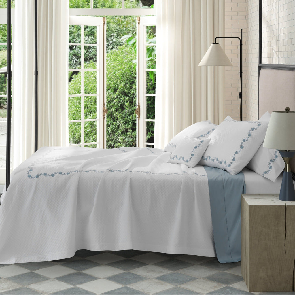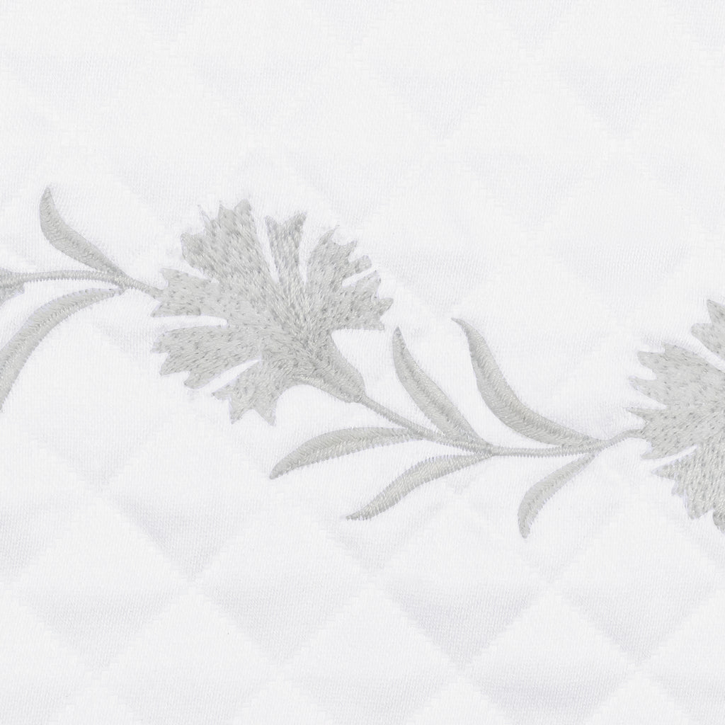 Embroidered daphne flowers create a classic style on Matouk's luxury diamond matelassé