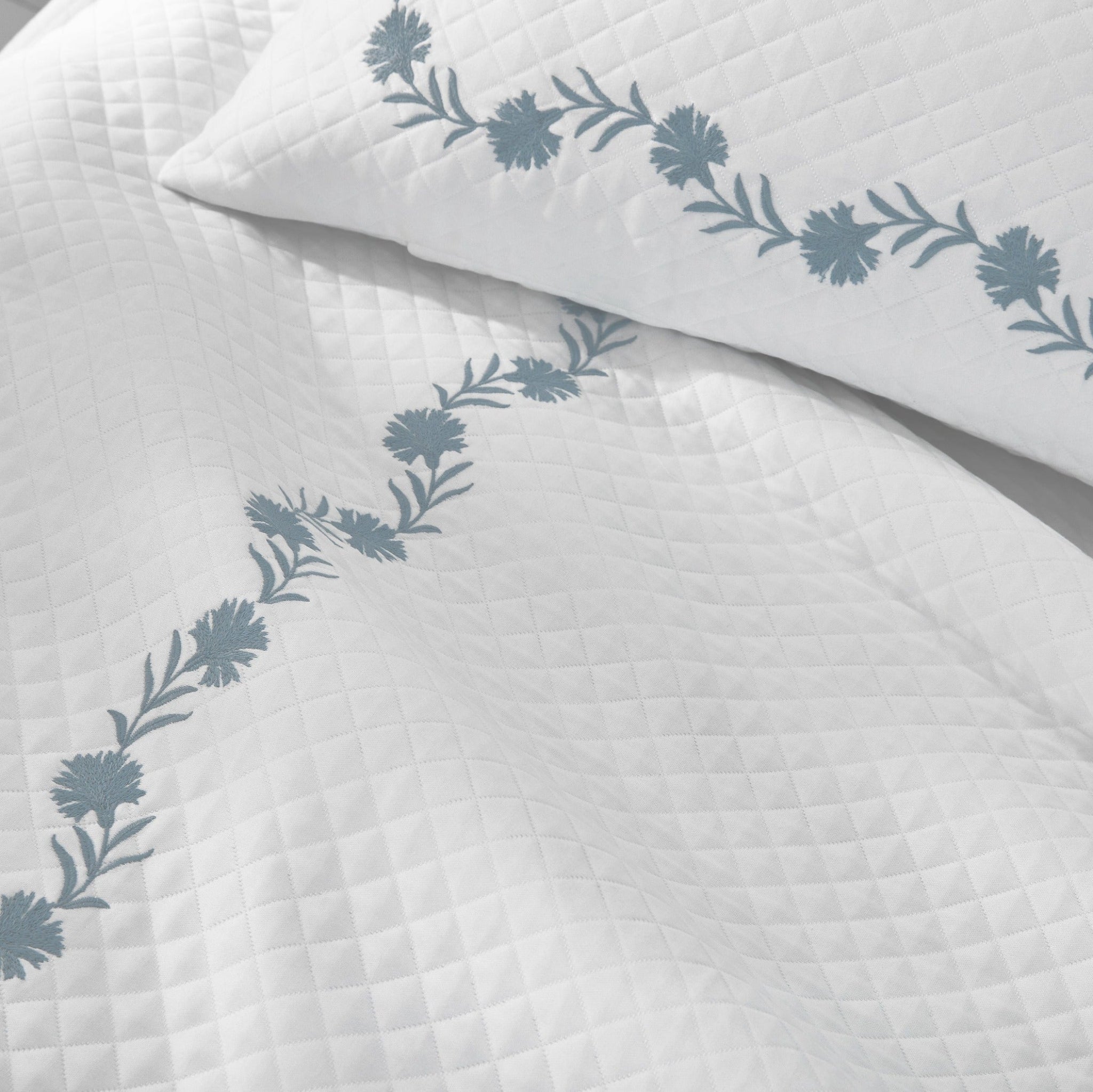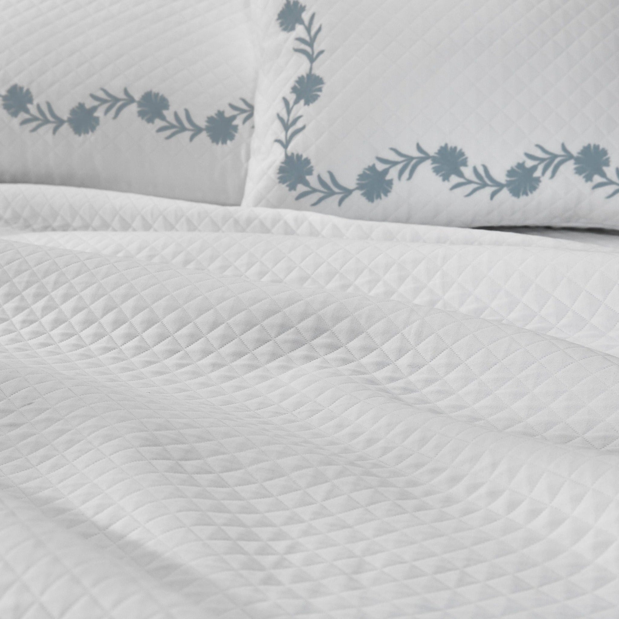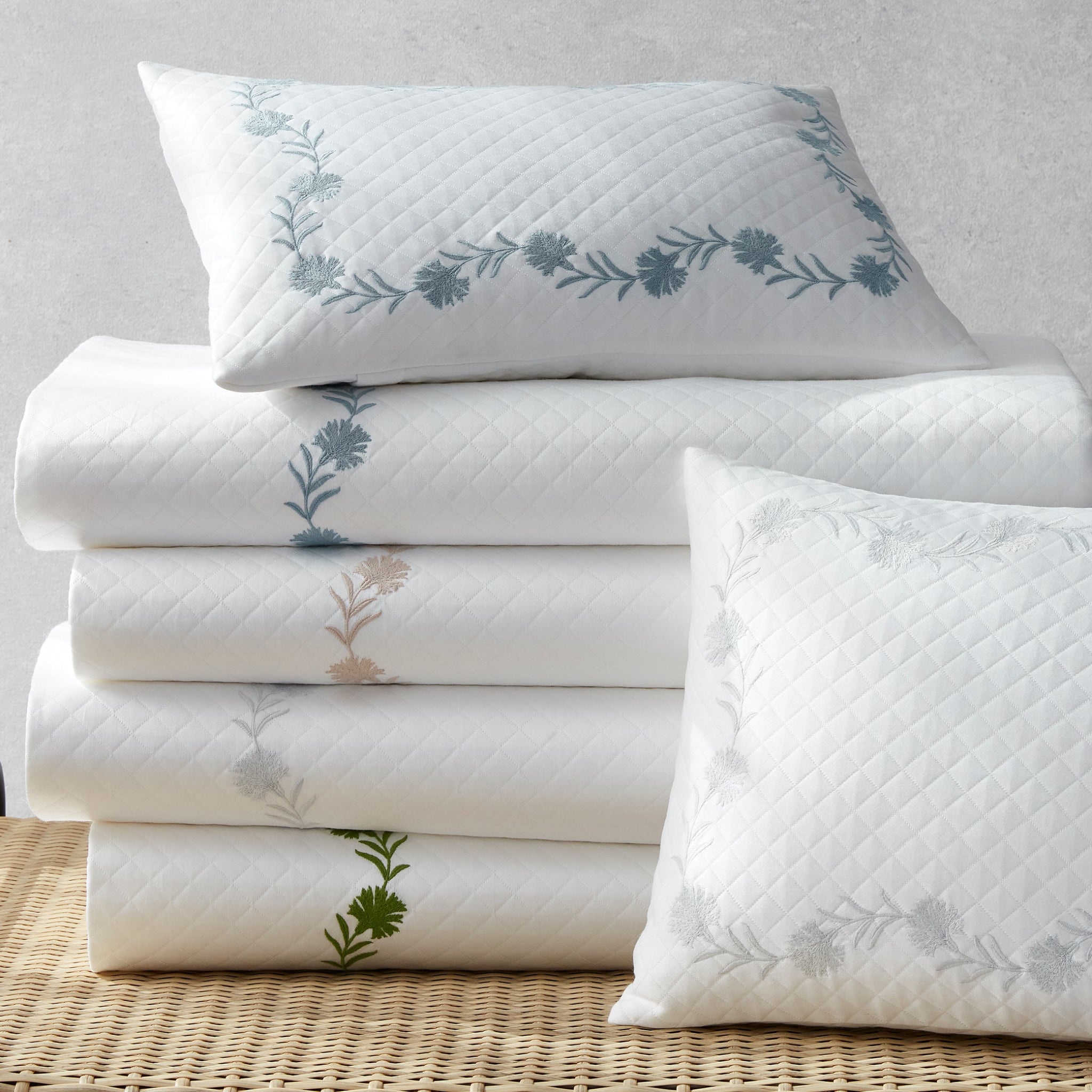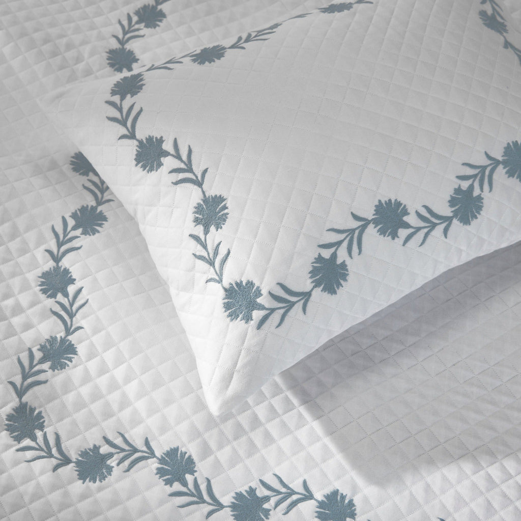Embroidered daphne flowers create a classic style on Matouk's luxury diamond matelassé