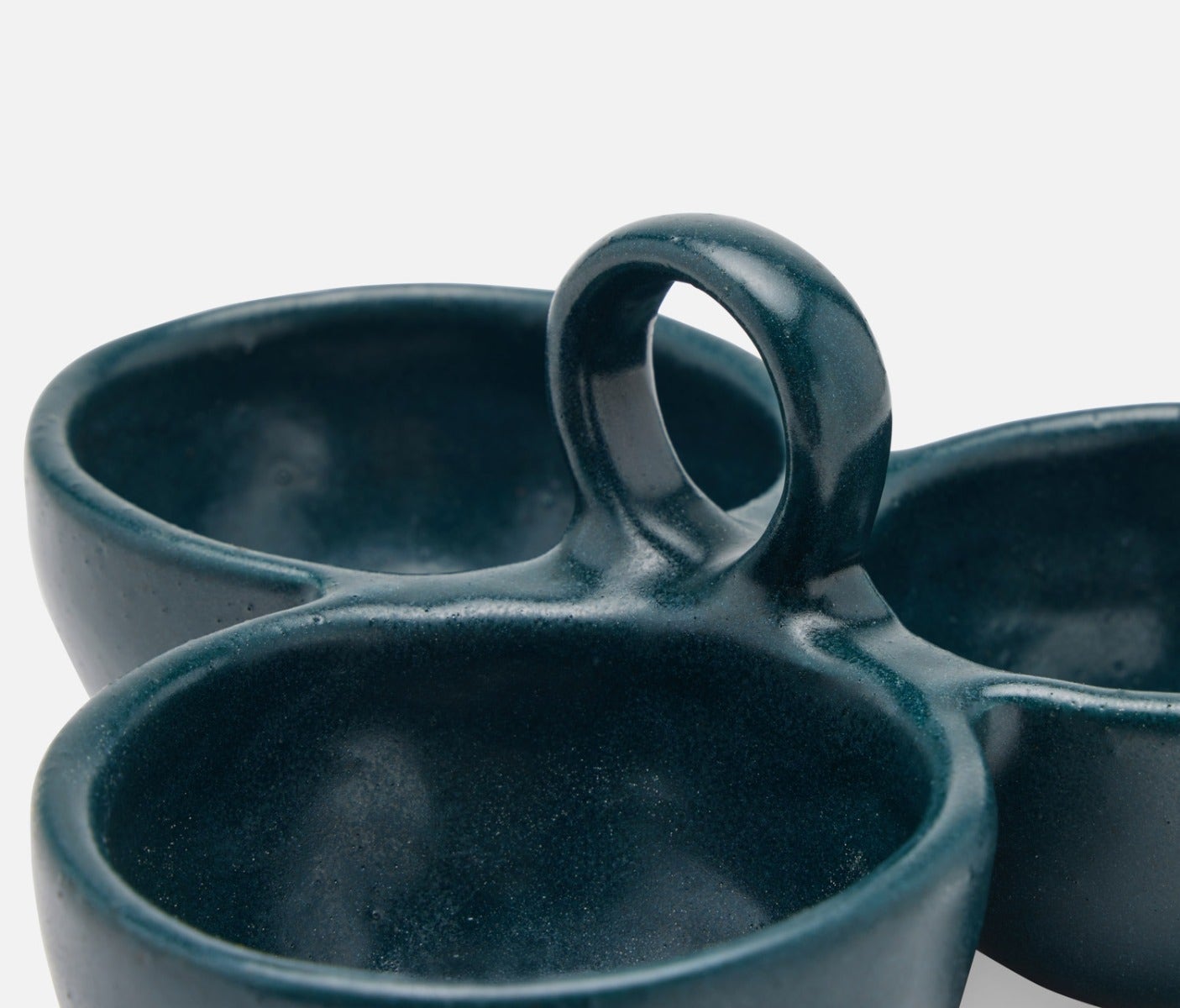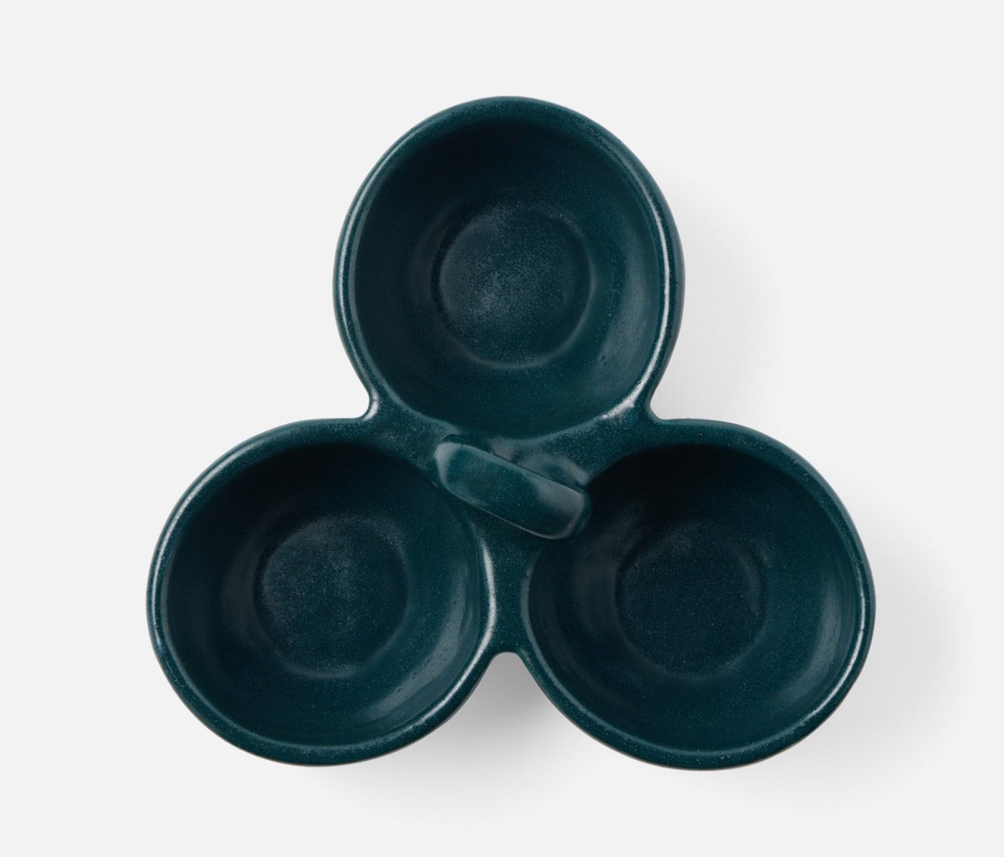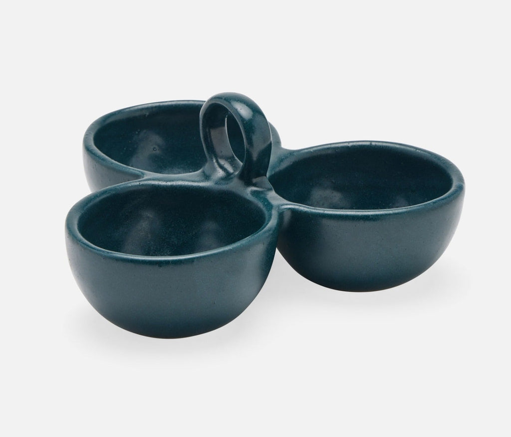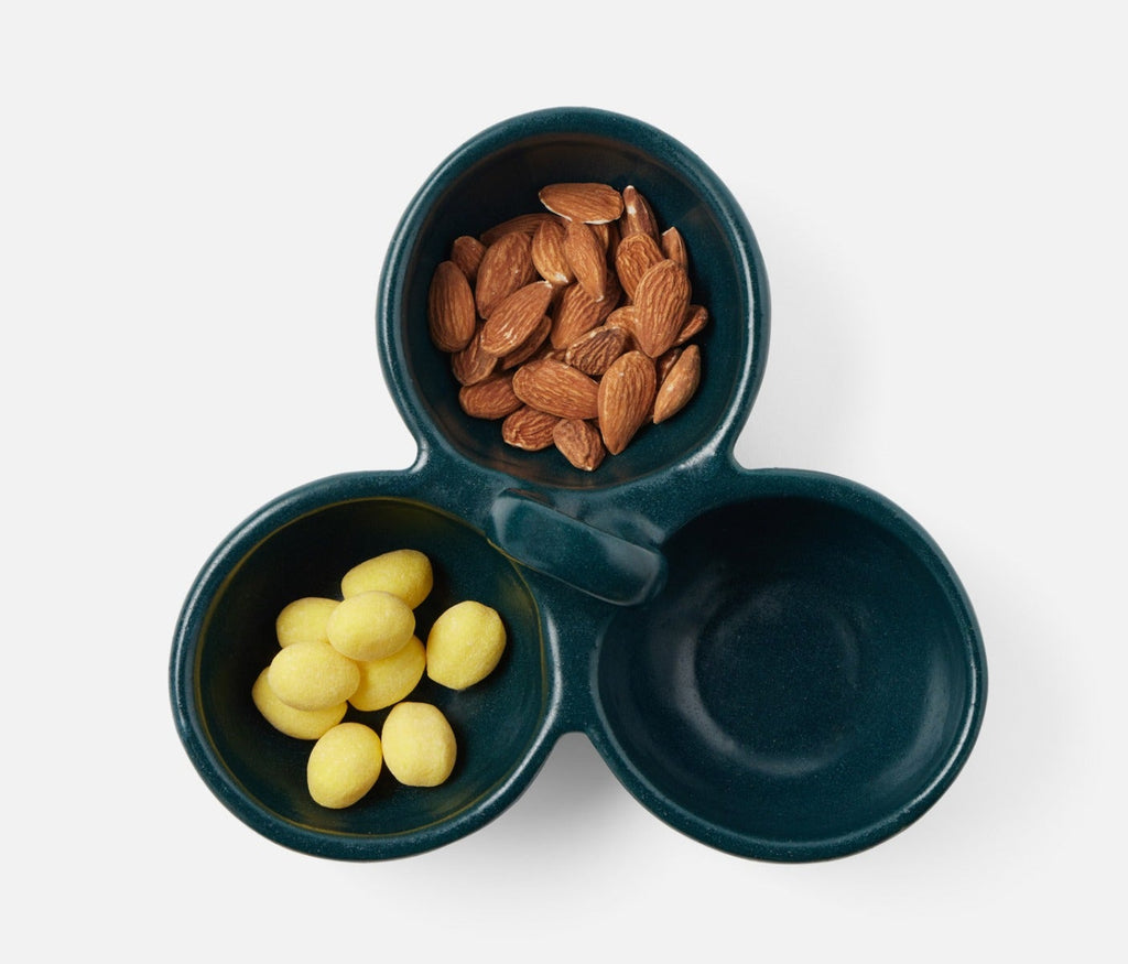 • Midnight Teal Glaze triple bowl nut dish for serving condiments, snacks, and sides
