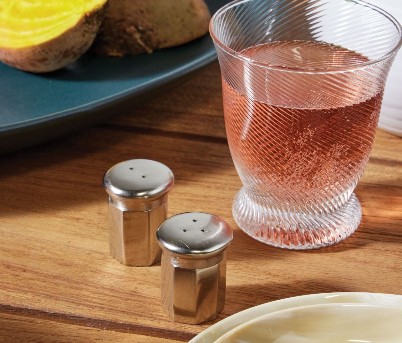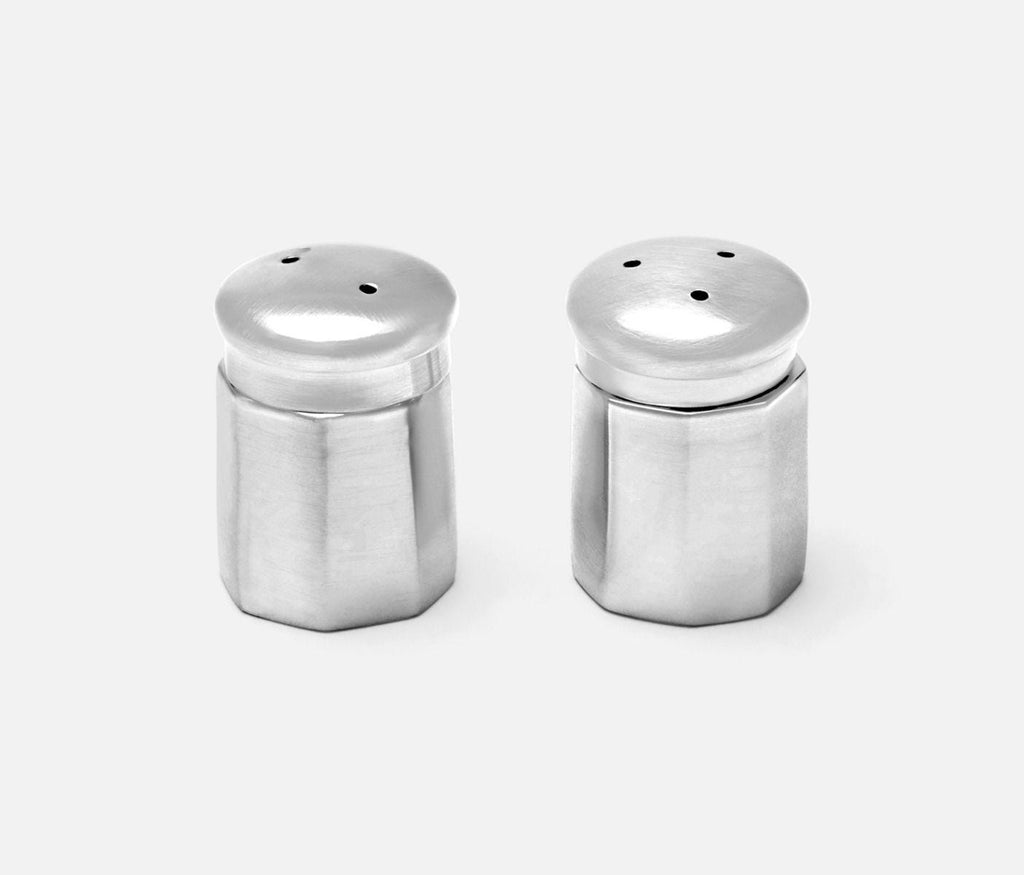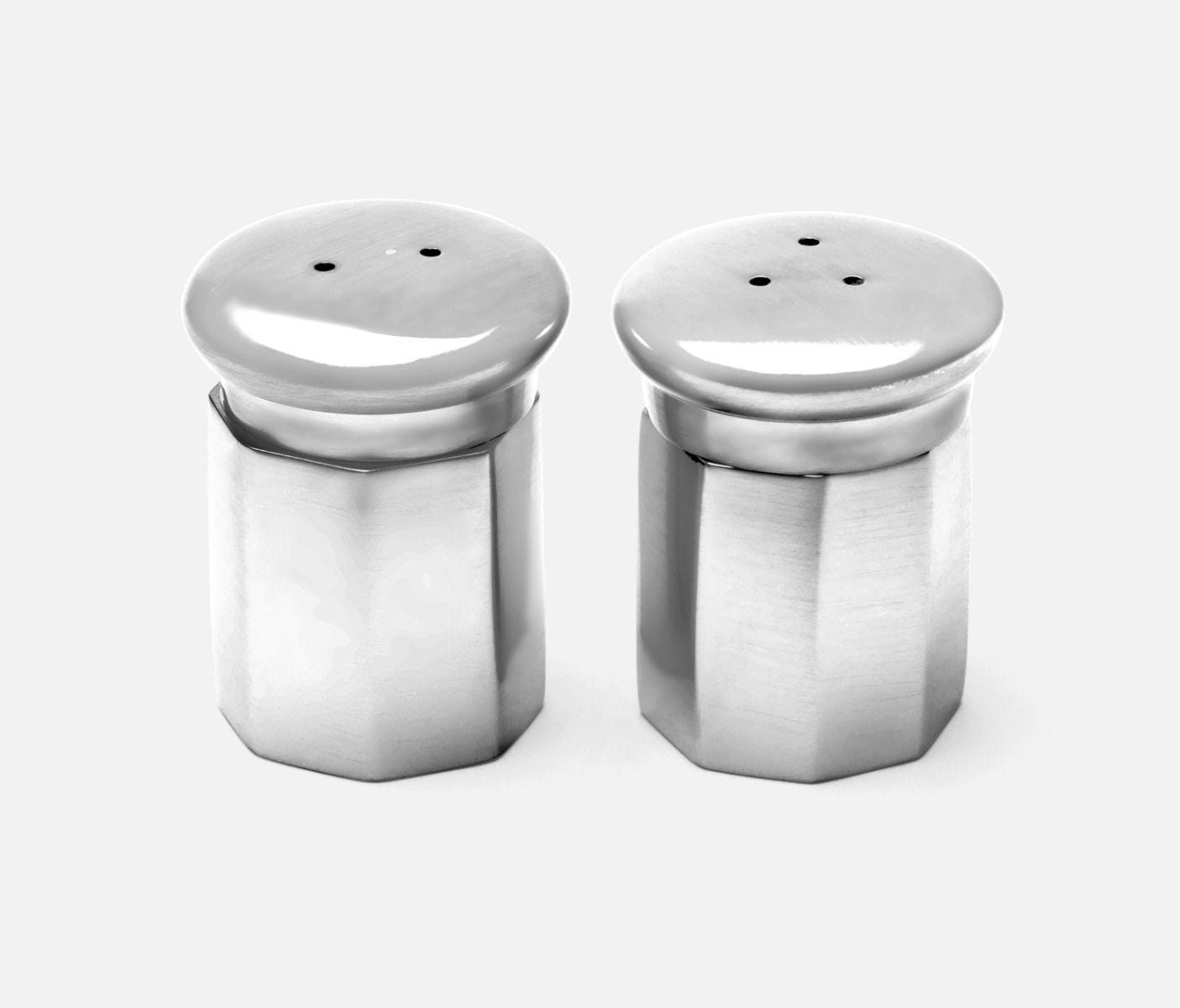 • Brass salt and pepper shakers with round tops and faceted sides. Classic set with glamorous polished silver pewter finish and choice of size.