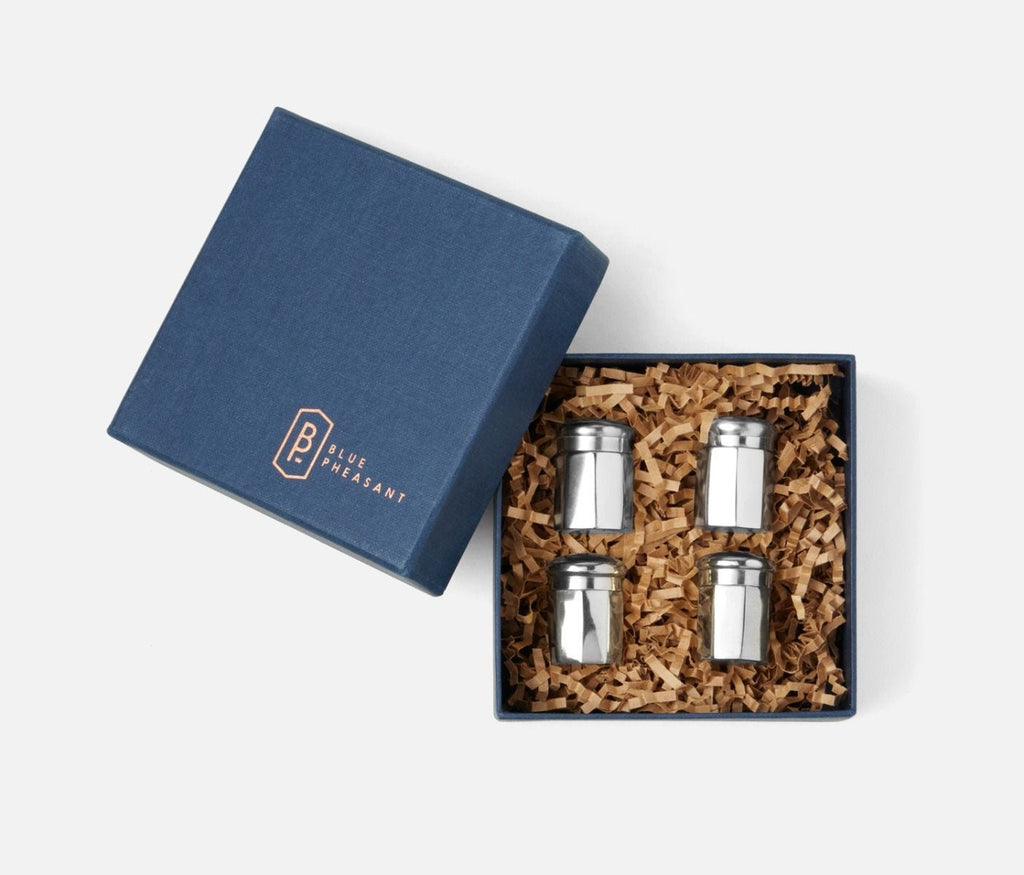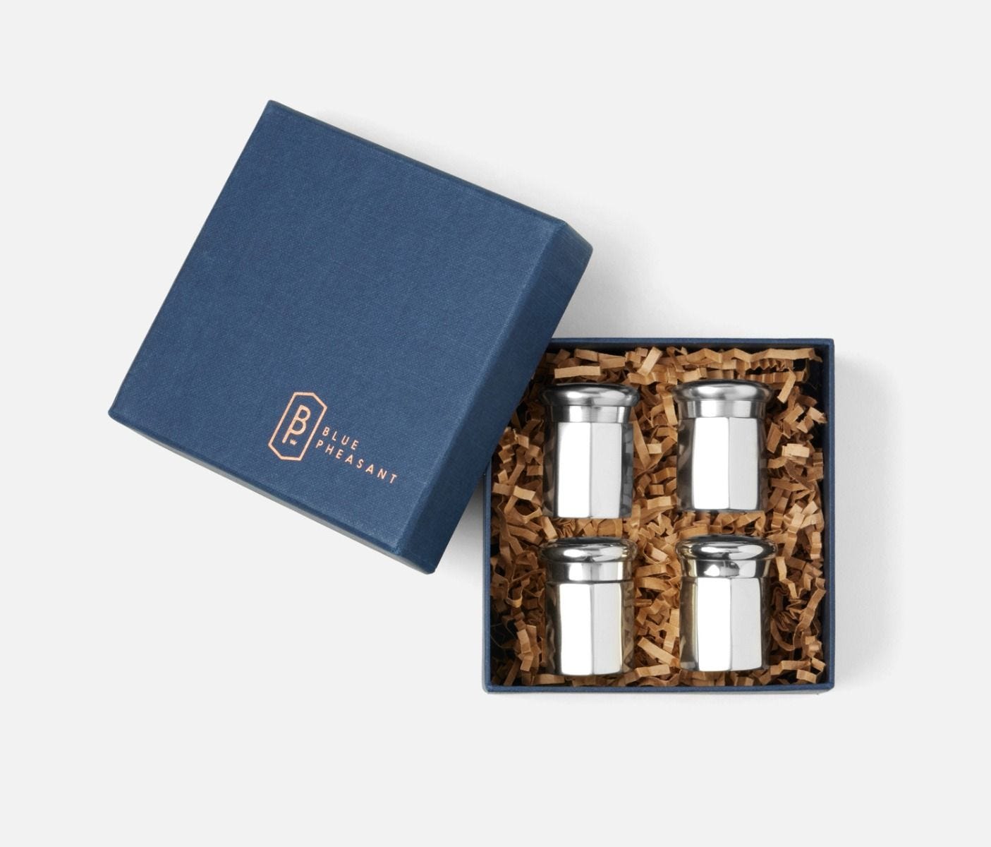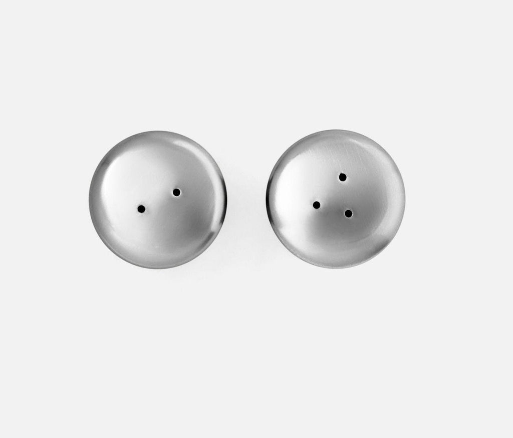 • Brass salt and pepper shakers with round tops and faceted sides. Classic set with glamorous polished silver pewter finish and choice of size.