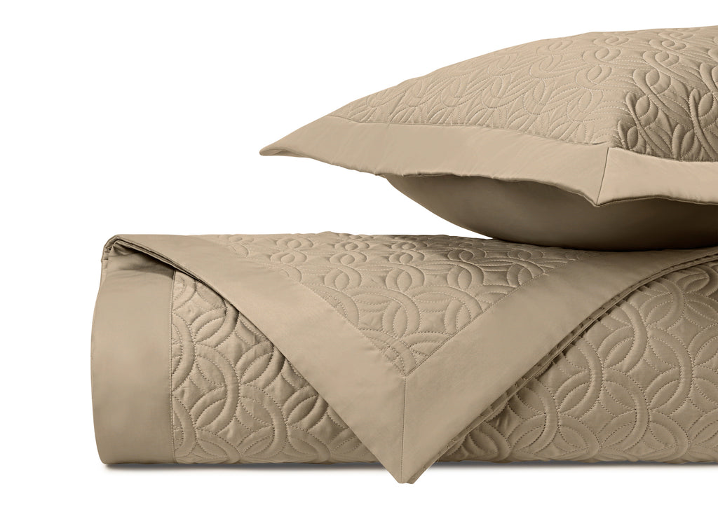 A touch of elegance, a bit of drama. Duomo Quilted Coverlets and Shams are quilted with overlapping circles, adding opulence to the polished bed. Home Treasures makes each piece in the USA to order, so customization of size, color, and details are always an option.
