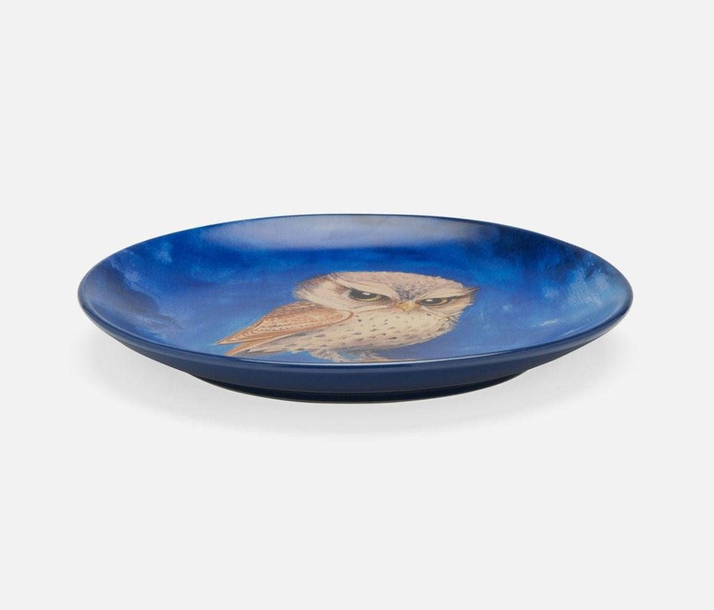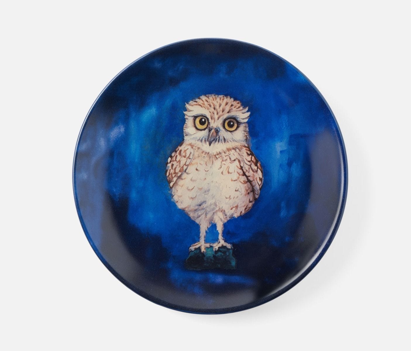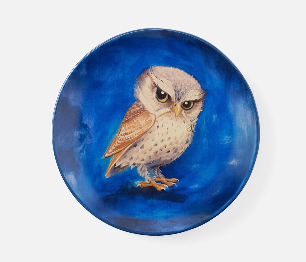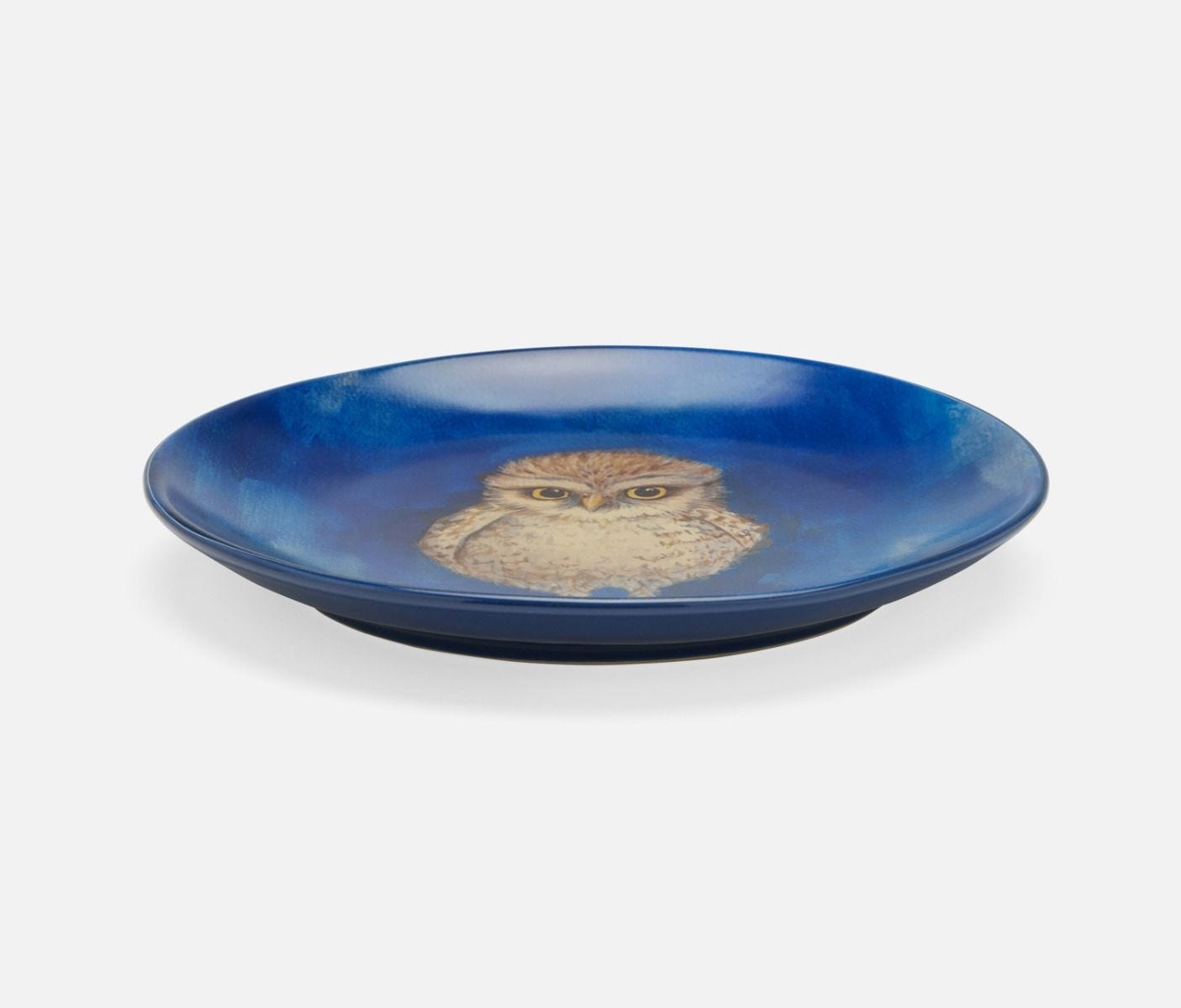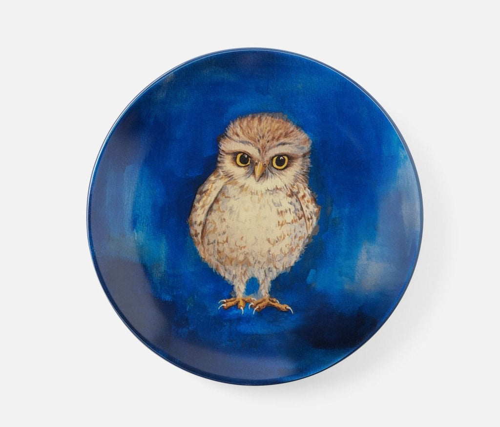 - Set of four stoneware salad/dessert plates each with a different expressive owl design against an ethereal inky blue background