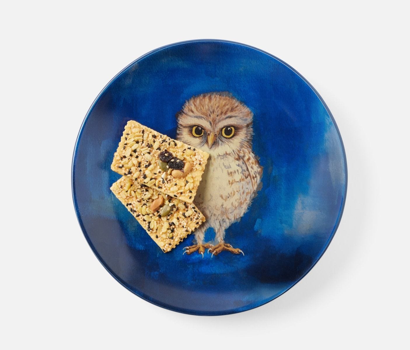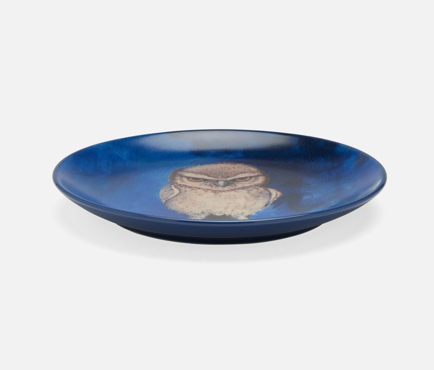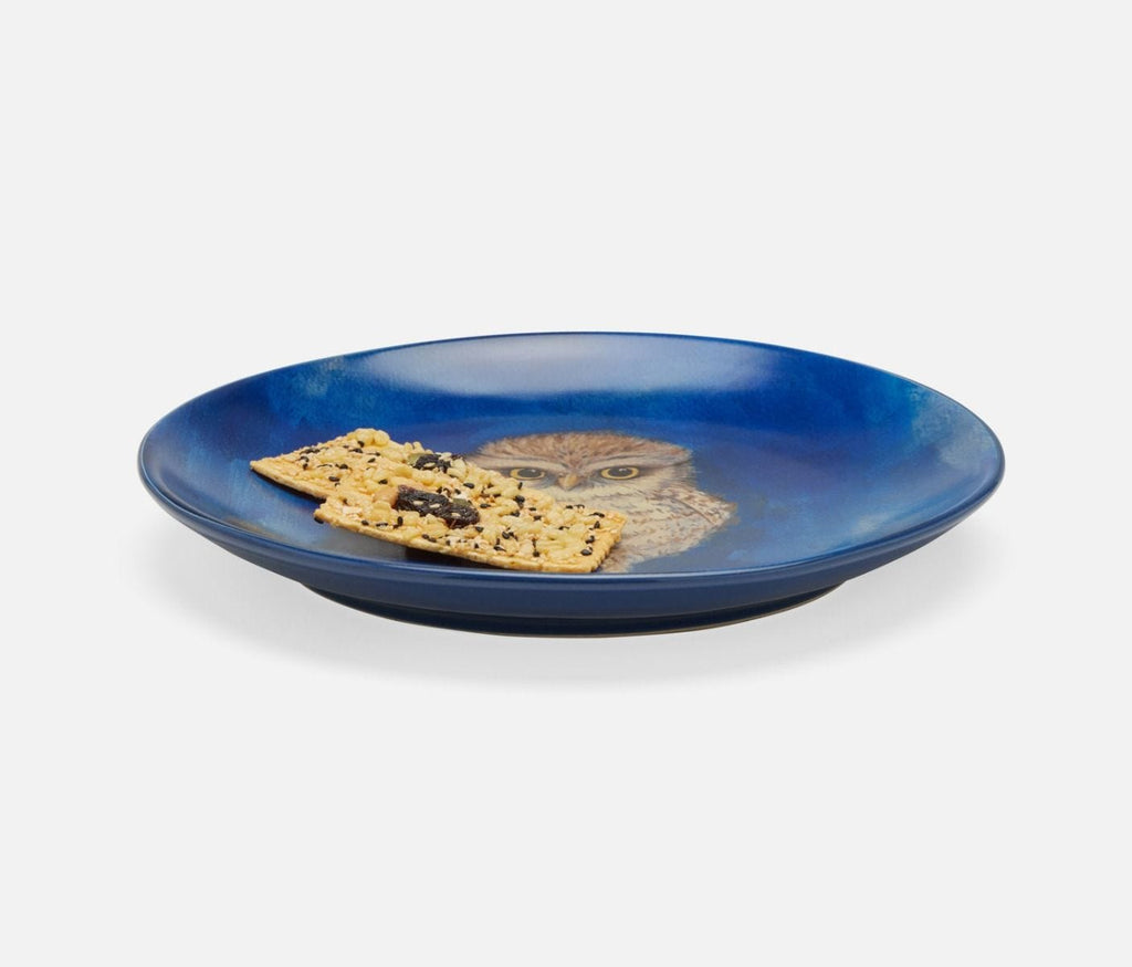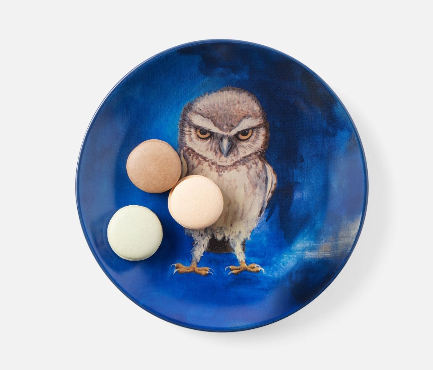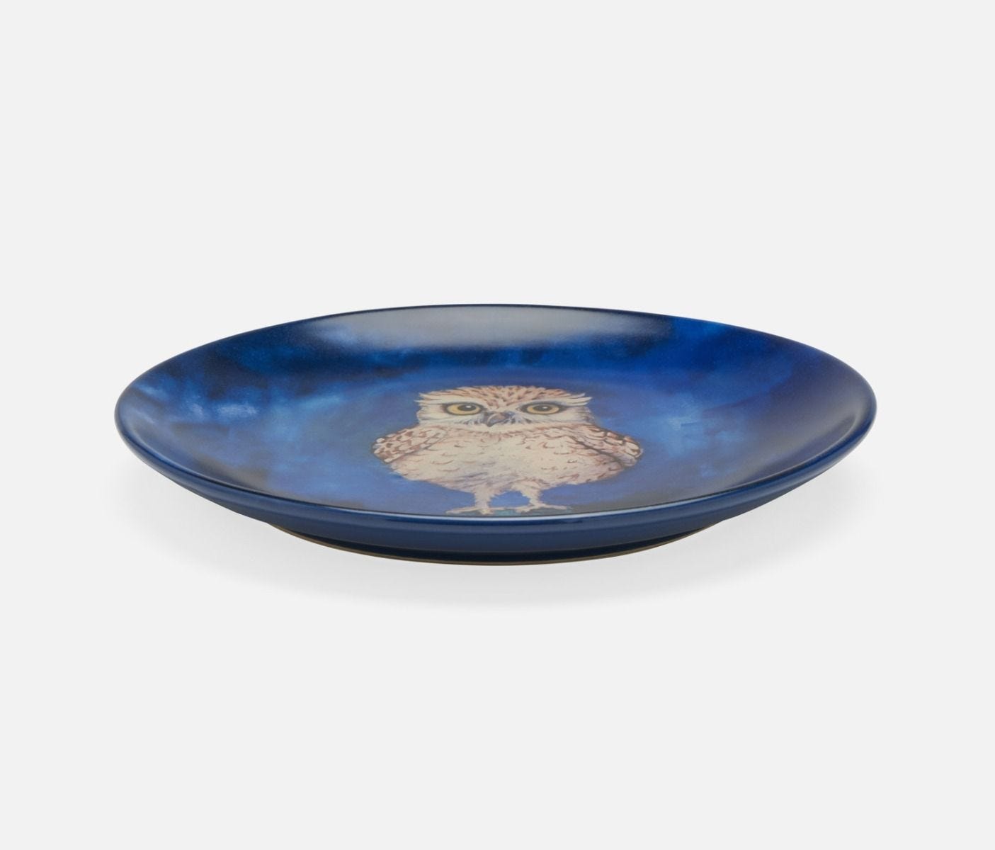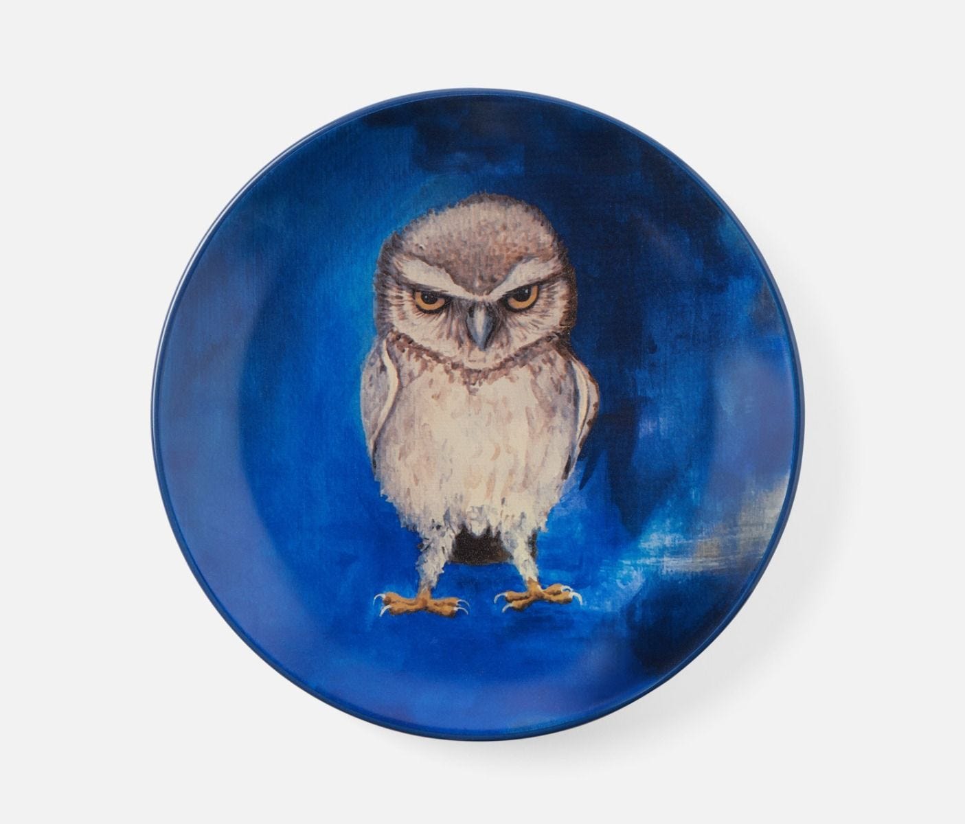 - Set of four stoneware salad/dessert plates each with a different expressive owl design against an ethereal inky blue background