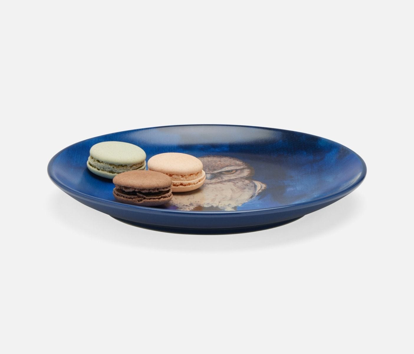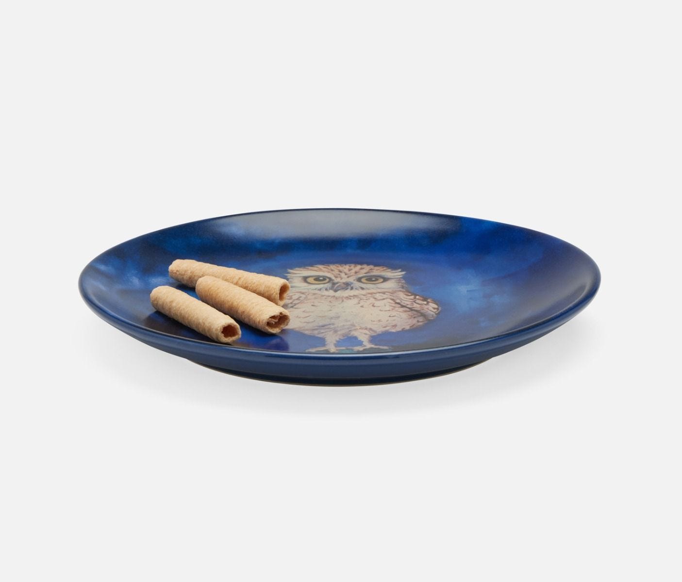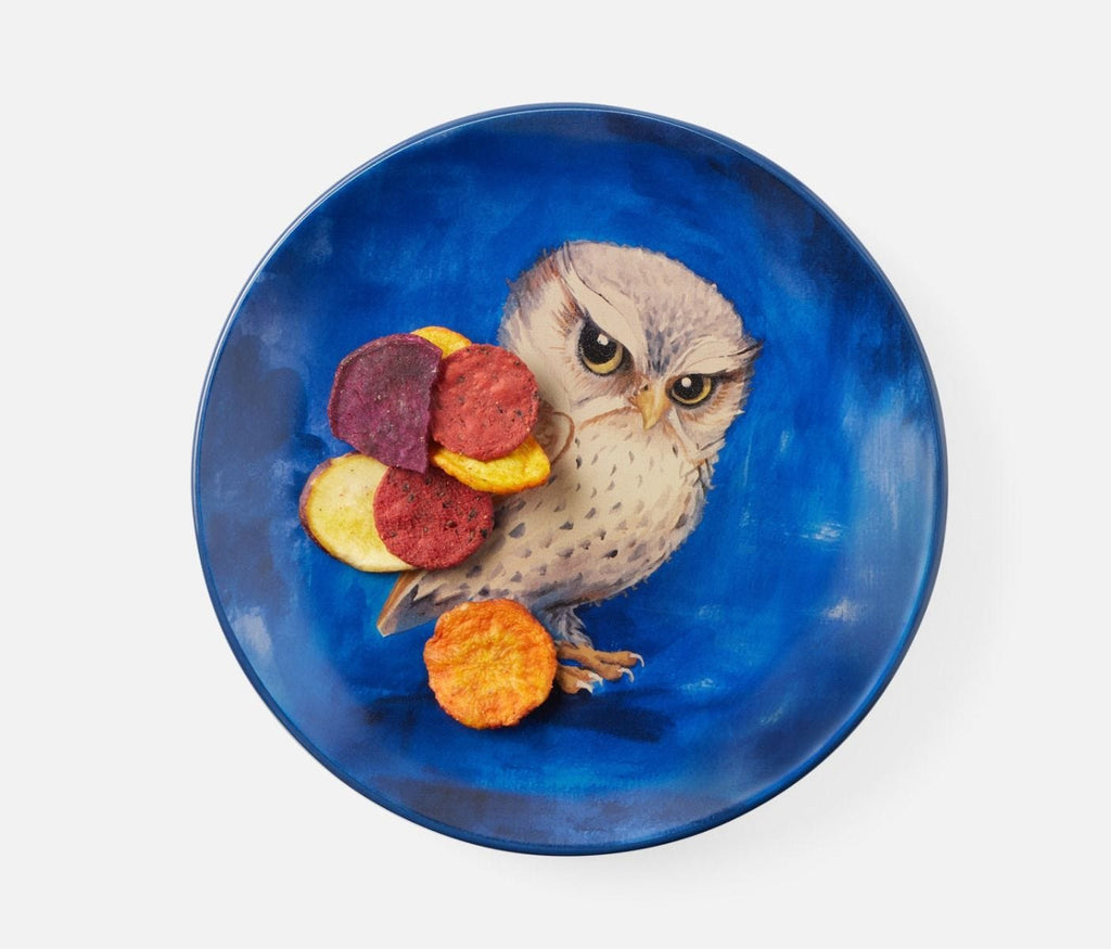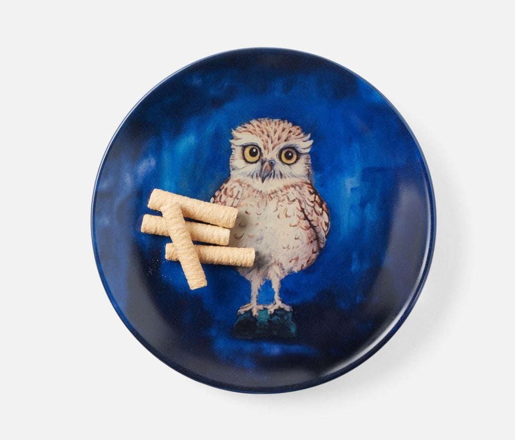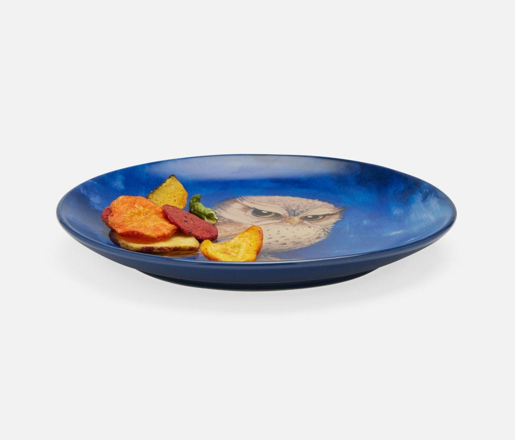 - Set of four stoneware salad/dessert plates each with a different expressive owl design against an ethereal inky blue background