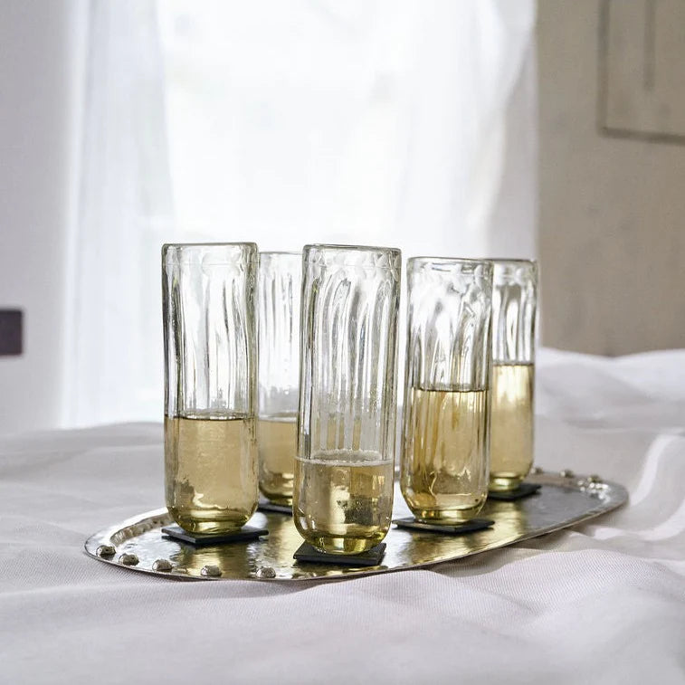 - Ribbed mouth-blown glass stemless flute etched with laurel for longevity, prosperity and friendship