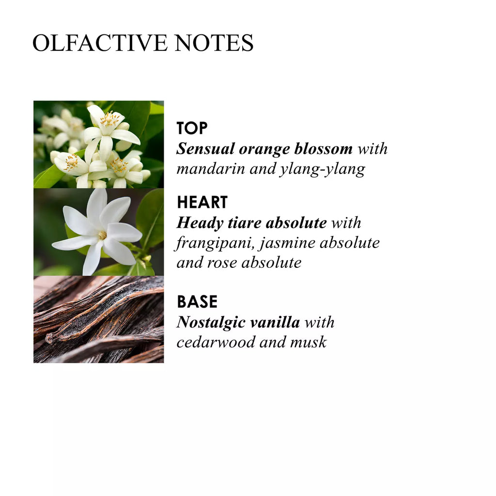 • Scent: inflorescent paradise of Tahiti, discover solar notes of orange blossom, Polynesian frangipani, vanilla and musk.