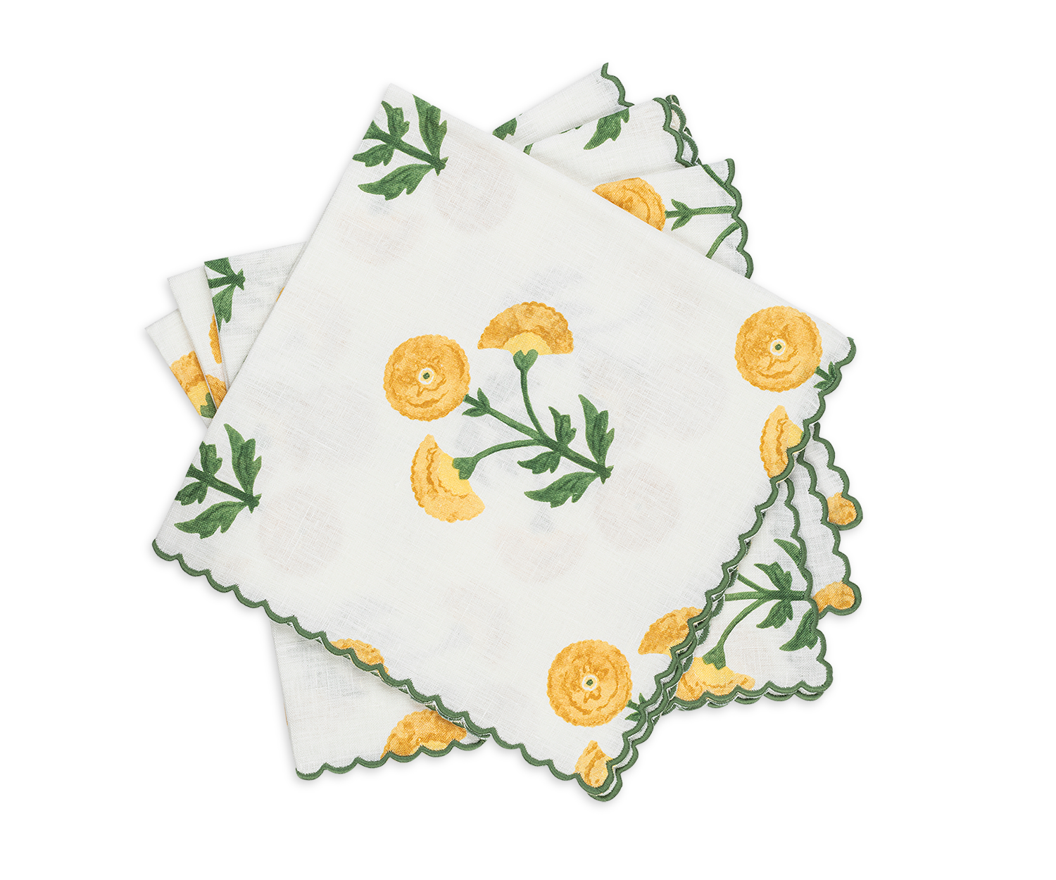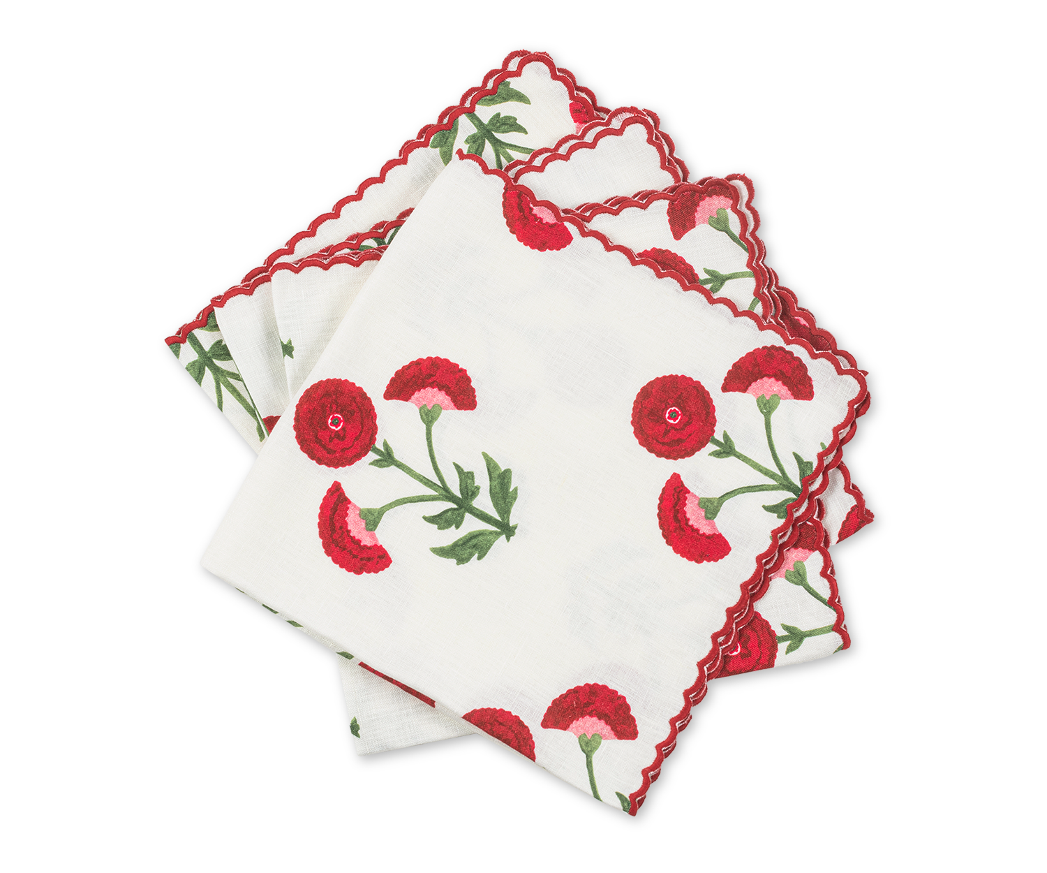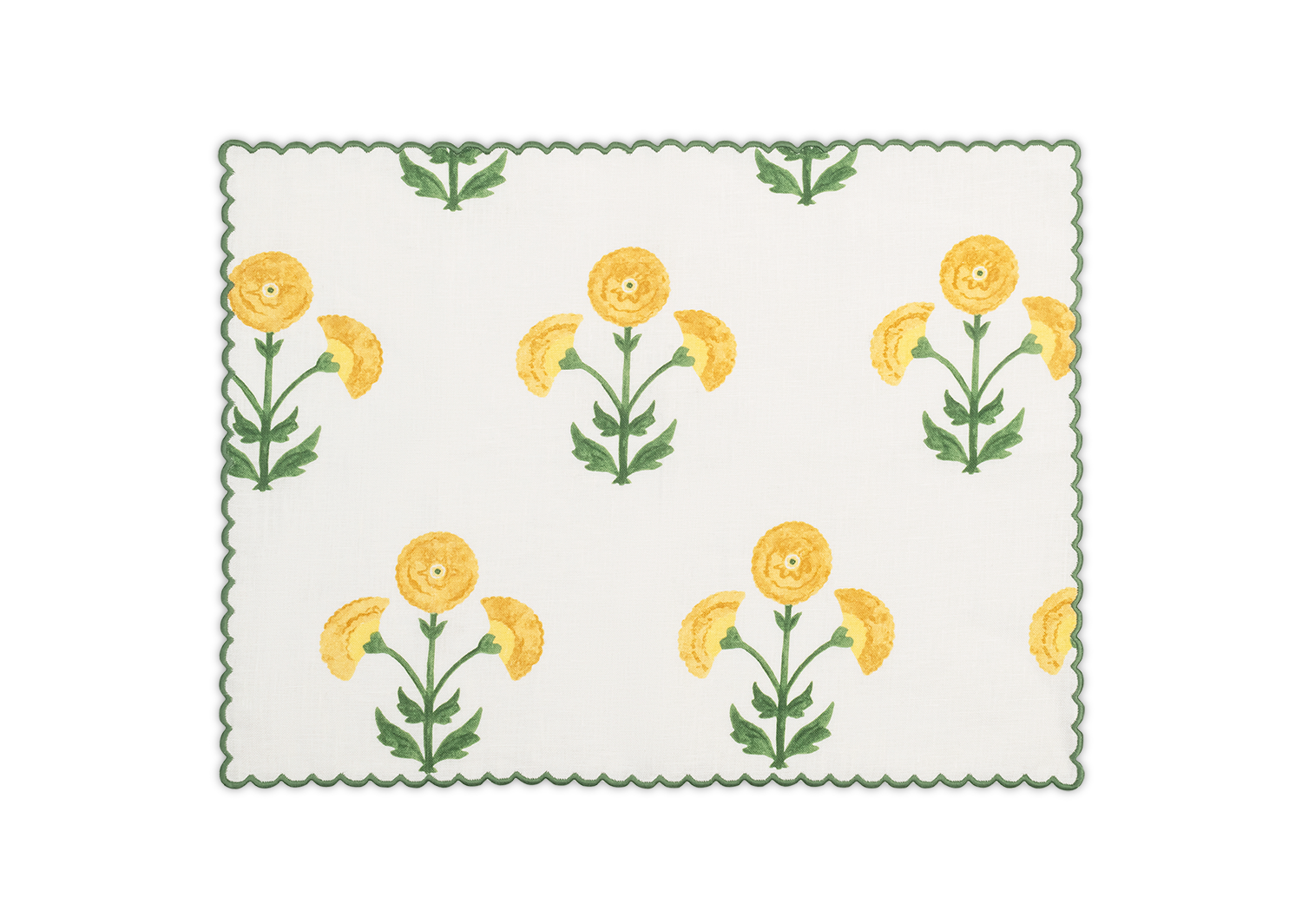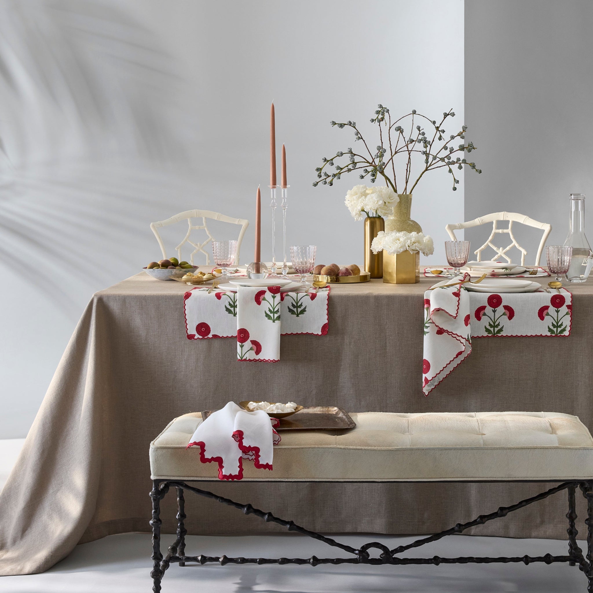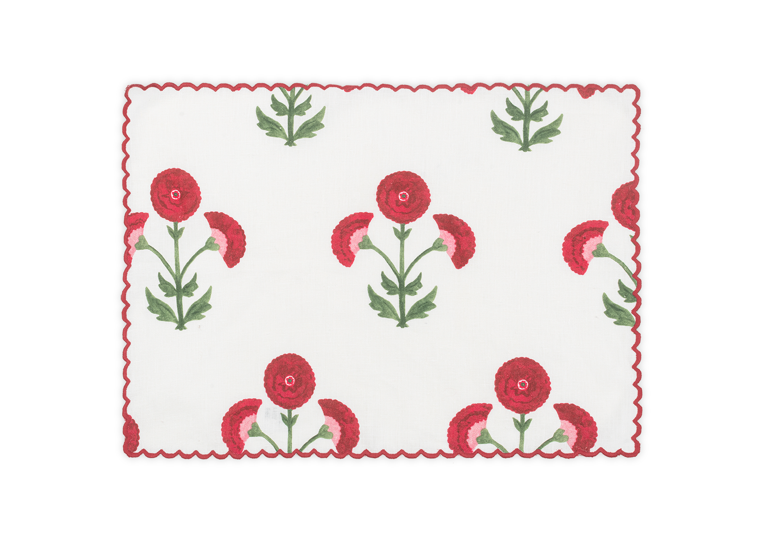 Whimsical and sophisticated. Gisele Napkins, Placemats, Tablecloths and Table Runner adds character and delight to your tablescape with beautiful bold color and artistic design. Originally a Schumacher block print, Matouk has reimagined the print on 100% linen that is finished with an intricate embroidered petite scallop.